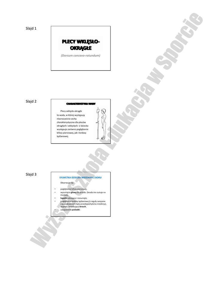 rci e Slajd 1 Sp o PLECY WKLĘSŁOOKRĄGŁE Slajd 2 CHARAKTERYSTYKA WADY zko ła Ed Plecy wklęsło-okrągłe to wada, w której występują równocześnie cechy charakterystyczne dla pleców okrągłych i wklęsłych. U dziecka występuje zarówno pogłębienie kifozy piersiowej, jak i lordozy lędźwiowej. uk ac ja w (Dorsum concavo-rotundum) Slajd 3 SYLWETKA DZIECKA WIDZIANA Z BOKU aS Obserwuje się: • • Wy ższ • • pogłębienie kifozy piersiowej, wysunięcie głowy do przodu (broda nie rzutuje na mostek), łopatki odstające i rozsunięte, pogłębienie lordozy lędźwiowej (z reguły związane z powiększeniem kąta przodopochylenia miednicy), wypięty (przodujący) brzuch, uwypuklone pośladki. • rci e Slajd 5 POSTĘPOWANIE KOREKCYJNE Towarzysząca tej wadzie dystonia mięśniowo- uk ac ja w Sp o Slajd 4 więzadłowa jest połączeniem dystonii występującej w plecach wklęsłych i okrągłych, a postępowanie korekcyjne jest sumą schematów dotyczących postępowania w przypadku wad: plecy wklęsłe Slajd 6 zko ła Ed i okrągłe. POSTĘPOWANIE KOREKCYJNE c.d. Jak we wszystkich wadach postawy również aS w przypadku pleców wklęsło-okrągłych należy przestrzegać zasad indywidualnego dostosowania do umiejscowienia i rozległości poszczególnych wygięć kręgosłupa, etiologii i stopnia zaawansowania. Wy ższ W korygowaniu pleców wklęsło - okrągłych zadanie to jest szczególnie ważne.