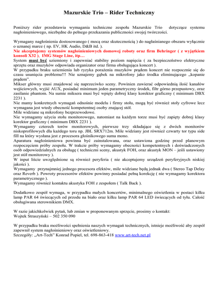 Mazurskie Trio – Rider Techniczny Poniższy rider przedstawia wymagania techniczne zespołu Mazurskie Trio dotyczące systemu nagłośnieniowego, niezbędne do pełnego przekazania publiczności swojej twórczości. Wymagany nagłośnienia dostosowanego ( mocą oraz skutecznością ) do nagłaśnianego obszaru wyłącznie o uznanej marce ( np. EV, HK Audio, D&B itd. ). Nie akceptujemy systemów nagłośnieniowych domowej roboty oraz firm Behringer ( z wyjątkiem konsoli X32 ), IMG Stage Line, itp… System musi być uziemiony i zapewniać stabilny poziom napięcia ( za bezpieczeństwo elektryczne sprzętu oraz muzyków odpowiada organizator oraz firma obsługująca koncert ). W przypadku braku uziemienia lub ryzyka porażenia muzyków prądem koncert nie rozpocznie się do czasu usunięcia problemu!!! Nie uznajemy gąbek na mikrofony jako środka eliminującego „kopanie prądem”. Mikser główny musi znajdować się naprzeciwko sceny. Powinien zawierać odpowiednią ilość kanałów wejściowych, wyjść AUX, posiadać minimum jeden parametryczny środek, filtr górno przepustowy, oraz zasilanie phantom. Na sumie miksera musi być wpięty dobrej klasy korektor graficzny ( minimum DBX 2231 ). Nie mamy konkretnych wymagań odnośnie modelu i firmy stołu, mogą być również stoły cyfrowe lecz wymagana jest wtedy obecność kompetentnej osoby znającej stół. Mile widziane są mikrofony bezprzewodowe. Nie wymagamy użycia stołu monitorowego, natomiast na każdym torze musi być zapięty dobrej klasy korektor graficzny ( minimum DBX 2231 ). Wymagamy czterech torów monitorowych, pierwsze trzy składające się z dwóch monitorów niskoprofilowych dla każdego toru np. JBL SRX712m. Mile widziany jest również czwarty tor typu side fill na który wysłana jest z procesora głośnikowego suma mono. Aparatura nagłośnieniowa powinna być zainstalowana, oraz ustawiona godzinę przed planowym rozpoczęciem próby zespołu. W trakcie próby wymagamy obecności kompetentnych i doświadczonych osób odpowiedzialnych za obsługę ( techniczni sceny, akustyk FOH, oraz akustyk MON – jeśli ustawiony jest stół monitorowy ). W input liście uwzględnione są również peryferia ( nie akceptujemy urządzeń peryferyjnych niskiej jakości ). Wymagamy przynajmniej jednego procesora efektów, mile widziane będą jednak dwa ( Stereo Tap Delay oraz Reverb ). Powroty procesorów efektów powinny posiadać pełną korekcję ( nie wymagamy korektora parametrycznego ). Wymagamy również kontaktu akustyka FOH z zespołem ( Talk Back ). Dodatkowo zespół wymaga, w przypadku małych koncertów, minimalnego oświetlenia w postaci kilku lamp PAR 64 świecących od przodu na biało oraz kilku lamp PAR 64 LED świecących od tyłu. Całość obsługiwana sterownikiem DMX. W razie jakichkolwiek pytań, lub zmian w proponowanym sprzęcie, prosimy o kontakt: Wojtek Straszyński – 502 350 090 W przypadku braku możliwości spełnienia naszych wymagań technicznych, istnieje możliwość aby zespół zapewnił system nagłośnieniowy oraz oświetleniowy. Szczegóły: „Art-Tech” Konrad Popiel, tel. 698-863-418 www.art-tech.net.pl Input List L.P. 1 2 3 4 5 Instrument Voc Voc Git L Git R Skrzypce Proponowany mikrofon Shure Beta58 ( własny ) Shure Beta58 ( własny ) Di-Box Di-Box XLR Stage Plan Insert Compressor Compressor Compressor Compressor