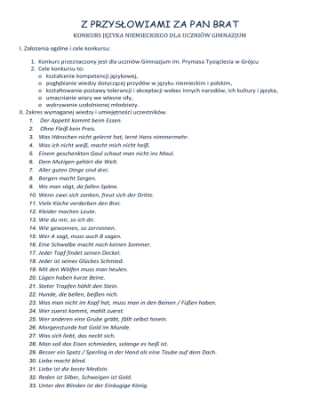 Z PRZYSŁOWIAMI ZA PAN BRAT KONKURS JĘZYKA NIEMIECKIEGO DLA UCZNIÓW GIMNAZJUM I. Założenia ogólne i cele konkursu: 1. Konkurs przeznaczony jest dla uczniów Gimnazjum im. Prymasa Tysiąclecia w Grójcu 2. Cele konkursu to: o kształcenie kompetencji językowej, o pogłębianie wiedzy dotyczącej przysłów w języku niemieckim i polskim, o kształtowanie postawy tolerancji i akceptacji wobec innych narodów, ich kultury i języka, o umacnianie wiary we własne siły, o wykrywanie uzdolnionej młodzieży. II. Zakres wymaganej wiedzy i umiejętności uczestników. 1. Der Appetit kommt beim Essen. 2. Ohne Fleiß kein Preis. 3. Was Hänschen nicht gelernt hat, lernt Hans nimmermehr. 4. Was ich nicht weiß, macht mich nicht heiß. 5. Einem geschenkten Gaul schaut man nicht ins Maul. 6. Dem Mutigen gehört die Welt. 7. Aller guten Dinge sind drei. 8. Borgen macht Sorgen. 9. Wo man sägt, da fallen Späne. 10. Wenn zwei sich zanken, freut sich der Dritte. 11. Viele Köche verderben den Brei. 12. Kleider machen Leute. 13. Wie du mir, so ich dir. 14. Wie gewonnen, so zerronnen. 15. Wer A sagt, muss auch B sagen. 16. Eine Schwalbe macht noch keinen Sommer. 17. Jeder Topf findet seinen Deckel. 18. Jeder ist seines Glückes Schmied. 19. Mit den Wölfen muss man heulen. 20. Lügen haben kurze Beine. 21. Steter Tropfen höhlt den Stein. 22. Hunde, die bellen, beißen nich. 23. Was man nicht im Kopf hat, muss man in den Beinen / Füßen haben. 24. Wer zuerst kommt, mahlt zuerst. 25. Wer anderen eine Grube gräbt, fällt selbst hinein. 26. Morgenstunde hat Gold im Munde. 27. Was sich liebt, das neckt sich. 28. Man soll das Eisen schmieden, solange es heiß ist. 29. Besser ein Spatz / Sperling in der Hand als eine Taube auf dem Dach. 30. Liebe macht blind. 31. Liebe ist die beste Medizin. 32. Reden ist Silber, Schweigen ist Gold. 33. Unter den Blinden ist der Einäugige König. 34. Das böse Gewissen verrät sich selbst. 35. Wissen ist Macht. 36. Man soll den Tag nicht vor dem Abend loben. 37. Kein Rauch ohne Feuer. 38. Der Brei wird nicht so heiß gegessen, wie er gekocht ist. 39. Es ist nicht alles Gold, was glänzt. 40. Der Apfel fällt nicht weit vom Stamm. 41. Ein Unglück kommt selten Allen. 42. Gelegenheit macht Diebe. 43. Auge um Auge, Zahn um Zahn. 44. Not macht erfinderisch. 45. Freunde erkennt man in der Not. 46. Gegensätze ziehen sich an. 47. Liebe geht durch den Magen . 48. Eile mit Weile. 49. Alte Liebe rostet nich. 50. Die Furcht hat große Augen. 51. Dem Glücklichen schlägt keine Stunde. 52. Die Wände haben Ohren. 53. Lachen ist gesund. 54. Ein Ertrinkender greift nach einem Strohhalm. 55. Auch ein blindes Huhn findet ein Korn. 56. Man muss das Eisen schmieden, solange es heiß ist. 57. Ein gesunger Geist in einem gesunden Körper. 58. Jeder ist Herr in seinem Hause. 59. Ost und West daheim das Best. 60. Alle Wege führen nach Rom. III. Literatura podstawowa: WWW.duden.de WWW.pons.eu IV. Regulamin konkursu: 1. W konkursie może wziąć udział uczeń Gimnazjum im. Prymasa Tysiąclecia 2. Uczestnictwo w konkursie jest dobrowolne. Kandydatów należy zgłaszać do dn. 5 stycznia 2016. 3. Konkurs rozpoczyna się dn. 12 stycznia 2016 o godz. 14:25 i trwa 60 minut. 4. Konkurs polega na wypełnieniu testu składającego się z trzech części: Część pierwsza: uzupełnianie brakujących wyrazów w podanych idiomach. Część druga: Poprawianie błędów w podanych idiomach (część będzie prawidłowa). Część trzecia: Tłumaczenia idiomów z języka niemieckiego na polski i odwrotnie. 5. Wyniki zostaną ogłoszone 15 stycznia 2016. 6. Dodatkowe informacje można uzyskać u opiekuna konkursu p. Mileny Witkowskiej lub innych nauczycieli języka niemieckiego. Zapraszamy do wzięcia udziału w naszym konkursie !!!