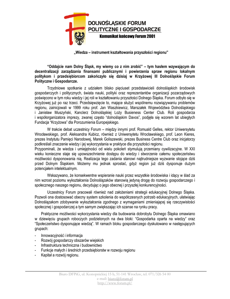 Komunikat końcowy Forum 2001 „Wiedza – instrument kształtowania przyszłości regionu” “Oddajcie nam Dolny Śląsk, my wiemy co z nim zrobić” – tym hasłem wzywającym do decentralizacji zarządzania finansami publicznymi i powierzenia spraw regionu lokalnym politykom i przedsiębiorcom zakończyło się dzisiaj w Krzyżowej III Dolnośląskie Forum Polityczne i Gospodarcze. Trzydniowe spotkanie z udziałem blisko pięciuset przedstawicieli dolnośląskich środowisk gospodarczych i politycznych, świata nauki, polityki oraz reprezentantów organizacji pozarządowych poświęcono w tym roku wiedzy i jej roli w kształtowaniu przyszłości Dolnego Śląska. Forum odbyło się w Krzyżowej już po raz trzeci. Przedsięwzięcie to, mające służyć wspólnemu rozwiązywaniu problemów regionu, zainicjowali w 1999 roku prof. Jan Waszkiewicz, Marszałek Województwa Dolnośląskiego i Janisław Muszyński, Kanclerz Dolnośląskiej Loży Busieness Center Club. Roli gospodarza i współorganizatora imprezy, zwanej często “dolnośląskim Davos”, podjęła się wzorem lat ubiegłych Fundacja “Krzyżowa” dla Porozumienia Europejskiego. W trakcie debat uczestnicy Forum – między innymi prof. Romuald Gelles, rektor Uniwersytetu Wrocławskiego, prof. Aleksandra Kubicz, również z Uniwersytetu Wrocławskiego, prof. Leon Kieres, prezes Instytutu Pamięci Narodowej, Marek Goliszewski, prezes Business Centre Club oraz inicjatorzy podkreślali znaczenie wiedzy i jej wykorzystania w praktyce dla przyszłości regionu. Przypominali, że wiedza i umiejętności od wielu pokoleń stymulują przemiany cywilizacyjne. W XXI wieku konieczne staje się upowszechnienie dostępu do wiedzy i stworzenie całemu społeczeństwu możliwości dysponowania nią. Realizacja tego zadania stanowi najtrudniejsze wyzwanie stojące dziś przed Dolnym Śląskiem. Możemy mu jednak sprostać, gdyż region już dziś dysponuje dużym potencjałem intelektualnym. Wskazywano, że konsekwentne wspieranie nauki przez wszystkie środowiska i idący w ślad za nim wzrost poziomu wykształcenia Dolnoślązaków stanowią jedyną drogę do rozwoju gospodarczego i społecznego naszego regionu, decydując o jego obecnej i przyszłej konkurencyjności. Uczestnicy Forum pracowali również nad założeniami strategii edukacyjnej Dolnego Śląska. Pozwoli ona dostosować obecny system szkolenia do współczesnych potrzeb edukacyjnych, ułatwiając Dolnoślązakom zdobywanie wykształcenia zgodnego z wymaganiami zmieniającej się rzeczywistości społecznej i gospodarczej a tym samym zwiększając ich szanse na rynku pracy. Praktyczne możliwości wykorzystania wiedzy dla budowania dobrobytu Dolnego Śląska omawiano w dziewięciu grupach roboczych podzielonych na dwa bloki: “Gospodarka oparta na wiedzy” oraz “Społeczeństwo dysponujące wiedzą”. W ramach bloku gospodarczego dyskutowano w następujących grupach: - Innowacyjność i informacja Rozwój gospodarczy obszarów wiejskich Infrastruktura techniczna i budownictwo Funkcje małych i średnich przedsiębiorstw w rozwoju regionu Kapitał a rozwój regionu. Biuro DFPiG, ul. Konopnickiej 15 b, 51-141 Wrocław, tel. 071/326 54 00 e-mail: [email protected] http://www.forum.pl/ Komunikat końcowy Forum 2001 Blok społeczny natomiast objął następujące grupy zagadnień: - Startegia edukacyjna Dolnego Śląska Ochrona zdrowia – gałęzią gospodarki Turystyka w regionie Miejsce organizacji pozarządowych w społeczeństwie dysponującym wiedzą. Po raz pierwszy w historii Forum wszystkie grupy te zawiązały się na wiele miesięcy przed obradami w Krzyżowej, przyjeżdżając na spotkanie z gotowymi pomysłami. Grupy robocze spisały materiały ze swych obrad grup w formie osobnych dokumentów. Uczestnicy debaty gospodarczej podkreślali ścisły związek pomiędzy jakością i nowoczesnością zarządzania przedsiębiorstwem a sytuacją finansową firmy. Podkreślano, że wiedza to zbiór doświadczeń, obecna jest nie tylko na uczelniach, ale także w firmach. Firmy, które nie doskonalą się, nie są innowacyjne i otwarte na zmiany, nie wytrzymują konkurencji i wypadają z rynku. Zgodzono się, że wiedza to także przepływ informacji, na przykład o planowanych projektach inwestycyjnych. Komunikację tę postanowiono usprawnić. Ważnym wątkiem dyskusji stały się małe i średnie przedsiębiorstwa, podmioty wywiarające duży wpływ na rozwój całego regionu. Postulowano wsparcie tego sektora w uzyskiwaniu dofinansowania ze źródeł europejskich. Przedsiębiorcy i przedstawiciele władz samorządowych współdziałać będą w tej sprawie z dolnośląskimi parlamentarzystami. Uczestnicy debaty społecznej podkreślali konieczność ustawicznego podnoszenia kwalifikacji przez wszystkich, także elity regionu, w tym osoby zarządzające służbą zdrowia, edukacją na wszystkich poziomach czy turystyką. Bez ciągłego samokształcenia kadr trudno bowiem o zrozumienie istoty przemian gospodarczych i dopasowanie się do wymagań wolnego rynku. Postulowano uznanie edukacji, turystyki i służby zdrowia za ważne dziedziny gospodarki. Zwrócono uwagę na rosnącą rolę instytucji pozarządowych w kształtowaniu przyszłości Dolnego Śląska. Celem ułatwienia współpracy z III sektorem w regionie Stowarzyszenie na Rzecz Promocji Dolnego Śląska i Fundacja “Krzyżowa” dla Porozumienia Europejskiego postanowiły do kolejnego Forum przygotować internetową bazę danych o organizacjach pozarządowych na Dolnym Śląsku oraz zasady certyfikacji takich instytucji. Tegoroczne Forum w Krzyżowej stało się okazją nie tylko do zgłaszania konkretnych pomysłów na przyszłość, ale także do przypomnienia wymiernych efektów zeszłorocznego spotkania. Do sukcesów zeszłorocznego Forum należy między innymi wcielona już w życie idea Dolnośląskiego Certyfikatu Gospodarczego – odznaczenia dla wzorowych firm dolnośląskich. Dwunastu laur