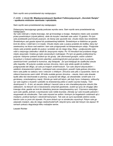 Sam wyrób sera przedstawiał się następująco: Z ulotki z okazji 66. Międzynarodowych Spotkań Folklorystycznych „Gorolski Święto” - spotkania mistrzów rzemiosła i rękodzieła. Sam wyrób sera przedstawiał się następująco: Zobaczymy baczującego gazdę podczas wyrobu sera. Sam wyrób sera przedstawiał się następująco: Syr szie robił jak z mlyka łowczigo, tak aji krowskigo a kozigo. Nadojóne mlyko szie scedziło przez powiónzkym (ciynki płótno), sloło do koryta i niechało szie ustoć 12 godzin. Po tym szie podstawiło pod koryto putyrym, do kierej szie spuściło tzw. chude mlyko bez śmietónki. Śmietónkym zaś gazda slywoł do podstawiónej łobłóńki. Śmietónkym w łobłóńce se gazda broł do dómu i robili tam ś ni masło. Chude mlyko szie z putyry przeloło do kotlika, kiery był zawieszóny na kluce nad watróm i tam szie przigrzywało na temperaturym udoju. Przigrzote mlyko szie przeloło spatki do putyry i przidało sie do niego klog. Klog – podpuszczka szie robił z cielyncigo żołóndka i słóżił do zesyrzynio mlyka. Po 15 minutach łod przidanio klogu mlyko zesyrzało i trzeba go było czoszczkym roztrzepać. Po tym se gazda prziklynknył ku putyrze i łobiyma rynkami ściskoł syr do grudy. Jak uformowoł grudym, wźión czistóm buzarkym z trokami (płóciynnóm płachte), podcióngnół jóm pod grudym syra w putyrze, zawiónzoł troki i powiesił w kumorce, aby łokapoła . Ze syra łokapuje do szafliczka siwula albo kapołka. W putyrze zustała surowo żinczica, kiero szie wloła spatki do kotlika i podgrzywała tak dłógo, aż szie po krajach zrobił kożuch. Tyn szie zbiyroł zbiyraczkóm – wielkóm drzewiannóm łyżkóm, roztrzepoł szie czoszczkym, posolił i była gotowo żinczica, kiero szie jadła na sałaszu rano i wieczór z chlebym. Żinczica szie piła z czyrpoków, kiere se nikierzi łowczorze sami robili. W kotle zustała gorszo żinczica – siwula, kiero szie dowała bydłu albo też niechowała w piwnicy, w putyrze tak dłógo, aż zkwaśniała i zrobił szie ś ni gorskawy, orzeźwiajóncy napój. Górole go radzi pili latym, jak były hyca. Łokapany, półsuchy syr szie wyjóno z buzarki i położiło na drzewiannej półce w zadni czynści kolyby. Tam dozdrzywoł 3 – 6 dni, aż zaczón żółknyć i tworzić szie w nim charakterystyczne dziurki (Na sałaszach, na kierych sie w baczowaniu zmiyniali gazdowie, zustoł syr jyny do drugigo albo trzecigo dnia; gazda se broł do dziedziny jeszcze niewykwaszóny syr). Czynszcz szwiyżigo syra szie zjadła, jednak z wiynkszości szie robiła bryndza. Zdrzały syr szie krusziło palcami i wsypowało do sóndeczka. Tam szie miyszoł ze solóm i kminym (w bogatszich rodzinach aji z masłym), przikrył dynkym i obciónżił kamyniym. Tak szie ze syra wyciskała zielóno woda, kieróm szie co pore dni slywało. Po pore dniach syr w sóndeczku wyschnył. Potym szie go zalywało masłym, aby do niego niedochodził luft i dziynki tymu szie tak hónym nie zepsuł. W ramach pokazu degustacja kilku rodzajów serów. Leszek Richter