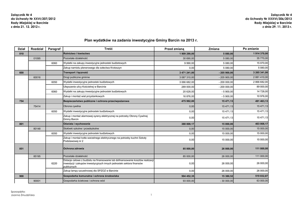 Załącznik Nr 4 do Uchwały Nr XXVI/207/2012 Rady Miejskiej w Barcinie z dnia 21. 12. 2012 r. Załącznik Nr 4 do Uchwały Nr XXXVI/306/2013 Rady Miejskiej w Barcinie z dnia 29. 11. 2013 r. Plan wydatków na zadania inwestycyjne Gminy Barcin na 2013 r. Dział Rozdział Treść Paragraf Przed zmianą Rolnictwo i łowiectwo 010 5 080,00 1 914 370,00 30 690,00 5 080,00 35 770,00 9 990,00 5 080,00 15 070,00 0,00 5 080,00 5 080,00 Transport i łączność 3 471 241,00 - 205 900,00 3 265 341,00 Drogi publiczne gminne 3 087 310,00 - 205 900,00 2 881 410,00 Wydatki inwestycyjne jednostek budżetowych 3 066 682,00 - 200 000,00 2 866 682,00 Pozostała działalność 01095 6060 Wydatki na zakupy inwestycyjne jednostek budżetowych Zakup namiotu plenerowego dla sołectwa Krotoszyn 600 60016 6050 Ulepszenie ulicy Kościelnej w Barcinie 6060 289 000,00 - 200 000,00 89 000,00 Wydatki na zakupy inwestycyjne jednostek budżetowych 20 628,00 - 5 900,00 14 728,00 Zakup i montaż wiat przystankowych 16 876,00 - 5 900,00 10 976,00 Bezpieczeństwo publiczne i ochrona przeciwpożarowa 754 75414 6050 475 992,00 15 471,13 491 463,13 Obrona cywilna 0,00 15 471,13 15 471,13 Wydatki inwestycyjne jednostek budżetowych 0,00 15 471,13 15 471,13 Zakup i montaż alarmowej syreny elektrycznej na potrzeby Obrony Cywilnej Gminy Barcin 0,00 15 471,13 15 471,13 Oświata i wychowanie 801 80148 6050 851 85195 6220 900 90001 Sporządziła: Joanna Żmudzińska Po zmianie Zmiana 1 909 290,00 388 008,17 15 000,00 403 008,17 Stołówki szkolne i przedszkolne 0,00 15 000,00 15 000,00 Wydatki inwestycyjne jednostek budżetowych 0,00 15 000,00 15 000,00 Zakup i montaż kotła warzelnego elektrycznego na potrzeby kuchni Szkoły Podstawowej nr 2 0,00 15 000,00 15 000,00 Ochrona zdrowia 85 000,00 26 000,00 111 000,00 Pozostała działalność 85 000,00 26 000,00 111 000,00 Dotacje celowe z budżetu na finansowanie lub dofinansowanie kosztów realizacji inwestycji i zakupów inwestycyjnych innych jednostek sektora finansów publicznych 0,00 26 000,00 26 000,00 Zakup lampy szczelinowej dla SPZOZ w Barcinie 0,00 26 000,00 26 000,00 Gospodarka komunalna i ochrona środowiska 504 452,35 15 380,52 519 832,87 93 000,00 - 30 000,00 63 000,00 Gospodarka ściekowa i ochrona wód 1 Załącznik Nr 4 do Uchwały Nr XXVI/207/2012 Rady Miejskiej w Barcinie z dnia 21. 12. 2012 r. Dział Rozdział Załącznik Nr 4 do Uchwały Nr XXXVI/306/2013 Rady Miejskiej w Barcinie z dnia 29. 11. 2013 r. Treść Paragraf 6050 90095 6050 Przed zmianą 42 000,00 - 30 000,00 Budowa przyłączy kanalizacyjnych do budynków gminnych 10 000,00 - 10 000,00 0,00 Odwodnienie ul. Prusa w kierunku ul. Reymonta w Barcinie 20 000,00 - 16 000,00 4 000,00 Wykonanie projektu sieci wodociągowej wraz z przykanalikami dla działek nr 128/1-128/17 w miejscowości Kania 12 000,00 - 4 000,00 8 000,00 Pozostała działalność 188 152,35 45 380,52 233 532,87 Wydatki inwestycyjne jednostek budżetowych 173 152,35 60 380,52 233 532,87 0,00 40 000,00 40 000,00 Wykonanie ogrodzenia świetlicy wiejskiej w Mamliczu 12 342,00 - 2 312,00 10 030,00 Zagospodarowanie terenu przy świetlicy wiejskiej w Kani 11 658,00 - 2 307,48 9 350,52 116 000,00 25 000,00 141 000,00 Wydatki na zakupy inwestycyjne jednostek budżetowych 15 000,00 - 15 000,00 0,00 Wymiana pieca centralnego ogrzewania w świetlicy wiejskiej w miejscowości Barcin Wieś 15 000,00 - 15 000,00 0,00 Przebudowa kotłowni w budynku świetlicy wiejskiej w Barcinie Wsi Zmiana sposobu użytkowania lokalu z przebudową na mieszkanie chronione z przeznaczeniem dla osób niepełnosprawnych (lokal po byłej bibliotece w Piechcinie) 6060 Kultura i ochrona dziedzictwa narodowego 921 92109 6050 926 92601 6050 12 000,00 899 000,00 - 12 000,00 887 000,00 Domy i ośrodki kultury, świetlice i kluby 30 000,00 - 12 000,00 18 000,00 Wydatki inwestycyjne jednostek budżetowych 30 000,00 - 12 000,00 18 000,00 Przekształcenie systemu ogrzewania w świetlicy w Kani 30 000,00 - 12 000,00 18 000,00 Kultura fizyczna 2 769 125,50 - 2 318 975,00 450 150,50 Obiekty sportowe 2 769 125,50 - 2 318 975,00 450 150,50 Wydatki inwestycyjne jednostek budżetowych 2 769 125,50 - 2 318 975,00 450 150,50 Budowa boiska sportowego w sołectwie Józefinka 3 000,00 - 675,00 2 325,00 Budowa boiska sportowego w sołectwie Krotoszyn 12 287,00 - 1 300,00 10 987,00 2 605 248,00 - 2 300 000,00 305 248,00 40 000,00 - 17 000,00 23 000,00 10 678 809,02 - 2 459 943,35 8 218 865,67 Budowa stadionu z zapleczem i urządzeniami terenowymi Zagospodarowanie terenu przy stanicy żeglarskiej "Neptun" wraz z infrastrukturą towarzyszącą Razem Sporządziła: Joanna Żmudzińska Po zmianie Zmiana Wydatki inwestycyjne jednostek budżetowych 2
