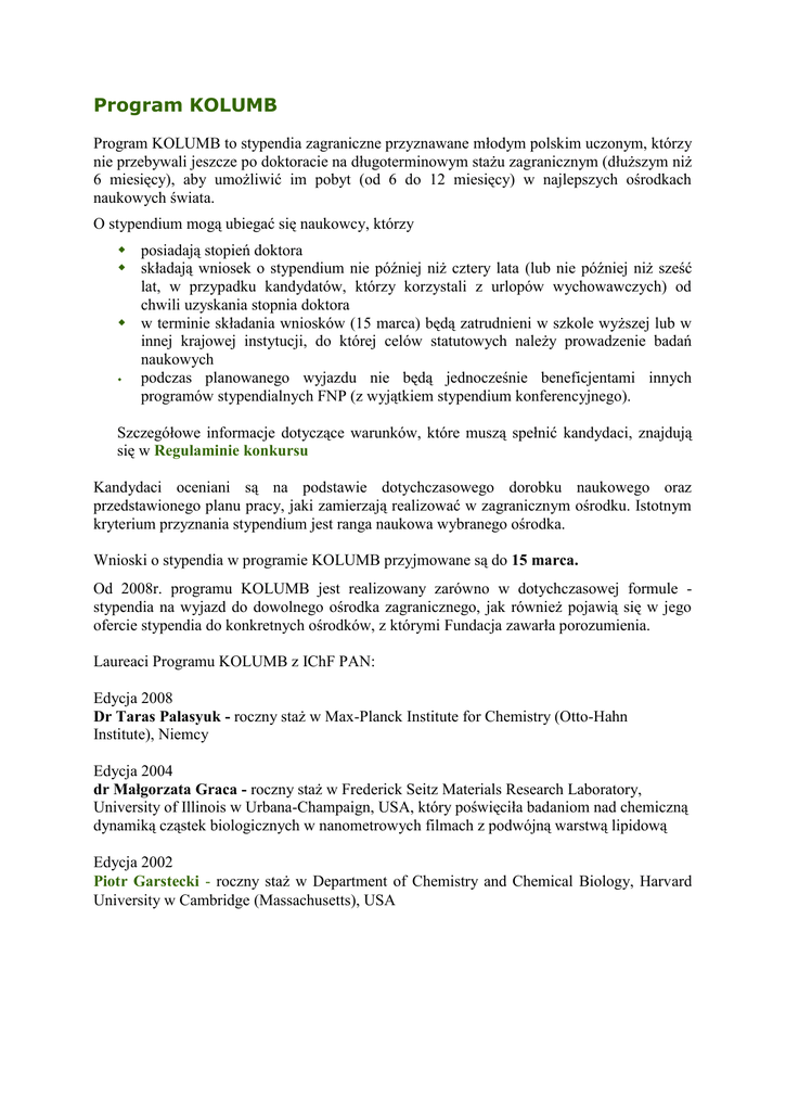 Program KOLUMB Program KOLUMB to stypendia zagraniczne przyznawane młodym polskim uczonym, którzy nie przebywali jeszcze po doktoracie na długoterminowym stażu zagranicznym (dłuższym niż 6 miesięcy), aby umożliwić im pobyt (od 6 do 12 miesięcy) w najlepszych ośrodkach naukowych świata. O stypendium mogą ubiegać się naukowcy, którzy posiadają stopień doktora składają wniosek o stypendium nie później niż cztery lata (lub nie później niż sześć lat, w przypadku kandydatów, którzy korzystali z urlopów wychowawczych) od chwili uzyskania stopnia doktora w terminie składania wniosków (15 marca) będą zatrudnieni w szkole wyższej lub w innej krajowej instytucji, do której celów statutowych należy prowadzenie badań naukowych podczas planowanego wyjazdu nie będą jednocześnie beneficjentami innych programów stypendialnych FNP (z wyjątkiem stypendium konferencyjnego). Szczegółowe informacje dotyczące warunków, które muszą spełnić kandydaci, znajdują się w Regulaminie konkursu Kandydaci oceniani są na podstawie dotychczasowego dorobku naukowego oraz przedstawionego planu pracy, jaki zamierzają realizować w zagranicznym ośrodku. Istotnym kryterium przyznania stypendium jest ranga naukowa wybranego ośrodka. Wnioski o stypendia w programie KOLUMB przyjmowane są do 15 marca. Od 2008r. programu KOLUMB jest realizowany zarówno w dotychczasowej formule stypendia na wyjazd do dowolnego ośrodka zagranicznego, jak również pojawią się w jego ofercie stypendia do konkretnych ośrodków, z którymi Fundacja zawarła porozumienia. Laureaci Programu KOLUMB z IChF PAN: Edycja 2008 Dr Taras Palasyuk - roczny staż w Max-Planck Institute for Chemistry (Otto-Hahn Institute), Niemcy Edycja 2004 dr Małgorzata Graca - roczny staż w Frederick Seitz Materials Research Laboratory, University of Illinois w Urbana-Champaign, USA, który poświęciła badaniom nad chemiczną dynamiką cząstek biologicznych w nanometrowych filmach z podwójną warstwą lipidową Edycja 2002 Piotr Garstecki - roczny staż w Department of Chemistry and Chemical Biology, Harvard University w Cambridge (Massachusetts), USA