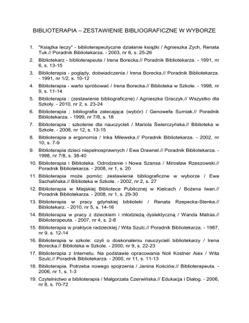 BIBLIOTERAPIA – ZESTAWIENIE BIBLIOGRAFICZNE W WYBORZE 1. "Książka leczy" - biblioterapeutyczne działanie książki / Agnieszka Zych, Renata Tuk.// Poradnik Bibliotekarza. - 2003, nr 6, s. 25-26 2. Bibliotekarz - biblioterapeuta / Irena Borecka.// Poradnik Bibliotekarza. - 1991, nr 6, s. 13-15 3. Biblioterapia - poglądy, doświadczenia / Irena Borecka.// Poradnik Bibliotekarza. - 1991, nr 1/2, s. 10-12 4. Biblioterapia - warto spróbować / Irena Borecka.// Biblioteka w Szkole. - 1998, nr 9, s. 11-14 5. Biblioterapia : (zestawienie bibliograficzne) / Agnieszka Graczyk.// Wszystko dla Szkoły. - 2010, nr 2, s. 23-24 6. Biblioterapia : bibliografia zalecająca (wybór) / Genowefa Surniak.// Poradnik Bibliotekarza. - 1999, nr 7/8, s. 18 7. Biblioterapia : szkolenie dla nauczycieli / Mariola Świerczyńska.// Biblioteka w Szkole. - 2008, nr 12, s. 13-15 8. Biblioterapia a ergonomia / Inka Milewska.// Poradnik Bibliotekarza. - 2002, nr 10, s. 7-9 9. Biblioterapia dzieci niepełnosprawnych / Ewa Drawnel.// Poradnik Bibliotekarza. 1998, nr 7/8, s. 38-40 10. Biblioterapia i Biblioteka. Odrodzenie i Nowa Szansa / Mirosław Rzeszowski.// Poradnik Bibliotekarza. - 2008, nr 1, s. 20 11. Biblioterapia może pomóc: zestawienie bibliograficzne w wyborze / Ewa Sachalińska.// Biblioteka w Szkole. - 2002, nr 2, s. 27 12. Biblioterapia w Miejskiej Bibliotece Publicznej w Kielcach / Bożena Iwan.// Poradnik Bibliotekarza. - 2008, nr 1, s. 29-30 13. Biblioterapia w pracy gdyńskiej biblioteki / Bibliotekarz. - 2010, nr 5, s. 14-16 Renata Rzepecka-Stenka.// 14. Biblioterapia w pracy z dzieckiem i młodzieżą dyslektyczną / Wanda Matras.// Biblioterapeuta. - 2007, nr 4, s. 2-8 15. Biblioterapia w praktyce radzieckiej / Wita Szulc.// Poradnik Bibliotekarza. - 1987, nr 9, s. 12-14 16. Biblioterapia w szkole: czyli o doskonaleniu nauczycieli bibliotekarzy / Irena Borecka.// Biblioteka w Szkole. - 2000, nr 9, s. 22-23 17. Biblioterapia z Internetu. Na podstawie opracowania Noli Kostner Aiex / Wita Szulc.// Poradnik Bibliotekarza. - 2000, nr 11, s. 11-13 18. Biblioterapia. Potrzeba nowego spojrzenia / Janina Kościów.// Biblioterapeuta. 2006, nr 1, s. 1-3 19. Czytelnictwo a biblioterapia / Małgorzata Czerwińska.// Edukacja i Dialog. - 2006, nr 8, s. 70-72 20. Edukacja czytelnicza a biblioterapia / Aneta Błaszczyk-Smolec.// Biblioteka w Szkole. - 2002, nr 6, s. 4-5 21. Film jako narzędzie terapeutyczne w biblioterapii / Wiktor Czernianin.// Biblioterapeuta. - 2007, nr 1, s. 1-5 22. Gabinet biblioterapeutycznt im. Ireny Boreckiej / Genowefa Surniak.// Poradnik Bibliotekarza. - 2010, nr 5, s. 28-29 23. Gabinet biblioterapeutyczny im. Biblioterapeuta. - 2009, nr 4, s. 4-5 Ireny Boreckiej / Genowefa Surniak.// 24. Kiedy muszę nauczyć się żyć - biblioterapia dzieci niepełnosprawnych intelektualnie / Lidia Ippoldt.// Poradnik Bibliotekarza. - 2009, nr 3, s. 33-37 25. Konspekt otwartych zajęć z biblioterapii dla nauczycieli / Mariola Halicka.// Biblioterapeuta. - 2006, nr 2, s. 3-4 26. Książka to drogowskaz na krętych ścieżkach życia - czyli parę słów o biblioterapii / Alicja Leśniak.// Poradnik Bibliotekarza. - 2003, nr 6, s. 10-11 27. Polskie Towarzystwo Biblioterapeutyczna już dzoała / Irena Borecka.// Poradnik Bibliotekarza. - 1998, nr 10, s. 16-18 28. Potrzeba biblioterapii w środowisku bibliotekarzy i nauczycieli - analiza badań ankietowych / Lidia Ippoldt.// Biblioterapeuta. - 2009, nr 3, s. 24-28 29. Program "Jak dobrze być razem" - wybrane scenariusze biblioterapeutycznych zajęć integracyjnych w klasie pierwszej szkoły podstawowej / Marta Franaszczuk-Truszkowska.// Wychowanie Na Co Dzień. - 2007, nr 1/2, wkładka s. I-VI 30. Program biblioterapeutyczny - oswajanie starszaków / Agata WidzowskaPasiak.// Poradnik Bibliotekarza. - 2009, nr 1, s. 34-36 31. Program biblioterapeutyczny - oswajanie straszaków / Agata WidzowskaPasiak.// Poradnik Bibliotekarza. - 2009, nr 2, s. 35-39 32. Program biblioterapeutyczny dla świetlicy pozaszkolnej / Barbara Kądziołka, Wanda Stasiuk.// Biblioterapeuta. - 2007, nr 3, s. 10-23 33. Program biblioterapii dla ucznia z nauczaniem indywidualnym / Elżbieta Jasiak.// Biblioteka w Szkole. - 2009, nr 12, s. 11-13 34. Prowadzę zajęcia z elementami biblioterapii / Joanna Walczak.// Biblioteka w Szkole. - 2004, nr 1, s. 9 35. Przeżycie estetyczne jako kluczowe pojęcie biblioterapii na przykładzie poglądów Romana Ingardena / Wiktor Czernianin.// Biblioterapeuta. - 2008, nr 1, s. 3-8 36. Scenariusz zajęć biblioterapeutycznych: "To nie chluba zgrywać samoluba!" Zajęcia psychoedukacyjne na temat dzielenia się z innymi / Małgorzata Rudnicka.// Biblioterapeuta. - 2009, nr 4, s. 12-13 37. Seminarium biblioterapeutyczne "Między słowami" Gniezno 12-13 maja 2007 r. / Lila Dorodzała-Kowalewska.// Biblioterapeuta. - 2007, nr 2, s. 20-23 38. Spotkania biblioterapeutyczne HABIBI. Terapia miłością / Robert Karwat.// Biblioterapeuta. - 2009, nr 4, s. 20-23 39. Warsztat biblioterapeuty / Maria Widerowska.// Poradnik Bibliotekarza. - 2008, nr 1, s. 34-36 40. Wykorzystanie fragmentów powieści Josteina Gaardera do tworzenia warsztatów biblioterapeutycznych / Magdalena Cyrklaff.// Wychowanie Na Co Dzień. - 2007, nr 6, wkładka s. I-III 41. Wykorzystanie poezji dziecięcej w biblioterapii na przykładzie wiersza "Rupaki" Danuty Wawiłow / Barbara Borowiec.// Nauczanie Początkowe. - 2006/2007, nr 2, s. 45-55 42. Z warsztatu biblioterapeuty / Gabriela Berke.// Biblioterapeuta. - 2009, nr 4, s. 17-20 43. Zajęcia biblioterapeutyczne : opis i analiza przypadku / Renata Zawadzka.// Biblioteka w Szkole. - 2002, nr 5, s. 16 44. Zastosowanie biblioterapii dla dzieci i młodzieży / Małgorzata Kowalska.// Biblioterapeuta. - 2009, nr 4, s. 14-17 45. Zastosowanie komputera w biblioterapii : współpraca między terapeutą i informatykiem w bibliotece dziecięco-młodzieżowej / Violetta Trella, Katarzyna Wojciechowska.// Poradnik Bibliotekarza. - 2005, nr 