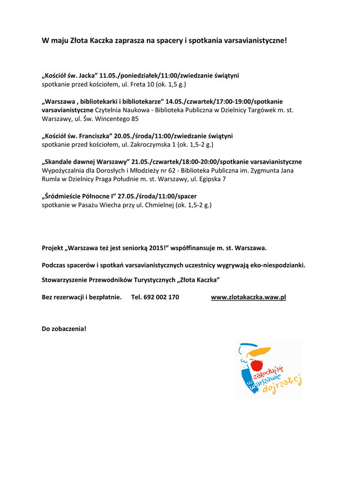 W maju Złota Kaczka zaprasza na spacery i spotkania varsavianistyczne! „Kościół św. Jacka” 11.05./poniedziałek/11:00/zwiedzanie świątyni spotkanie przed kościołem, ul. Freta 10 (ok. 1,5 g.) „Warszawa , bibliotekarki i bibliotekarze” 14.05./czwartek/17:00-19:00/spotkanie varsavianistyczne Czytelnia Naukowa - Biblioteka Publiczna w Dzielnicy Targówek m. st. Warszawy, ul. Św. Wincentego 85 „Kościół św. Franciszka” 20.05./środa/11:00/zwiedzanie świątyni spotkanie przed kościołem, ul. Zakroczymska 1 (ok. 1,5-2 g.) „Skandale dawnej Warszawy” 21.05./czwartek/18:00-20:00/spotkanie varsavianistyczne Wypożyczalnia dla Dorosłych i Młodzieży nr 62 - Biblioteka Publiczna im. Zygmunta Jana Rumla w Dzielnicy Praga Południe m. st. Warszawy, ul. Egipska 7 „Śródmieście Północne I” 27.05./środa/11:00/spacer spotkanie w Pasażu Wiecha przy ul. Chmielnej (ok. 1,5-2 g.) Projekt „Warszawa też jest seniorką 2015!” współfinansuje m. st. Warszawa. Podczas spacerów i spotkań varsavianistycznych uczestnicy wygrywają eko-niespodzianki. Stowarzyszenie Przewodników Turystycznych „Złota Kaczka” Bez rezerwacji i bezpłatnie. Do zobaczenia! Tel. 692 002 170 www.zlotakaczka.waw.pl