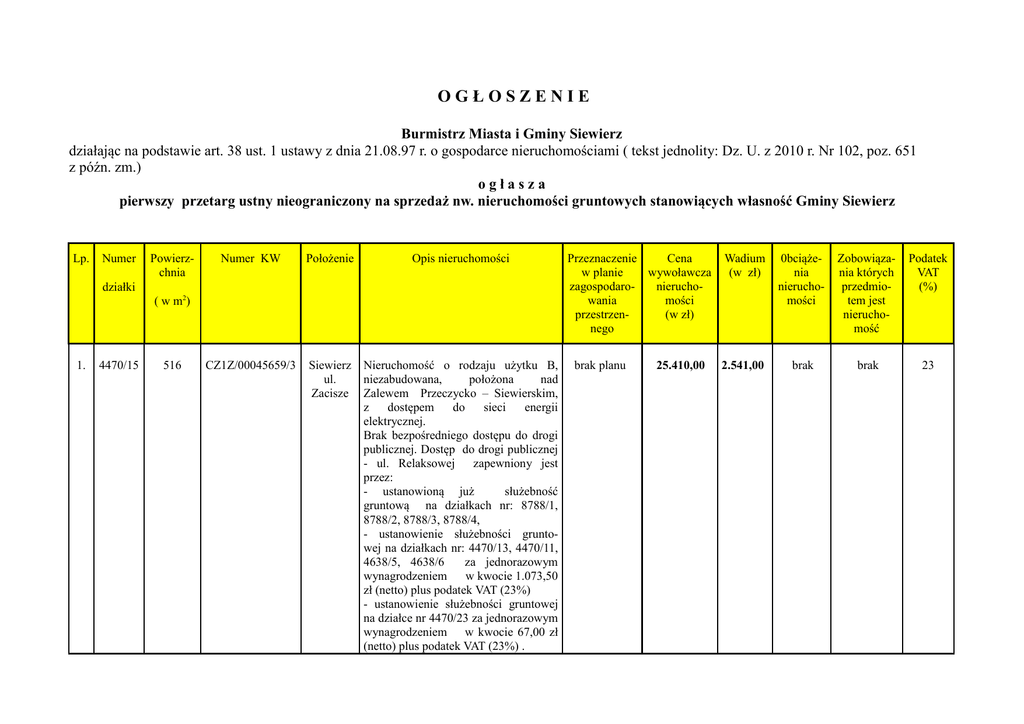 OGŁOSZENIE Burmistrz Miasta i Gminy Siewierz działając na podstawie art. 38 ust. 1 ustawy z dnia 21.08.97 r. o gospodarce nieruchomościami ( tekst jednolity: Dz. U. z 2010 r. Nr 102, poz. 651 z późn. zm.) ogłasza pierwszy przetarg ustny nieograniczony na sprzedaż nw. nieruchomości gruntowych stanowiących własność Gminy Siewierz Lp. Numer Powierzchnia Numer KW Położenie Opis nieruchomości CZ1Z/00045659/3 Siewierz ul. Zacisze Nieruchomość o rodzaju użytku B, niezabudowana, położona nad Zalewem Przeczycko – Siewierskim, z dostępem do sieci energii elektrycznej. Brak bezpośredniego dostępu do drogi publicznej. Dostęp do drogi publicznej - ul. Relaksowej zapewniony jest przez: - ustanowioną już służebność gruntową na działkach nr: 8788/1, 8788/2, 8788/3, 8788/4, - ustanowienie służebności gruntowej na działkach nr: 4470/13, 4470/11, 4638/5, 4638/6 za jednorazowym wynagrodzeniem w kwocie 1.073,50 zł (netto) plus podatek VAT (23%) - ustanowienie służebności gruntowej na działce nr 4470/23 za jednorazowym wynagrodzeniem w kwocie 67,00 zł (netto) plus podatek VAT (23%) . działki ( w m2) 1. 4470/15 516 Przeznaczenie Cena w planie wywoławcza zagospodaronieruchowania mości przestrzen(w zł) nego brak planu 25.410,00 Wadium (w zł) 0bciążenia nieruchomości Zobowiązania których przedmiotem jest nieruchomość Podatek VAT (%) 2.541,00 brak brak 23 2 4470/17 266 CZ1Z/00045659/3 Siewierz ul. Zacisze 3 4470/18 271 CZ1Z/00045659/3 Siewierz ul. Zacisze Nieruchomość o rodzaju użytku B, niezabudowana, położona nad Zalewem Przeczycko – Siewierskim, z dostępem do sieci energii elektrycznej. Brak bezpośredniego dostępu do drogi publicznej. Dostęp do drogi publicznej - ul. Relaksowej zapewniony jest przez: - ustanowioną już służebność gruntową na działkach nr: 8788/1, 8788/2, 8788/3, 8788/4, - ustanowienie służebności gruntowej na działkach nr: 4470/13, 4470/11, 4638/5, 4638/6 za jednorazowym wynagrodzeniem w kwocie 1.073,50 zł (netto) plus podatek VAT (23%), - ustanowienie służebności gruntowej na działce nr 4470/23 za jednorazowym wynagrodzeniem w kwocie 269,00 zł (netto) plus podatek VAT (23%). Nieruchomość o rodzaju użytku B, niezabudowana, położona nad Zalewem Przeczycko – Siewierskim, z dostępem do sieci energii elektrycznej. Brak bezpośredniego dostępu do drogi publicznej. Dostęp do drogi publicznej - ul. Relaksowej zapewniony jest przez: - ustanowioną już służebność gruntową na działkach nr: 8788/1, 8788/2, 8788/3, 8788/4, - ustanowienie służebności gruntowej na działkach nr: 4470/13, 4470/11, 4638/5, 4638/6 za jednorazowym wynagrodzeniem w kwocie 1.073,50 zł (netto) plus podatek VAT (23%), - ustanowienie służebności gruntowej na działce nr 4470/23 za jednorazowym wynagrodzeniem w kwocie 404,00 brak planu 13.460,00 1.346,00 brak brak 23 brak planu 13.700,00 1.370,00 brak brak 23 zł (netto) plus podatek VAT (23%). 4 4470/19 496 CZ1Z/00045659/3 Siewierz ul. Zacisze 5 4470/20 287 CZ1Z/00045659/3 Siewierz ul. Zacisze Nieruchomość o rodzaju użytku B, niezabudowana, położona nad Zalewem Przeczycko – Siewierskim, z dostępem do sieci energii elektrycznej. Brak bezpośredniego dostępu do drogi publicznej. Dostęp do drogi publicznej - ul. Relaksowej zapewniony jest przez: - ustanowioną już służebność gruntową na działkach nr: 8788/1, 8788/2, 8788/3, 8788/4, - ustanowienie służebności gruntowej na działkach nr: 4470/13, 4470/11, 4638/5, 4638/6 za jednorazowym wynagrodzeniem w kwocie 1.073,50 zł (netto) plus podatek VAT (23%), - ustanowienie służebności gruntowej na działce nr 4470/23 za jednorazowym wynagrodzeniem w kwocie 404,00 zł (netto) plus podatek VAT (23%). Nieruchomość o rodzaju użytku B, ogrodzona, zabudowana budynkiem o konstrukcji drewnianej, posadowionym na przyziemiu z kamienia, o pow. zabudowy 19,32 m2 i pow. użytkowej 38,25 m2. Budynek stanowi nakłady dzierżawcy. Położona nad Zalewem PrzeczyckoSiewierskim, z dostępem do sieci energii elektrycznej. Brak bezpośredniego dostępu do drogi publicznej. Dostęp do drogi publicznej - ul. Relaksowej zapewniony jest przez: - ustanowioną już służebność gruntową na działkach nr: 8788/1, 8788/2, 8788/3, 8788/4, - ustanowienie służebności grunto- brak planu 22.080,00 brak planu 50.707,00 w tym: cena gruntu 14.470,00 cena nakładów 36.237,00 2.208,00 brak 5.070,70 dzierżawa brak 23 brak 23 6 4470/21 315 CZ1Z/00045659/3 Siewierz ul. Zacisze 7 4470/22 601 CZ1Z/00045659/3 Siewierz ul. Zacisze wej na działkach nr: 4470/13, 4470/11, 4638/5, 4638/6 za jednorazowym wynagrodzeniem w kwocie 1.073,50 zł (netto) plus podatek VAT (23%), - ustanowienie służebności gruntowej na działce nr 4470/23 za jednorazowym wynagrodzeniem w kwocie 404,00 zł (netto) plus podatek VAT (23%). Nieruchomość o rodzaju użytku B, ogrodzona, zabudowana budynkiem o konstrukcji drewnianej, niepodpiwniczony o pow. zabudowy 40,15 m2 i pow. użytkowej 48,06 m2. Budynek stanowi nakłady dzierżawcy. Położona nad Zalewem PrzeczyckoSiewierskim, z dostępem do sieci energii elektrycznej. Brak bezpośredniego dostępu do drogi publicznej. Dostęp do drogi publicznej - ul. Relaksowej zapewniony jest przez: - ustanowioną już służebność gruntową na działkach nr: 8788/1, 8788/2, 8788/3, 8788/4, - ustanowienie służebności gruntowej na działkach nr: 4470/13, 4470/11, 4638/5, 4638/6 za jednorazowym wynagrodzeniem w kwocie 1.073,50 zł (netto) plus podatek VAT (23%), - ustanowienie służebności gruntowej na działce nr 4470/23 za jednorazowym wynagrodzeniem w kwocie 404,00 zł (netto) plus podatek VAT (23%). Nieruchomość o rodzaju użytku B, niezabudowana, położona nad Zalewem Przeczycko – Siewierskim, z dostępem do sieci energii elektrycznej. Brak bezpośredniego dostępu do drogi publicznej. Dostęp do drogi publicznej - ul. Relaksowej zapewniony jest brak planu 55.650,00 w tym: cena gruntu 15.810,00 cena nakładów 39.840,00