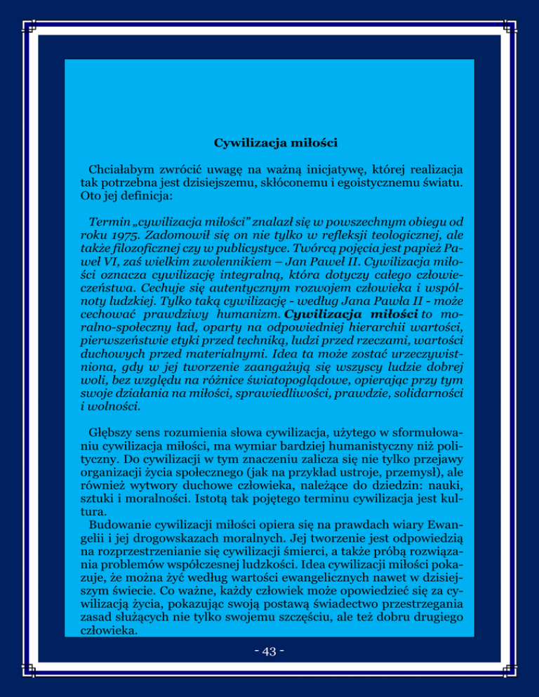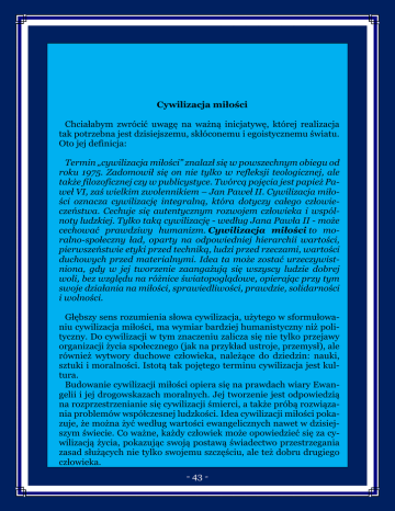 Cywilizacja miłości Chciałabym zwrócić uwagę na ważną inicjatywę, której realizacja tak potrzebna jest dzisiejszemu, skłóconemu i egoistycznemu światu. Oto jej definicja: Termin „cywilizacja miłości” znalazł się w powszechnym obiegu od roku 1975. Zadomowił się on nie tylko w refleksji teologicznej, ale także filozoficznej czy w publicystyce. Twórcą pojęcia jest papież Paweł VI, zaś wielkim zwolennikiem – Jan Paweł II. Cywilizacja miłości oznacza cywilizację integralną, która dotyczy całego człowieczeństwa. Cechuje się autentycznym rozwojem człowieka i wspólnoty ludzkiej. Tylko taką cywilizację - według Jana Pawła II - może cechować prawdziwy humanizm. Cywilizacja miłości to moralno-społeczny ład, oparty na odpowiedniej hierarchii wartości, pierwszeństwie etyki przed techniką, ludzi przed rzeczami, wartości duchowych przed materialnymi. Idea ta może zostać urzeczywistniona, gdy w jej tworzenie zaangażują się wszyscy ludzie dobrej woli, bez względu na różnice światopoglądowe, opierając przy tym swoje działania na miłości, sprawiedliwości, prawdzie, solidarności i wolności. Głębszy sens rozumienia słowa cywilizacja, użytego w sformułowaniu cywilizacja miłości, ma wymiar bardziej humanistyczny niż polityczny. Do cywilizacji w tym znaczeniu zalicza się nie tylko przejawy organizacji życia społecznego (jak na przykład ustroje, przemysł), ale również wytwory duchowe człowieka, należące do dziedzin: nauki, sztuki i moralności. Istotą tak pojętego terminu cywilizacja jest kultura. Budowanie cywilizacji miłości opiera się na prawdach wiary Ewangelii i jej drogowskazach moralnych. Jej tworzenie jest odpowiedzią na rozprzestrzenianie się cywilizacji śmierci, a także próbą rozwiązania problemów współczesnej ludzkości. Idea cywilizacji miłości pokazuje, że można żyć według wartości ewangelicznych nawet w dzisiejszym świecie. Co ważne, każdy człowiek może opowiedzieć się za cywilizacją życia, pokazując swoją postawą świadectwo przestrzegania zasad służących nie tylko swojemu szczęściu, ale też dobru drugiego człowieka. - 43 - Obecnie dążeniu do europejskiej jedności towarzyszą napięcia między chrześcijańską cywilizacją miłości, a ideami, które Karol Wojtyła określił jako „kultura śmierci”. Cywilizacja miłości, w przeciwieństwie do kultury śmierci, w pozytywny sposób odzwierciedla stosunek do Boga i drugiego człowieka. Opiera się na pokoju, solidarności, sprawiedliwości i wolności. Papież zwraca uwagę, iż współczesny świat w wielu kwestiach oddalił się od Boga i potrzebuje jasnego określenia kierunku właściwego rozwoju, opartego na podstawowych wartościach uniwersalnych. Europejska wspólnota jest w dzisiejszych czasach zagrożona przez wypracowane przez siebie „wartości” – jak konsumpcjonizm, alienacja człowieka, nihilizm moralny. Na ten kryzys należy odpowiedzieć cywilizacją życia, opartą na wartościach, które znajdują urzeczywistnienie w Jezusie Chrystusie. Jan Paweł II nierzadko w swoich wypowiedziach kreślił wizję zjednoczonej Europy, opartej na fundamentach bliskich chrześcijańskiej tradycji. Jego zdaniem integracja powinna bazować zarówno na bogactwie i dokonaniach poszczególnych kultur, jak i na nieustającej trosce o losy europejskiej cywilizacji. Papież Jan Paweł II uczy, że ważnym aspektem budowania cywilizacji miłości jest rodzina. Zgoda w narodzie jest zależna w znacznej mierze od tego, jaki jest „stan” podstawowej komórki społecznej. Rodzina opierająca się na fundamentach zgodnych z podstawowymi wartościami uniwersalnymi, prowadząca mądre i pracowite życie, jest podstawą budowania społeczeństwa opartego na tolerancji, pokoju i sprawiedliwości. Godność ludzka jest niezbywalnym prawem, przysługującym każdemu człowiekowi i stanowi istotny aspekt budowy cywilizacji miłości. Jan Paweł II wielokrotnie podkreśla, że nadprzyrodzona i naturalna godność przysługuje każdej osobie. Zdolność intelektualnego poznania, wolność, miłość, czynią człowieka najwyższym stworzeniem Bożym na Ziemi, ale też zobowiązują do poszanowania tych wartości w życiu innych ludzi. Przestrzeganie praw człowieka musi być w cywilizacji miłości respektowane. Jan Paweł II przypomina, że zdobycze współczesnego świata mogą bardzo łatwo obrócić się przeciwko człowiekowi, jeśli nie będzie potrafił z nich umiejętnie korzystać, kierując się przede wszystkim sercem. W każdej sytuacji, zgodnie z nauką Karola Wojtyły, należy pamiętać o prymacie „być nad mieć”, miłosierdzia nad sprawiedliwością, etyki nad techniką i osoby nad rzeczą. Człowiek właściwie kształtowany jest tylko przez takie wartości jak: prawda, dobro, oparcie postępowania na prawdach głoszonych przez Jezusa Chrystusa, poszanowanie godności innej osoby. - 44 - Z inicjatywy Jana Pawła II. Powstał Ruch Społeczny KU CYWILIZACJI MIŁOŚCI, niosący krótkie hasła uznawania prymatu: osoby przed rzeczą więcej być przed więcej mieć etyki przed techniką miłosierdzia przed sprawiedliwością Ja dodałabym jeszcze: raczej dawać niż brać Dziś tak walczy się o sprawiedliwość, a ja znam takie powiedzenie, że sprawiedliwość będzie w piekle, a w niebie jest Łaska. Chrześcijaństwo niesie w sobie optymizm, to wiara, nadzieja i miłość. Bez wiary nie ma nadziei, a wszystko ogarnia Miłość, czyli Bóg. - 45 -