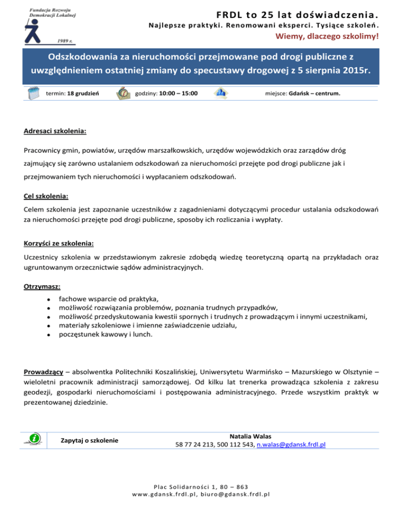 FRDL to 25 lat doświadczenia . Najlepsze praktyki. Renomowani eksperci. Tysiące szkoleo . Wiemy, dlaczego szkolimy! Odszkodowania za nieruchomości przejmowane pod drogi publiczne z uwzględnieniem ostatniej zmiany do specustawy drogowej z 5 sierpnia 2015r. termin: 18 grudzieo godziny: 10:00 – 15:00 miejsce: Gdaosk – centrum. Adresaci szkolenia: Pracownicy gmin, powiatów, urzędów marszałkowskich, urzędów wojewódzkich oraz zarządów dróg zajmujący się zarówno ustalaniem odszkodowao za nieruchomości przejęte pod drogi publiczne jak i przejmowaniem tych nieruchomości i wypłacaniem odszkodowao. Cel szkolenia: Celem szkolenia jest zapoznanie uczestników z zagadnieniami dotyczącymi procedur ustalania odszkodowao za nieruchomości przejęte pod drogi publiczne, sposoby ich rozliczania i wypłaty. Korzyści ze szkolenia: Uczestnicy szkolenia w przedstawionym zakresie zdobędą wiedzę teoretyczną opartą na przykładach oraz ugruntowanym orzecznictwie sądów administracyjnych. Otrzymasz: fachowe wsparcie od praktyka, możliwośd rozwiązania problemów, poznania trudnych przypadków, możliwośd przedyskutowania kwestii spornych i trudnych z prowadzącym i innymi uczestnikami, materiały szkoleniowe i imienne zaświadczenie udziału, poczęstunek kawowy i lunch. Prowadzący – absolwentka Politechniki Koszalioskiej, Uniwersytetu Warmiosko – Mazurskiego w Olsztynie – wieloletni pracownik administracji samorządowej. Od kilku lat trenerka prowadząca szkolenia z zakresu geodezji, gospodarki nieruchomościami i postępowania administracyjnego. Przede wszystkim praktyk w prezentowanej dziedzinie. Zapytaj o szkolenie Natalia Walas 58 77 24 213, 500 112 543, [email protected] Pla c S ol id ar n o śc i 1, 8 0 – 86 3 w w w. gd an sk .f rd l .p l , b iu ro @gd a n sk. frd l.p l Program: 1. Odszkodowania za nieruchomości zajęte pod drogi publiczne w trybie art. 73 ustawy z 13 października 1998r. przepisy wprowadzające ustawy reformujące administrację publiczną (Dz.U.1998.133.872 ze zm.) 2. Postępowania odszkodowawcze w trybie art. 98 ust. 3 ustawy z dnia 21 sierpnia 1997r. o gospodarce nieruchomościami (Dz.U.2015.782 tj). 3. Postępowania odszkodowawcze w trybie ustawy z dnia 10 kwietnia 2013 o szczególnych zasadach przygotowania i realizacji inwestycji w zakresie dróg publicznych (Dz.U.2013.687 j.t.) - „specustawa drogowa”: ustalenie wysokości odszkodowania; odszkodowanie w stosunku do ograniczonych praw rzeczowych; odszkodowanie za nieruchomośd o nieuregulowanym stanie prawnym; tryb przeprowadzenia postępowania, omówienie ostatnich zmian do specustawy m.in. możliwośd zrzeczenia się odszkodowania, odliczenie wartości drzewostanu od odszkodowania, hipoteka. 4. Odszkodowanie za nieruchomośd wywłaszczoną pod drogę publiczną - analiza art. 130, 132, 134 i 135 ustawy o gospodarce nieruchomościami w kontekście dróg publicznych. 5. Określanie wartości nieruchomości do celów ustalenia odszkodowania za nieruchomości przejęte pod drogi publiczne - analiza § 36 rozporządzenia z 21.09.2004r. w sprawie wyceny nieruchomości i sporządzania operatu szacunkowego, 6. Orzecznictwo w zakresie odszkodowao za nieruchomości przejmowane pod drogi publiczne, 7. Pytania, dyskusja. WYŚLIJ ZGŁOSZENIE DO: 14.12.15r.,15:00 [email protected] 58 550 32 39 FORMULARZ ZGŁOSZENIOWY: Odszkodowania za nieruchomości przejmowane pod drogi publiczne: 18 grudzieo 2015 Nazwa Instytucji/Firmy (dane do FV): Adres: NIP: Telefon: Faks: 1. Imię, nazwisko , stanowisko e-mail Imię, nazwisko , stanowisko e-mail 2. Cena netto/brutto: 430 zł Zgłoszenie w terminie do 07 grudnia 2015 r. Dla kolejnej osoby zgłoszonej z tej samej instytucji -15% 10% rabatu Udział w szkoleniu jest finansowane przynajmniej w 70 % ze środków publicznych Należnośd należy zapłacid przelewem po szkoleniu po otrzymaniu faktury VAT 365,50 zł TAK / NIE TAK / NIE TAK / NIE TAK / NIE Zgodnie z Ust. o Ochronie Danych Osobowych z dnia 29.08.1997 r. wyrażam zgodę na przetwarzanie moich danych osobowych dla potrzeb działalności szkoleniowej FRDL Brak pisemnej rezygnacji ze szkolenia na 5 dni przed terminem będzie równoznaczny z obciążeniem Paostwa 50 % kosztów ogólnych. Data: Podpis: Uwaga! Braku kontaktu ze strony FRDL minimum 2 dni przed terminem szkolenia może oznaczad, że karta zgłoszeniowa nie dotarła. W takim przypadku prosimy o kontakt telefoniczny lub mailowy: 58 772 42 13, [email protected]