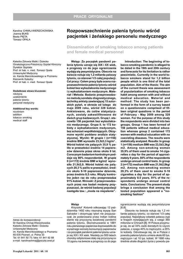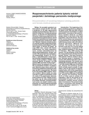 PRACE ORYGINALNE Karolina CHMAJ-WIERZCHOWSKA Joanna BUKS Beata PIÊTA Tomasz OPALA Rozpowszechnienie palenia tytoniu wród pacjentek i ¿eñskiego personelu medycznego Dissemination of smoking tobacco among patients and female medical personnel Katedra Zdrowia Matki i Dziecka Ginekologiczno-Po³o¿niczy Szpital Kliniczny Dyrektor Szpitala: Prof. dr hab. n. med. Tomasz Opala Uniwersytet Medyczny im. Karola Marcinkowskiego w Poznaniu Kierownik Katedry: Prof. dr hab. n. med. Tomasz Opala Dodatkowe s³owa kluczowe: nikotyna uzale¿nienie palenie tytoniu personel medyczny Additional key words: nicotinism addition tobacco smoking medical staff Adres do korespondencji: Dr Karolina Chmaj-Wierzchowska Katedra Zdrowia Matki i Dziecka Uniwersytet Medyczny im. Karola Marcinkowskiego w Poznaniu 60-535 Poznañ, ul. Polna 33 Tel. 61 841 92 73; faks: 61 841 92 88 e-mail: [email protected] Przegl¹d Lekarski 2011 / 68 / 10 Wstêp: Za pocz¹tek pandemii palenia tytoniu uznaje siê XIX i XX wiek, a prognozy co do jego ograniczenia wydaj¹ siê pesymistyczne. Obecnie na wiecie notuje siê 1,2 miliarda palaczy tytoniu, co stanowi 1/3 ca³ej populacji. Cel pracy: Celem pracy by³a ocena rozpowszechnienia palenia tytoniu wród kobiet bez wykszta³cenia medycznego i z wykszta³ceniem medycznym. Materia³ i Metoda: Badanie przeprowadzono metod¹ sonda¿u diagnostycznego, technik¹ ankiety zawieraj¹cej 15 autorskich pytañ, w okresie od lutego do maja 2009 roku, wród 328 kobiet. Ankietowane, do celów statystycznych, zosta³y zakwalifikowane do dwóch grup badawczych. Grupê I. stanowi³o 156 pacjentek bez wykszta³cenia medycznego. Grupa II. to 172 kobiety z wykszta³ceniem medycznym, bez schorzeñ wspó³istniej¹cych. Otrzymane wyniki poddano analizie statystycznej. Wyniki: W grupie I (n=156) rednie BMI wynosi³o 23,5±3,3 kg/m2 . Wród kobiet nie pal¹cych 35,9 % pali³o w przesz³oci rednio 14 papierosów dziennie przez okres oko³o 9 lat. Corocznym badaniom kontrolnym poddaje siê 80% respondentek. W grupie II (n=172) rednie BMI w kg/m2 wynosi³o 21,9±2,0. Wród kobiet nie pal¹cych 20,3 % pali³o w przesz³oci, rednio oko³o 9-10 papierosów dziennie, przez rednio 8,5 roku. Wizyty kontrolne jeden raz do roku przeprowadza 91% kobiet. Wnioski: Z przeprowadzonych przez nas badañ mo¿emy przypuszczaæ, ¿e wród badanej populacji nast¹pi³a tzw.: moda na niepalenie. Introduction: The beginning of tobacco smoking pandemic is alleged to be dated in the 19th and 20th century and forecasts for its limitation is rather pessimistic. Currently in the world tobacco smokers stand for 1,2 billion people which is one third of the total population. Aim of the thesis: The aim of the current thesis was assessment of popularization of smoking tobacco habit among women with and without medical education. Material and method: The study has been performed in the form of a survey based on a questionnaire comprised of fifteen original questions in the period of February - May 2009 among 328 women. For the purpose of this study the respondents were divided into two groups. Group 1 has been formed of 156 patients without medical education whereas group 2 contained 172 women with medical education with no coexisting diseases. The results were statistically analyzed. Results: In group 1 (n=156) medium BMI was 23,5±3,3kg/ m2. Among non-smoking women 35,9% of them used to smoke 14 cigarettes a day for the period of approximately 9 years. 80% of the respondents undergo annual control tests. In group 2 (n=172) medium BMI was 21,9±2,0kg/ m2. Among non-smoking women 20,3% of them used to smoke 9-10 cigarettes a day for the period of approximately 8.5 years. 91% of the respondents undergo annual control tests. Conclusions: The present study brings a conclusion that among the tested population appeared a "nosmoking fashion" Wstêp Krzysztof Kolumb odkrywaj¹c 12 padziernika 1492 roku nieznan¹ wyspê San Salvador i otrzymuj¹c tytoñ nie przypuszcza³, ¿e podarowana przez Indian rolina stanie siê przyczyn¹ wiatowej pandemii palenia tytoniu. Skonstruowanie w 1881 roku pierwszego papierosa doprowadzi³o do wyranego wzrosty konsumpcji papierosów i za pocz¹tek pandemii palenia tytoniu uznaje siê XIX i XX wiek. Niestety po 500 latach choroby odtytoniowe sta³y siê przyczyn¹ co 10 zgonu na wiecie a prognozy co do jego ograniczenia wydaj¹ siê pesymistyczne [6,8]. Obecnie na wiecie notuje siê 1,2 miliarda palaczy tytoniu, co stanowi 1/3 ca³ej populacji. Najwiêkszy odsetek palaczy ¿yje w krajach rozwijaj¹cych siê, z czego 360 milionów w Chinach [8]. W Polsce przyjmuje siê, ¿e a¿ 33% osób doros³ych to czynni palacze, z czego 40% to mê¿czyni, a 25% to kobiety. Odnotowuje siê, ¿e w Polsce z powodu palenia tytoniu umiera oko³o 60 tys. mê¿czyzn i a¿ 10 tys. kobiet. W 1990 roku rednia utrata d³ugoci ¿ycia z powodu pa- 883 lenia tytoniu wynosi³a 17 lat [2]. Niedawno opublikowane wyniki badañ epidemiologicznych oraz prognozy na 2020 rok wskazuj¹, ¿e z powodu chorób odtytoniowych umrze oko³o 10 milionów osób, co oznacza, ¿e choroby odtytoniowe stan¹ siê przyczyn¹ co 3 zgonu na wiecie [8]. Pomimo ogromnego postêpu nauki, wdro¿onej profilaktyki i wielu kampanii antynikotynowych oraz leczenia, palenie tytoniu jest nadal ogromnym problemem spo³ecznym a zarazem plag¹ wspó³czesnej medycyny. Kto jest dotkniêty problemem nikotynizmu? Jest to niew¹tpliwie problemem spo³eczny, dotycz¹cy wszystkich rodowisk, w tym równie¿ pracowników s³u¿by zdrowia [2,5]. Celem pracy by³a ocena rozpowszechnienia palenia papierosów wród kobiet bez wykszta³cenia medycznego i z wykszta³ceniem medycznym - pracowników s³u¿by zdrowia. Materia³ i metoda Badanie przeprowadzono metod¹ sonda¿u diagnostycznego, technik¹ ankiety zawieraj¹cej 15 autorskich pytañ, w okresie od lutego do maja 2009 roku, wród 328 kobiet. Na pytania zawarte w ankiecie odpowiada³a losowo wybrana grupa respondentek powy¿ej 18. roku ¿ycia (
