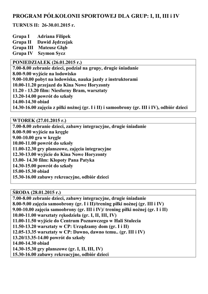 PROGRAM PÓŁKOLONII SPORTOWEJ DLA GRUP: I, II, III i IV TURNUS II: 26-30.01.2015 r. Grupa I Grupa II Grupa III Grupa IV Adriana Filipek Dawid Jędrzejak Mateusz Głąb Szymon Sycz PONIEDZIAŁEK (26.01.2015 r.) 7.00-8.00 zebranie dzieci, podział na grupy, drugie śniadanie 8.00-9.00 wyjście na lodowisko 9.00-10.00 pobyt na lodowisku, nauka jazdy z instruktorami 10.00-11.20 przejazd do Kina Nowe Horyzonty 11.20 - 13.20 film: Niesforny Bram, warsztaty 13.20-14.00 powrót do szkoły 14.00-14.30 obiad 14.30-16.00 zajęcia z piłki nożnej (gr. I i II) i samoobrony (gr. III i IV), odbiór dzieci WTOREK (27.01.2015 r.) 7.00-8.00 zebranie dzieci, zabawy integracyjne, drugie śniadanie 8.00-9.00 wyjście na kręgle 9.00-10.00 gra w kręgle 10.00-11.00 powrót do szkoły 11.00-12.30 gry planszowe, zajęcia integracyjne 12.30-13.00 wyjście do Kina Nowe Horyzonty 13.00- 14.30 film: Kłopoty Pana Patyka 14.30-15.00 powrót do szkoły 15.00-15.30 obiad 15.30-16.00 zabawy rekreacyjne, odbiór dzieci ŚRODA (28.01.2015 r.) 7.00-8.00 zebranie dzieci, zabawy integracyjne, drugie śniadanie 8.00-9.00 zajęcia samoobrony (gr. I i II)/trening piłki nożnej (gr. III i IV) 9.00-10.00 zajęcia samoobrony (gr. III i IV)/ trening piłki nożnej (gr. I i II) 10.00-11.00 warsztaty rękodzieła (gr. I, II, III, IV) 11.00-11.50 wyjście do Centrum Poznawczego w Hali Stulecia 11.50-13.20 warsztaty w CP: Urządzamy dom (gr. I i II) 12.05-13.35 warsztaty w CP: Dawno, dawno temu.. (gr. III i IV) 13.20/13.35-14.00 powrót do szkoły 14.00-14.30 obiad 14.30-15.30 gry planszowe (gr. I, II, III, IV) 15.30-16.00 zabawy rekreacyjne, odbiór dzieci CZWARTEK ( 29.01.2015 r.) 7.00-8.00 zebranie dzieci, zabawy rekreacyjne, drugie śniadanie 8.00-9.00 wyjście na lodowisko 9.00-10.00 pobyt na lodowisku, nauka i doskonalenie jazdy z instruktorami 10.00-11.00 powrót do szkoły 11.00-12.00 zajęcia taneczne ( gr. I i II), zajęcia koszykówki (gr. III i IV) 12.00-13.00 zajęcia taneczne (gr. III i IV), zajęcia koszykówki (gr. I i II) 13.00-14.00 zajęcia z piłki nożnej (gr. III i IV), zajęcia samoobrony (gr. I i II) 14.00-14.30 obiad 14.30-16.00 warsztaty rękodzieła (gr. I, II, III, IV) PIĄTEK( 30.01.2015 r.) 7.00-8.00 zebranie dzieci, podział na grupy 8.00-9.00 wyjście do Gimnazjum nr 15 9.00-11.00 warsztaty na ergometrach wioślarskich 11.00-11.30 przejazd do ZOO 11.30-12.30 zwiedzanie ZOO, drugie śniadanie 12.30-13.30 lekcja w ZOO, tematy: Zwierzęta Azji (gr. I i II), Wstęp do gadów (gr. III i IV) 13.30-14.00 powrót do szkoły 14.00-14.30 obiad 14.30-15.45 zajęcia z piłki nożnej (gr. III i IV) i samoobrony (gr. I i II) 15.45-16.00 odbiór dzieci UWAGA RODZICE! 1. Dzieci pierwszego dnia półkolonii będą podzielone na grupy pod względem wieku i ewentualnych przyjaźni, proszę by dzieci/rodzeństwa, które chcą być w jednej grupie zgłaszały to podczas podziału. Listy podziału zostaną wywieszane na tablicach przy klasach. 2. Proszę, aby przyprowadzali Państwo dzieci do godz. 8.00, jeśli są wycieczki i mamy umówione warsztaty, wychowawcy zbierają grupy i wychodzą o umówionej godzinie. 3. Podczas półkolonii będą odbywały się zajęcia sportowe-proszę zaopatrzyć dzieci codziennie w strój sportowy (świeża koszulka, spodenki i skarpety), buty zmienne, gumkę do długich włosów! 4. Proszę zaopatrzyć dzieci w bidony/butelki, woda do picia jest na miejscu. 5. Proszę, aby każde dziecko miało ze sobą mały plecak na prowiant i wodę, kiedy wychodzimy na wycieczki 6. Proszę ubierać dzieci odpowiednio do panujących warunków atmosferycznych, 7. Bardzo proszę nie odbierać dzieci w trakcie powrotu z wycieczek, tylko dopiero po powrocie do szkoły. Odbieranie dzieci z grupy przechodzącej po pasach nie jest bezpieczne, a wychowawcy muszą pamiętać, kogo i komu oddają. 8. Na każdych zajęciach i warsztatach są instruktorzy, więc proszę się nie obawiać, że dziecko nie umie jeździć na łyżwach… 9. Na lodowisku wypożyczamy cały sprzęt, nic Państwo nie dopłacają. 10. Proszę by dzieci znały rozmiar buta żeby podać w wypożyczalni na lodowisku i w kręgielni. 11. Proszę nie dawać dzieciom telefonów i gier, bez tego będzie dobra zabawa .