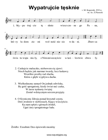 Wypatrujcie tęsknie 1. Wy pa truj cie tę sknie t. M. Kopernik, XVI w. m.: ks. Z.Piasecki wiesz czo ne go Pa na, 5 któ ry lu dom zie mi 42 wol ność nie sie w da ni. Zbaw ca 10 44 świa ta wspa nia ły, z Nim zaś szczęście w kró 2. Czekajcie maluczko, niebawem się zjawi: Niech będzie jak marmur twardy, lecz łaskawy. Wszelkie prośby rad słucha, Która z głębi wypływa ducha. 3. Wielkoduszny zamysł On jednak odwleka, By gość upragniony, kiedy świat nać czeka, W żarze tęsknoty świętej Został wdzięcznym sercem przyjęty. 4. O Kryniczny Zdroju ponad kryształ czysty, Dziś zrodzon w niebiosach, bijący wieczyście. Ku nam spłyń z górnych źródeł, Ugaś żary spragnionego ludu. Źródło: Exsultate Deo-śpiewnik mszalny www.nuty.religijne.org les twie chwa ły.