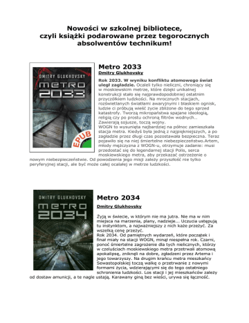 Nowości w szkolnej bibliotece, czyli książki podarowane przez tegorocznych absolwentów technikum! Metro 2033 Dmitry Glukhovsky Rok 2033. W wyniku konfliktu atomowego świat uległ zagładzie. Ocaleli tylko nieliczni, chroniący się w moskiewskim metrze, które dzięki unikalnej konstrukcji stało się najprawdopodobniej ostatnim przyczółkiem ludzkości. Na mrocznych stacjach, rozświetlanych światłami awaryjnymi i blaskiem ognisk, ludzie ci próbują wieść życie zbliżone do tego sprzed katastrofy. Tworzą mikropaństwa spajane ideologią, religią czy po prostu ochroną filtrów wodnych… Zawierają sojusze, toczą wojny. WOGN to wysunięta najbardziej na północ zamieszkała stacja metra. Kiedyś była jedną z najpiękniejszych, a po zagładzie przez długi czas pozostawała bezpieczna. Teraz pojawiło się na niej śmiertelne niebezpieczeństwo.Artem, młody mężczyzna z WOGN-u, otrzymuje zadanie: musi przedostać się do legendarnej stacji Polis, serca moskiewskiego metra, aby przekazać ostrzeżenie o nowym niebezpieczeństwie. Od powodzenia jego misji zależy przyszłość nie tylko peryferyjnej stacji, ale być może całej ocalałej w metrze ludzkości. Metro 2034 Dmitry Glukhovsky Żyją w świecie, w którym nie ma jutra. Nie ma w nim miejsca na marzenia, plany, nadzieje... Uczucia ustępują tu instynktom, a najważniejszy z nich każe przeżyć. Za wszelką cenę przeżyć. Rok 2034. Od pamiętnych wydarzeń, które początek i finał miały na stacji WOGN, minął niespełna rok. Czarni, ponoć śmiertelne zagrożenie dla tych nielicznych, którzy w czeluściach moskiewskiego metra przetrwali atomową apokalipsę, zniknęli na dobre, zgładzeni przez Artema i jego towarzyszy. Na drugim krańcu metra mieszkańcy Sewastopolskiej toczą walkę o przetrwanie z nowymi formami życia, wdzierającymi się do tego ostatniego schronienia ludzkości. Los stacji i jej mieszkańców zależy od dostaw amunicji, a te nagle ustają. Karawany giną bez wieści, urywa się łączność. Arabska księżniczka Tanya Valko Czwarty tom bestsellerowej serii, do której należą: "Arabska żona", "Arabska córka" i "Arabska krew" (są dostępne w bibliotece szkolnej). Tanya Valko kontynuuje swoją poruszającą opowieść o świecie muzułmańskim. W "Arabskiej księżniczce" zgłębia tajniki ludzkiej natury, uwarunkowane surowym prawem szarijatu. To wstrząsający opis przemocy, mordów i gwałtów, ale też książka ukazująca codzienność w arabskim kraju. Poznajemy dalsze koleje życia Doroty - Polki, która w młodości poślubiła Libijczyka Ahmeda, oraz jej dorosłej córki, która teraz sama staje się matką. Tym razem ich dzieje splotą się z zawikłanymi losami saudyjskiej księżniczki Lamii. Kraj muzułmański przedstawiony tu został nie tylko z perspektywy Europejek, ale również rodowitych mieszkanek. Książka ukazuje starania arabskich kobiet o emancypację. Szukanie przez nie miejsca dla siebie w świecie rządzonym przez mężczyzn. Tanya Valko opisuje okrucieństwo, pasje i uczucia oraz podłoże psychologiczne ludzkich czynów. Wędrowcy. Eperu Augusta Docher Anna Wilk z pozoru jest zwykłą nastolatką, która powoli wkracza w dorosłe życie. Pasjonuje się malowaniem, wybrała studia artystyczne. Choć urodzona w Polsce, od wielu lat mieszka razem z matką i Wiką, serdeczną przyjaciółką, w Londynie. Z okazji ukończenia szkoły matki Anny i Wiki zaplanowały dziewczynom niespodziankę: wyjazd do Francji. Przebojowa Wika odkrywa, że znajdą się tam akurat wtedy, gdy niedaleko, w Cannes, odbywać się będzie słynny festiwal filmowy. A że kocha się w jednym z popularnych aktorów, Leo Blacku, wymusza na Annie wspólne pójście po autografy. Wydarzenia w Cannes wywracają życie Anny do góry nogami, bowiem Leo Black nieoczekiwanie wyławia ją z tłumu i proponuje spotkanie. Szybko pojawia się zauroczenie. Leo nie jest jednak zwykłym człowiekiem - jest Wędrowcem, człowiekiem odradzającym się w nowych wcieleniach. Jak zmieni się życie Anny i jak potoczą się losy tego niezwykłego związku? Ten jeden rok Gayle Forman Kolejna książka bestsellerowej autorki Zostań, jeśli kochasz i Wróć, jeśli pamiętasz (dostępne w naszej bibliotece) Willem stracił kontrolę nad swoim życiem. Boleśnie zraniony śmiercią ojca obawia się kolejnej miłości i kolejnej (być może) straty. Nie potrafi jednak zapomnieć dnia spędzonego w Paryżu z pewną niezwykłą dziewczyną. Czuje, że musi ją odnaleźć, chociaż nie zna nawet jej prawdziwego imienia. Mimo to będzie próbował. W najbliższym roku czeka go kilka ważnych decyzji. Czy zaryzykuje? Czy otrzyma dar od losu i spotka ponownie Allyson? Ten jeden rok to kontynuacja książki Ten jeden dzień (dostępna w bibliotece). Romantyczna i wciągająca opowieść o miłości, podróży i zbiegach okoliczności, które zmieniają całe życie.
