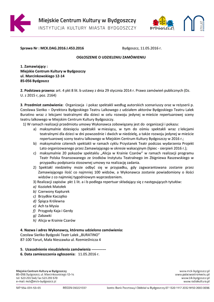 Sprawa Nr : MCK.DAG.2016.I.453.2016 Bydgoszcz, 11.05.2016 r. OGŁOSZENIE O UDZIELENIU ZAMÓWIENIU 1. Zamawiający : Miejskie Centrum Kultury w Bydgoszczy ul. Marcinkowskiego 12-14 85-056 Bydgoszcz 2. Podstawa prawna: art. 4 pkt 8 lit. b ustawy z dnia 29 stycznia 2014 r. Prawo zamówień publicznych (Dz. U. z 2015 r, poz. 2164) 3. Przedmiot zamówienia: Organizacja i pokaz spektakli według autorskich scenariuszy oraz w reżyserii p. Czesława Sieńko – Dyrektora Bydgoskiego Teatru Lalkowego z udziałem aktorów Bydgoskiego Teatru Lalek Buratino wraz z lekcjami teatralnymi dla dzieci w celu rozwoju jedynej w mieście repertuarowej sceny teatru lalkowego w Miejskim Centrum Kultury Bydgoszczy. 1) W ramach realizacji przedmiotu umowy Wykonawca zobowiązany jest do organizacji i pokazu: a) maksymalnie dziesięciu spektakli w miesiącu, w tym do ośmiu spektakli wraz z lekcjami teatralnymi dla dzieci w dni powszednie i dwóch w niedzielę, a także rozwoju jedynej w mieście repertuarowej sceny teatru lalkowego w Miejskim Centrum Kultury Bydgoszczy w 2016 r.; b) maksymalnie czterech spektakli w ramach cyklu Przystanek Teatr podczas wydarzenia Projekt Lato organizowanego przez Zamawiającego w okresie wakacyjnym (lipiec - sierpień 2016 r.); c) maksymalnie 20 pokazów spektaklu „Alicja w Krainie Czarów” w ramach realizacji programu Teatr Polska finansowanego ze środków Instytutu Teatralnego im Zbigniewa Raszewskiego w przypadku podpisania stosownej umowy na realizację zadania. 2) Spektakl niedzielny może odbyć się w przypadku, gdy zagwarantowana zostanie przez Zamawiającego ilość co najmniej 100 widzów, a Wykonawca zostanie powiadomiony o ilości widzów z co najmniej tygodniowym wyprzedzeniem. 3) Realizacji zapisów pkt 1 lit. a i b podlega repertuar składający się z następujących tytułów: a) Koziołek Matołek b) Czerwony Kapturek c) Brzydkie Kaczątko d) Śpiąca Królewna e) Ach ta Mysia f) Przygody Kaja i Gerdy g) Zabawki h) Alicja w Krainie Czarów 4. Nazwa i adres Wykonawcy, któremu udzielono zamówienia: Czesław Sieńko Bydgoski Teatr Lalek „BURATINO” 87-100 Toruń, Mała Nieszawka ul. Rzemieślnicza 4 5. Uzasadnienie nieudzielenia zamówienia -----------6. Data zamieszczenia ogłoszenia: 11.05.2016 r.