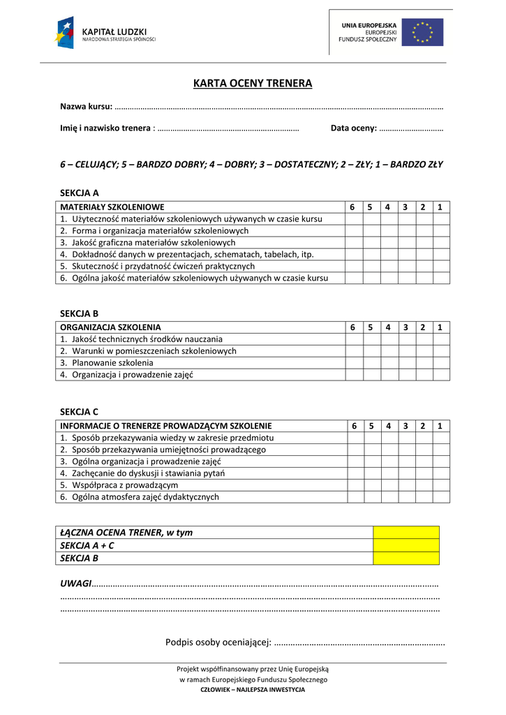 KARTA OCENY TRENERA Nazwa kursu: ……………………………………………………………………………………………………………………………………… Imię i nazwisko trenera : ………………………………………………………… Data oceny: ………………………… 6 – CELUJĄCY; 5 – BARDZO DOBRY; 4 – DOBRY; 3 – DOSTATECZNY; 2 – ZŁY; 1 – BARDZO ZŁY SEKCJA A MATERIAŁY SZKOLENIOWE 1. Użyteczność materiałów szkoleniowych używanych w czasie kursu 2. Forma i organizacja materiałów szkoleniowych 3. Jakość graficzna materiałów szkoleniowych 4. Dokładność danych w prezentacjach, schematach, tabelach, itp. 5. Skuteczność i przydatność ćwiczeń praktycznych 6. Ogólna jakość materiałów szkoleniowych używanych w czasie kursu 6 5 4 3 2 1 6 5 4 3 2 1 6 5 4 3 2 1 SEKCJA B ORGANIZACJA SZKOLENIA 1. Jakość technicznych środków nauczania 2. Warunki w pomieszczeniach szkoleniowych 3. Planowanie szkolenia 4. Organizacja i prowadzenie zajęć SEKCJA C INFORMACJE O TRENERZE PROWADZĄCYM SZKOLENIE 1. Sposób przekazywania wiedzy w zakresie przedmiotu 2. Sposób przekazywania umiejętności prowadzącego 3. Ogólna organizacja i prowadzenie zajęć 4. Zachęcanie do dyskusji i stawiania pytań 5. Współpraca z prowadzącym 6. Ogólna atmosfera zajęć dydaktycznych ŁĄCZNA OCENA TRENER, w tym SEKCJA A + C SEKCJA B UWAGI…………………………………………………………………………………………………………………………….…… ……………………………………………………………………………………………………………………………………………… ……………………………………………………………………………………………………………………………………………… Podpis osoby oceniającej: ………………………………………………………………. Projekt współfinansowany przez Unię Europejską w ramach Europejskiego Funduszu Społecznego CZŁOWIEK – NAJLEPSZA INWESTYCJA
