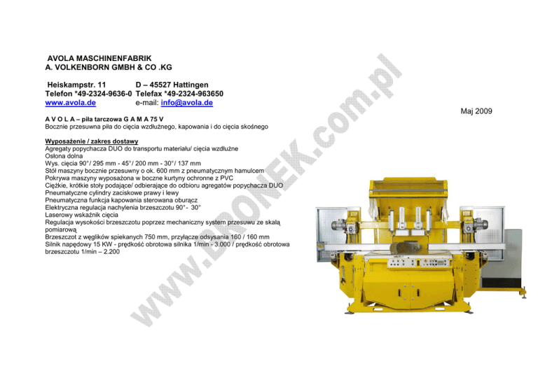 AVOLA MASCHINENFABRIK A. VOLKENBORN GMBH & CO .KG Heiskampstr. 11 D – 45527 Hattingen Telefon *49-2324-9636-0 Telefax *49-2324-963650 www.avola.de e-mail: [email protected] Maj 2009 A V O L A – piła tarczowa G A M A 75 V Bocznie przesuwna piła do cięcia wzdłużnego, kapowania i do cięcia skośnego Wyposażenie / zakres dostawy Agregaty popychacza DUO do transportu materiału/ cięcia wzdłużne Osłona dolna Wys. cięcia 90° / 295 mm - 45° / 200 mm - 30° / 137 mm Stół maszyny bocznie przesuwny o ok. 600 mm z pneumatycznym hamulcem Pokrywa maszyny wyposażona w boczne kurtyny ochronne z PVC Ciężkie, krótkie stoły podające/ odbierające do odbioru agregatów popychacza DUO Pneumatyczne cylindry zaciskowe prawy i lewy Pneumatyczna funkcja kapowania sterowana oburącz Elektryczna regulacja nachylenia brzeszczotu 90° - 30° Laserowy wskaźnik cięcia Regulacja wysokości brzeszczotu poprzez mechaniczny system przesuwu ze skalą pomiarową Brzeszczot z węglików spiekanych 750 mm, przyłącze odsysania 160 / 160 mm Silnik napędowy 15 KW - prędkość obrotowa silnika 1/min - 3.000 / prędkość obrotowa brzeszczotu 1/min – 2.200 Osłona dolna Zapewnia bezpieczeństwo i poprawia ochronę przed emisją. Osłona dolna całkowicie zamyka maszynę. Niebezpieczna strefa ruchomych części staje się w ten sposób niedostępna. Drzwi wyposażone w wyłącznik bezpieczeństwa, pozwalają otworzyć maszynę i przeprowadzić czyszczenie w dolnej strefie. Odsysanie pyłu przyłączane w tylniej części maszyny. Pneumatyczne cylindry zaciskowe prawy i lewy Cylindry zaciskowe służą do mocowania materiału po prawej i/lub lewej stronie maszyny. Odstęp cylindrów zaciskowych do brzeszczotu w pozycji 90°- po 400 mm. Laserowy wskaźnik cięcia Laserowy wskaźnik cięcia wyznacza na drewnie czerwoną linie, według której ma nastąpić cięcie. Agregat popychacza D U O jest wyposażony w rolkę wciągającą i wyciągającą. Pod rolką wciągającą i i wyciągającą znajduje się rolka dociskające, która połączona jest z górną rolką przez pneumatyczny cylinder. Docisk działa jak kleszcze, które naciskają na materiał a nie na prowadnicę rolkową. W trakcie cięcia wzdłużnego pozycję materiału kontrolują czujniki i automatycznie sterują rolkami wciągu i wyciągu. Odstęp rolek wynosi 2,25 m. W przypadku maks. prędkości posuwu, długość ciętego drewna musi wynosić min. 2,8 m, aby zapewnić perfekcyjne podanie. Kierunek przesuwu drewna i wiążący się z tym nacisk na tylne prowadnice wzdłużne jest automatycznie rozpoznawany przez popychacze dzięki specjalnemu punktowi obrotu. Dane techniczne: Silnik przekładni posuwów P2= 1,1 kW/ siła posuwu F 1.000 N bezstopniowa regulacja prędkości poprzez potencjonometr 0,2-36 m/min. Przedłużenie posuwu - opcja Agregat popychacza D U O wyposażony jest w dodatkową rolkę skierowaną w kierunku stołu maszyny. Odstęp rolek zmniejsza się do 1,33 m co pozwala na bezproblemowe podanie przy maksymalnej prędkości posuwu, ciętego drewna o długości od 1,7m. Kierunek przesuwu drewna i wiążący się z tym nacisk na tylne prowadnice wzdłużne sterowany automatycznie przez pneumatyczne cylindry dociskowe przy popychaczach. Aluminiowe prowadnice wzdłużne Rolę tylnej prowadnicy prowadnicy rolkowej pełni stabilny, odporny na zwichrowanie profil aluminiowy o przekroju 120 x120 mm. Regulacja wysokości brzeszczotu Poprzez mechaniczny system prowadnic, ze skalą wymiarów, łatwa obsługa. , Regulacja kąta nachylenia brzeszczotu 90 - 30° zachodzi elektrycznie poprzez bezobsługowy wciągnik elektryczny(v = 0,5°/sek.) wyposa żony w wyświetlacz cyfrowy. Precyzyjne przestawienie zachodzi przez śrubę pociągową toczną całkowicie zamkniętą w stalowej rurze. Inne cechy: sprzęgło przeciążeniowe, silnik z zabezpieczeniem przed przegrzaniem, opornik. Przyłącze odsysania Gama 75 V jest wyposażona w dwa wsporniki odsysania o średnicy 160 mm Podciśnienie na przyłączu odsysania pa 1.750 / strumień objętości ≥ 3.000 m³/h Automatyczny posuw stołu maszyny - opcja – Pneumatyczny posuw dla bocznie przesuwnego stołu maszyny ok. 600 mm. Możliwość piłowania kombinowanego (cięć poprzecznych, przycinania) do maks 295 x 600 mm. Idealnie dla drewna klejonego lub większych płyt. Kąt nachylenia brzeszczotu 90 – 30° do ci ęcia skośnego.