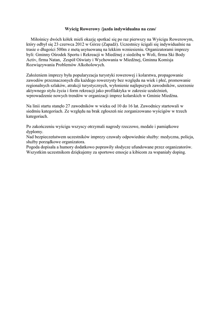 Wyścig Rowerowy /jazda indywidualna na czas/ Miłośnicy dwóch kółek mieli okazję spotkać się po raz pierwszy na Wyścigu Rowerowym, który odbył się 23 czerwca 2012 w Górze (Zapadź). Uczestnicy ścigali się indywidualnie na trasie o długości 500m z metą usytuowaną na lekkim wzniesieniu. Organizatorami imprezy byli: Gminny Ośrodek Sportu i Rekreacji w Miedźnej z siedzibą w Woli, firma Ski Body Activ, firma Natan, Zespół Oświaty i Wychowania w Miedźnej, Gminna Komisja Rozwiązywania Problemów Alkoholowych. Założeniem imprezy była popularyzacja turystyki rowerowej i kolarstwa, propagowanie zawodów przeznaczonych dla każdego rowerzysty bez względu na wiek i płeć, promowanie regionalnych szlaków, atrakcji turystycznych, wyłonienie najlepszych zawodników, szerzenie aktywnego stylu życia i form rekreacji jako profilaktyka w zakresie uzależnień, wprowadzenie nowych trendów w organizacji imprez kolarskich w Gminie Miedźna. Na linii startu stanęło 27 zawodników w wieku od 10 do 16 lat. Zawodnicy startowali w siedmiu kategoriach. Ze względu na brak zgłoszeń nie zorganizowano wyścigów w trzech kategoriach. Po zakończeniu wyścigu wszyscy otrzymali nagrody rzeczowe, medale i pamiątkowe dyplomy. Nad bezpieczeństwem uczestników imprezy czuwały odpowiednie służby: medyczna, policja, służby porządkowe organizatora. Pogoda dopisała a humory dodatkowo poprawiły słodycze ufundowane przez organizatorów. Wszystkim uczestnikom dziękujemy za sportowe emocje a kibicom za wspaniały doping.