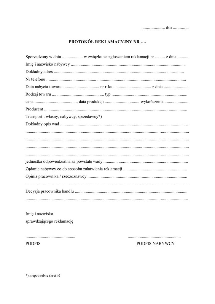 .......................... dnia .................. PROTOKÓŁ REKLAMACYJNY NR …. Sporządzony w dniu ................... w związku ze zgłoszeniem reklamacji nr ......... z dnia .......... Imię i nazwisko nabywcy .......................................................................................................... Dokładny adres ........................................................................................................................ Nr telefonu ................................................................................................................................. Data nabycia towaru .................................. nr r-ku ................................... z dnia ....................... Rodzaj towaru ................................................ typ ...................................................................... cena ........................................ data produkcji ................................ wykończenia ...................... Producent .................................................................................................................................... Transport : własny, nabywcy, sprzedawcy*) Dokładny opis wad ...................................................................................................................... ....................................................................................................................................................... ....................................................................................................................................................... ....................................................................................................................................................... ....................................................................................................................................................... jednostka odpowiedzialna za powstałe wady .............................................................................. Żądanie nabywcy co do sposobu załatwienia reklamacji ........................................................... Opinia pracownika / rzeczoznawcy ............................................................................................ ...................................................................................................................................................... Decyzja pracownika handlu ........................................................................................................ ...................................................................................................................................................... Imię i nazwisko sprawdzającego reklamację .............................................. PODPIS *) niepotrzebne skreślić ................................................. PODPIS NABYWCY