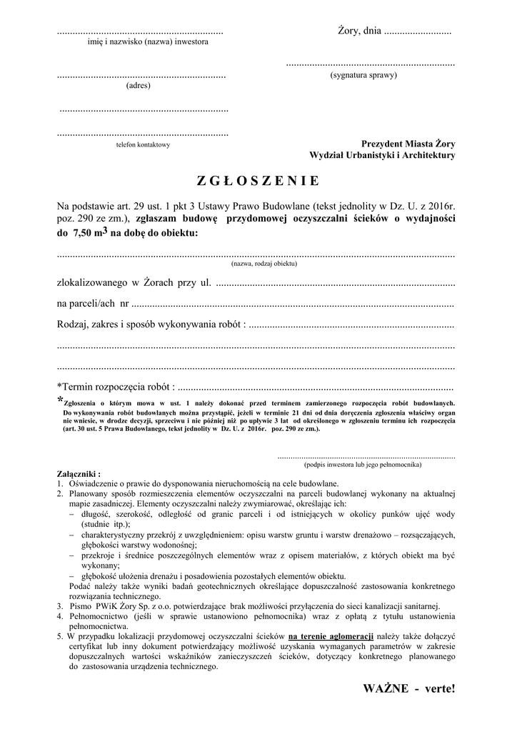 ................................................................ Żory, dnia .......................... imię i nazwisko (nazwa) inwestora ................................................................. ................................................................. (sygnatura sprawy) (adres) ................................................................. .................................................................. Prezydent Miasta Żory Wydział Urbanistyki i Architektury telefon kontaktowy ZGŁOSZENIE Na podstawie art. 29 ust. 1 pkt 3 Ustawy Prawo Budowlane (tekst jednolity w Dz. U. z 2016r. poz. 290 ze zm.), zgłaszam budowę przydomowej oczyszczalni ścieków o wydajności do 7,50 m3 na dobę do obiektu: ......................................................................................................................................................... (nazwa, rodzaj obiektu) zlokalizowanego w Żorach przy ul. ............................................................................................ na parceli/ach nr ............................................................................................................................ Rodzaj, zakres i sposób wykonywania robót : ............................................................................... ......................................................................................................................................................... ......................................................................................................................................................... *Termin rozpoczęcia robót : .......................................................................................................... *Zgłoszenia o którym mowa w ust. 1 należy dokonać przed terminem zamierzonego rozpoczęcia robót budowlanych. Do wykonywania robót budowlanych można przystąpić, jeżeli w terminie 21 dni od dnia doręczenia zgłoszenia właściwy organ nie wniesie, w drodze decyzji, sprzeciwu i nie później niż po upływie 3 lat od określonego w zgłoszeniu terminu ich rozpoczęcia (art. 30 ust. 5 Prawa Budowlanego, tekst jednolity w Dz. U. z 2016r. poz. 290 ze zm.). .................................................................................. (podpis inwestora lub jego pełnomocnika) Załączniki : 1. Oświadczenie o prawie do dysponowania nieruchomością na cele budowlane. 2. Planowany sposób rozmieszczenia elementów oczyszczalni na parceli budowlanej wykonany na aktualnej mapie zasadniczej. Elementy oczyszczalni należy zwymiarować, określając ich: długość, szerokość, odległość od granic parceli i od istniejących w okolicy punków ujęć wody (studnie itp.); charakterystyczny przekrój z uwzględnieniem: opisu warstw gruntu i warstw drenażowo – rozsączających, głębokości warstwy wodonośnej; przekroje i średnice poszczególnych elementów wraz z opisem materiałów, z których obiekt ma być wykonany; głębokość ułożenia drenażu i posadowienia pozostałych elementów obiektu. Podać należy także wyniki badań geotechnicznych określające dopuszczalność zastosowania konkretnego rozwiązania technicznego. 3. Pismo PWiK Żory Sp. z o.o. potwierdzające brak możliwości przyłączenia do sieci kanalizacji sanitarnej. 4. Pełnomocnictwo (jeśli w sprawie ustanowiono pełnomocnika) wraz z opłatą z tytułu ustanowienia pełnomocnictwa. 5. W przypadku lokalizacji przydomowej oczyszczalni ścieków na terenie aglomeracji należy także dołączyć certyfikat lub inny dokument potwierdzający możliwość uzyskania wymaganych parametrów w zakresie dopuszczalnych wartości wskaźników zanieczyszczeń ścieków, dotyczący konkretnego planowanego do zastosowania urządzenia technicznego. WAŻNE - verte! Informacja w sprawie przydomowych oczyszczalni ścieków realizowanych po 01.01.2016r. Zgodnie z art. 5 ust 1 pkt 2 ustawy z dnia 13 września 1996r. o utrzymaniu czystości i porządku w gminach (Dz. U. z 2013r. poz. 1399 ze zm.): Właściciel nieruchomości ma obowiązek przyłączenia nieruchomości do istniejącej sieci kanalizacyjnej lub, w przypadku gdy budowa sieci kanalizacyjnej jest technicznie lub ekonomicznie nieuzasadniona, wyposażenie nieruchomości w zbiornik bezodpływowy nieczystości ciekłych lub w przydomową oczyszczalnię ścieków bytowych, spełniające wymagania określone w przepisach odrębnych; przyłączenie nieruchomości do sieci kanalizacyjnej nie jest obowiązkowe, jeżeli nieruchomość jest wyposażona w przydomową oczyszczalnię ścieków spełniającą wymagania określone w przepisach odrębnych. W przepisach odrębnych czyli w § 13 pkt 6 rozporządzenia Ministra Środowiska z dnia 18 listopada 2014r. w sprawie warunków, jakie należy spełnić przy wprowadzaniu ścieków do wód lub do ziemi, oraz w sprawie substancji szczególnie szkodliwych dla środowiska wodnego (Dz. U. poz. 1800) mówi się: Ścieki pochodzące z własnego gospodarstwa domowego lub rolnego, zlokalizowanego w aglomeracji1, mogą być wprowadzane do ziemi, w granicach gruntu stanowiącego własność wprowadzającego, jeżeli są spełnione łącznie następujące warunki: 1) ich ilość nie przekracza 5,0 m3 na dobę; 2) nie przekraczają najwyższych dopuszczalnych wartości wskaźników zanieczyszczeń właściwych dla RLM aglomeracji, na obszarze której zlokalizowane jest gospodarstwo, określonych w załączniku nr 3 do rozporządzenia; 3) miejsce ich wprowadzania do ziemi jest oddzielone warstwą gruntu o miąższości co najmniej 1,5 m od najwyższego użytkowego poziomu wodonośnego wód podziemnych. Zgodnie z załącznikiem nr 3 dla „Aglomeracji Żory” ma zastosowanie wskaźnik RLM aglomeracji w przedziale 15 000 – 99 999 tzn.: BZT5 - 15 mg O2/l albo min. 90 % redukcji, ChZT - 125 mg O2/l albo min. 75 % redukcji, zawiesina ogólna - 35 mg/l albo min. 90 % redukcji, azot ogólny - 15 mg N/l albo min. 70- 80 % redukcj