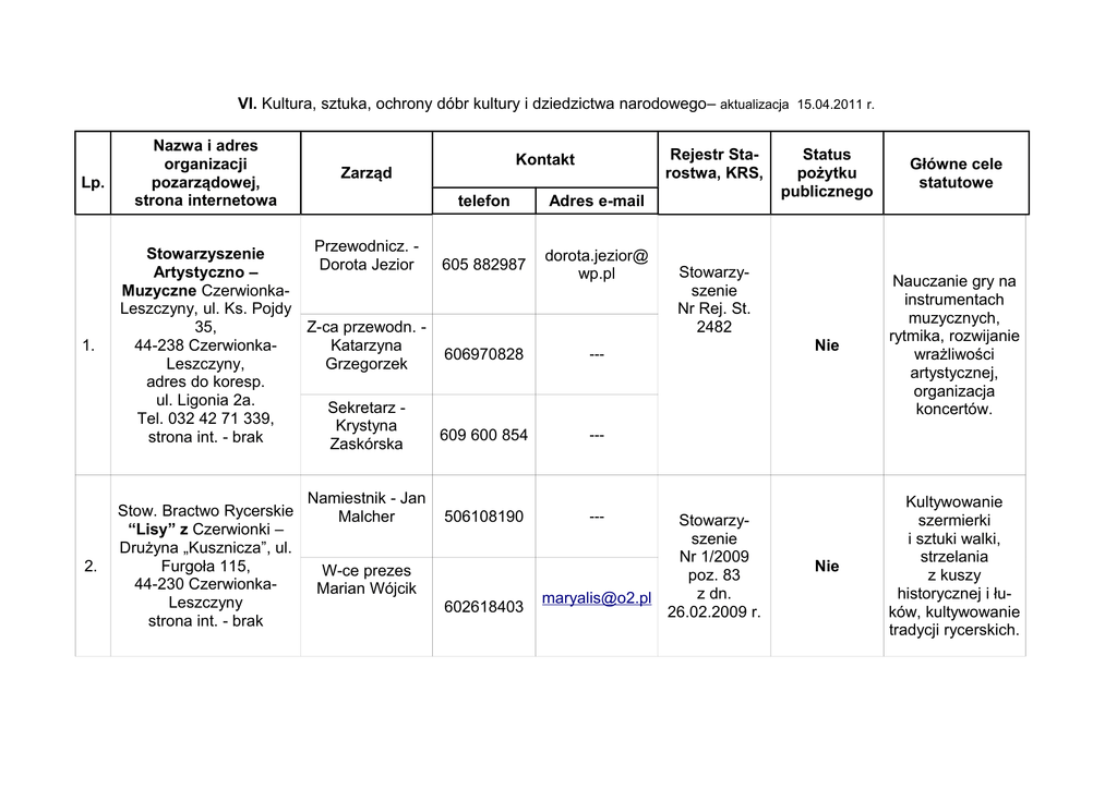 VI. Kultura, sztuka, ochrony dóbr kultury i dziedzictwa narodowego– aktualizacja 15.04.2011 r. Lp. 1. 2. Nazwa i adres organizacji pozarządowej, strona internetowa telefon Przewodnicz. Stowarzyszenie Dorota Jezior 605 882987 Artystyczno – Muzyczne CzerwionkaLeszczyny, ul. Ks. Pojdy 35, Z-ca przewodn. 44-238 CzerwionkaKatarzyna 606970828 Leszczyny, Grzegorzek adres do koresp. ul. Ligonia 2a. Sekretarz Tel. 032 42 71 339, Krystyna 609 600 854 strona int. - brak Zaskórska Stow. Bractwo Rycerskie “Lisy” z Czerwionki – Drużyna „Kusznicza”, ul. Furgoła 115, 44-230 CzerwionkaLeszczyny strona int. - brak Namiestnik - Jan Malcher Rejestr Starostwa, KRS, Kontakt Zarząd 506108190 W-ce prezes Marian Wójcik 602618403 Adres e-mail dorota.jezior@ wp.pl Status pożytku publicznego Główne cele statutowe Nie Nauczanie gry na instrumentach muzycznych, rytmika, rozwijanie wrażliwości artystycznej, organizacja koncertów. Nie Kultywowanie szermierki i sztuki walki, strzelania z kuszy historycznej i łuków, kultywowanie tradycji rycerskich. Stowarzyszenie Nr Rej. St. 2482 --- --- --- Stowarzyszenie Nr 1/2009 poz. 83 z dn. [email protected] 26.02.2009 r. Lp. 3. 4. Nazwa i adres organizacji pozarządowej, strona internetowa Stowarzyszenie Kulturalno-Społeczne „Orkiestra Dębieńsko”, ul. Ligonia 2a, Tel. 0324311239 44-230 CzerwionkaLeszczyny strona int. http://www.fopszrybnik. nazwa.pl/ip/orkiestra/ Stowarzyszenie „Najważniejsza jest tradycja”, 44-230 CzerwionkaLeszczyny ul. Wolności 2a. Prezes Wojciech Pukowiec, W-ce prezes Konrad Hajduk Skarbnik Sabina Kierpiec telefon Adres e-mail 608 656 926, 32 4311239 wojciech. pukowiec@i nteria.pl --- --- Stanisław Mich, Stanisław Chlubek Prezes - Łukasz Gamza --- Stowarzyszenie Nr 0000317650 Status pożytku publicznego Nie --- Główne cele statutowe Propagowanie twórczości muzycznej , wspieranie amatorskiego ruchu muzycznego. --- 695 347 550 Z-ca prezesa 792 937 877 Marcin Szołtysek Skarbnik/sekretarz - Marcin Malich Rejestr Starostwa, KRS, Kontakt Zarząd 605371450 egon_@ poczta.onet.pl --- --- 0000342435 z dn. 25.11.2009 r. Nie Upowszechn. i rozwój sportu, turystyki i rekreacji promocja meczów p. nożnej, koszykówki i innych zawodów sport., przeciwdziałanie patologiom społ. poprzez sport wśród dzieci i młodzieży.