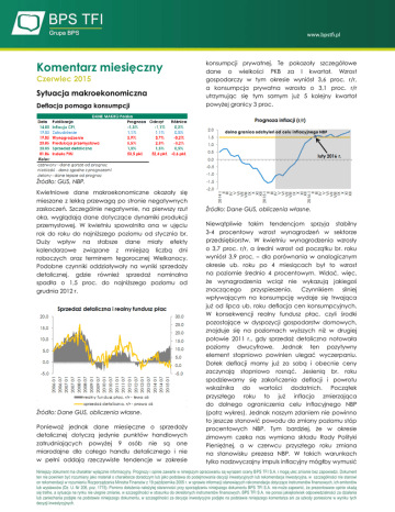 Komentarz miesięczny Czerwiec 2015 Sytuacja makroekonomiczna Deflacja pomaga konsumpcji konsumpcji prywatnej. Te pokazały szczegółowe dane o wielkości PKB za I kwartał. Wzrost gospodarczy w tym okresie wyniósł 3,6 proc. r/r, a konsumpcja prywatna wzrosła o 3,1 proc. r/r utrzymując się tym samym już 5 kolejny kwartał powyżej granicy 3 proc. Źródło: GUS, NBP. Kwietniowe dane makroekonomiczne okazały się mieszane z lekką przewagą po stronie negatywnych zaskoczeń. Szczególnie negatywnie, na pierwszy rzut oka, wyglądają dane dotyczące dynamiki produkcji przemysłowej. W kwietniu spowolniła ona w ujęciu rok do roku do najniższego poziomu od stycznia br. Duży wpływ na słabsze dane miały efekty kalendarzowe związane z mniejszą liczbą dni roboczych oraz terminem tegorocznej Wielkanocy. Podobne czynniki oddziaływały na wyniki sprzedaży detalicznej, gdzie również sprzedaż nominalna spadła o 1,5 proc. do najniższego poziomu od grudnia 2012 r. Źródło: Dane GUS, obliczenia własne. Ponieważ jednak dane miesięczne o sprzedaży detalicznej dotyczą jedynie punktów handlowych zatrudniających powyżej 9 osób nie są one miarodajne dla całego handlu detalicznego i nie w pełni oddają rzeczywiste tendencje w zakresie Źródło: Dane GUS, obliczenia własne. Niewątpliwie takim tendencjom sprzyja stabilny 3-4 procentowy wzrost wynagrodzeń w sektorze przedsiębiorstw. W kwietniu wynagrodzenia wzrosły o 3,7 proc. r/r, a średni wzrost od początku br. roku wyniósł 3,9 proc. – dla porównania w analogicznym okresie ub. roku po 4 miesiącach był to wzrost na poziomie średnio 4 procentowym. Widać, więc, że wynagrodzenia wciąż nie wykazują jakiegoś znaczącego przyspieszenia. Czynnikiem silniej wpływającym na konsumpcję wydaje się trwająca już od lipca ub. roku deflacja cen konsumpcyjnych. W konsekwencji realny fundusz płac, czyli środki pozostające w dyspozycji gospodarstw domowych, znajduje się na poziomach wyższych niż w drugiej połowie 2011 r., gdy sprzedaż detaliczna notowała poziomy dwucyfrowe. Jednak ten pozytywny element stopniowo powinien ulegać wyczerpaniu. Dołek deflacji mamy już za sobą i obecnie ceny zaczynają stopniowo rosnąć. Jesienią br. roku spodziewamy się zakończenia deflacji i powrotu wskaźnika do wartości dodatnich. Początek przyszłego roku to już inflacja zmierzająca do dolnego ograniczenia celu inflacyjnego NBP (patrz wykres). Jednak naszym zdaniem nie powinno to jeszcze stanowić powodu do zmiany poziomu stóp procentowych NBP. Tym bardziej, że w okresie zimowym czeka nas wymiana składu Rady Polityki Pieniężnej, a w czerwcu przyszłego roku zmiana na stanowisku prezesa NBP. W takich warunkach tylko nadzwyczajny impuls inflacyjny mógłby wymusić Niniejszy dokument ma charakter wyłącznie informacyjny. Prognozy i opinie zawarte w niniejszym opracowaniu są wyrazem oceny BPS TFI S.A. i mogą ulec zmianie bez zapowiedzi. Dokument ten nie powinien być rozumiany jako materiał o charakterze doradczym lub jako podstawa do podejmowania decyzji inwestycyjnych lub rekomendacja inwestycyjna, w szczególności nie stanowi on rekomendacji w rozumieniu Rozporządzenia Ministra Finansów z 19 października 2005 r. w sprawie informacji stanowiących rekomendacje dotyczące instrumentów finansowych, ich emitentów lub wystawców (Dz. U. Nr 206, poz. 1715). Pomimo dołożenia należytej staranności przy sporządzaniu niniejszego dokumentu BPS TFI S.A. nie może zapewnić, że prezentowane opinie okażą się trafne, a sytuacja na rynku nie ulegnie zmianie, w szczególności w stosunku do określonych instrumentów finansowych. BPS TFI S.A. nie ponosi jakiejkolwiek odpowiedzialności za działania lub zaniechania podjęte na podstawie niniejszego dokumentu, w szczególności za decyzje inwestycyjne podjęte na podstawie niniejszego komentarza ani za szkody poniesione w wyniku tych decyzji inwestycyjnych. szybsze podwyżki. W naszej ocenie nie należy się jednak spodziewać takiego scenariusza. Rynek akcji Ryzyko polityczne i dobre fundamenty Sell in may and go away. Rzeczywiście w maju taka strategia byłaby pożądana. Oba główne indeksy warszawskiej giełdy osiągnęły w tym miesiącu tegoroczne szczyty, aby następnie głęboko zanurkować. Jeszcze w pierwszej dekadzie miesiąca WIG i WIG20 znajdowały się odpowiednio blisko poziomów 57 400 i 2540 pkt. Na koniec miesiąca widzieliśmy je już jednak na poziomach 55 530 i 2430 pkt., Zatem od szczytu notowań do końca miesiąca główny indeks stracił 3,2 proc., a indeks WIG20 4,4 proc. Źródło: Dane Bloomberg. Również średni miesięczny poziom obrotów nie wzbudza jakiś specjalnych zachwytów. Oczywiście maj jest drugim kolejnym miesiącem po kwietniu, w którym obroty są wyższe niż w analogicznym okresie roku poprzedniego, ale poziom 850 mln zł nie może zachwycać. Tym bardziej ze odnosi się do okresu po wejściu w życie reformy OFE. Źródło: Obliczenia własne. W maju kilka czynników złożyło się na pogorszenie koniunktury na giełdzie. Po pierwsze to greckie never ending story – niekończąca się historia negocjacji, braku porozumienia i obaw o wyjście tego kraju ze strefy euro. Ten czynnik ciąży giełdom europejskim, ciąży i parkietowi warszawskiemu. Tymczasem w czerwcu Grecja ma spłacić blisko 1,6 mld EUR Międzynarodowemu Funduszowi Walutowemu. Jeszcze większe płatności przypadają na lipiec i sierpień (ok. 4,5 i 3,2 mld EUR). Na rynkach może, więc być nerwowo. Po wtóre kwestia pierwszej podwyżki stóp procentowych w USA. Systematyczna poprawa na tamtejszym rynku pracy zdaje się przybliżać ten moment. Obecnie stopa bezrobocia w Stanach Zjednoczonych znajduje się już na takich poziomach, na jakich znajdowała się w momencie rozpoczęcia ostatniego cyklu podwyżek stóp procentowych. Ten czynnik może skutkować realokacją kapitałów, co na GPW może być szczególnie dotkliwe dla wycen sp