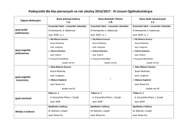Podręczniki dla klas pierwszych na rok szkolny 2016/2017 - III Liceum Ogólnokształcące Zajęcia edukacyjne język polski podstawowy język angielski podstawowy klasa animacji kultury 1 la klasa dietetyki i fitness 1 lb Zrozumieć tekst – zrozumieć człowieka Zrozumieć tekst – zrozumieć człowieka Zrozumieć tekst – zrozumieć człowieka D.Chemperek, A. Kalbarczyk D.Chemperek, A. Kalbarczyk D.Chemperek, A. Kalbarczyk wyd. WSIP, cz. 1 wyd. WSIP, cz. 1 wyd. WSIP, cz. 1 1. My Matura Success 1. My Matura Success 1. My Matura Success Stuart McKinlay Stuart McKinlay Stuart McKinlay wyd. Longman wyd. Longman wyd. Longman 2. Oxford Solutions 2. Oxford Solutions 2. Oxford Solutions wyd. Oxford wyd. Oxford 3. Password MacMillan wyd. Oxford 3. Password MacMillan (wybór we IX) 3. Password MacMillan (wybór we IX) 1. New Matura Success język angielski rozszerzony klasa służb ratowniczych 1 lc (wybór we IX) 1. New Matura Success Stuart McKinlay Stuart McKinlay wyd. Longman wyd. Longman - 2. Matura Explorer wyd. Nowa Era 2. Matura Explorer wyd. Nowa Era (wybór we IX) Fokus cz. 1 język niemiecki Wiedza o kulturze (wybór we IX) Fokus cz. 1 Fokus cz. 1 A. Kryczyńska-Pham, J. Szczęk A. Kryczyńska-Pham, J. Szczęk A. Kryczyńska-Pham, J. Szczęk wyd. WSIP wyd. WSIP wyd. WSIP Spotkania z kulturą Spotkania z kulturą Spotkania z kulturą M. Bokiniec i zespół M. Bokiniec i zespół M. Bokiniec i zespół wyd. Nowa Era wyd. Nowa Era wyd. Nowa Era historia podstawowy wiedza o społeczeństwie podstawowy Poznać przeszłość. Wiek XX. Historia. Po prostu. Zakres podstawowy Historia. Po prostu. Zakres podstawowy Zakres podstawowy R. Dolecki, K. Gutowski, J. Smoleński R. Dolecki, K. Gutowski, J. Smoleński S. Roszak, J. Kłaczkow, wyd. Nowa Era wyd. WSIP wyd. WSIP Po prostu WOS. Zakres podstawowy Po prostu WOS. Zakres podstawowy W centrum uwagi. Zakres podstawowy M. Grondas, J. Żmijski M. Grondas, J. Żmijski A. Janicki wyd. WSIP wyd. WSIP wyd. Nowa Era Krok w przedsiębiorczość Krok w przedsiębiorczość Krok w przedsiębiorczość Z. Makieła, T. Rachwał Z. Makieła, T. Rachwał wyd. Nowa Era wyd. Nowa Era wyd. Nowa Era Oblicza geografii Oblicza geografii Oblicza geografii R. Uliszak, K. Wiederman R. Uliszak, K. Wiederman R. Uliszak, K. Wiederman wyd. Nowa Era wyd. Nowa Era wyd. Nowa Era Biologia na czasie. Zakres podst. Biologia na czasie. Zakres podst. Biologia na czasie. Zakres podst. E. Bonar, W.Krzeszowiec-Jeleń, E. Bonar, W.Krzeszowiec-Jeleń, E. Bonar, W.Krzeszowiec-Jeleń, S.Czachorowski, wyd. Nowa Era S.Czachorowski, wyd. Nowa Era S.Czachorowski, wyd. Nowa Era Karty Pracy, zakres podstawowy Karty Pracy, zakres podstawowy Karty Pracy, zakres podstawowy J. Pawłowski J. Pawłowski J. Pawłowski wyd. Nowa Era wyd. Nowa Era wyd. Nowa Era Ciekawi świata. Zakres podstawowy Ciekawi świata. Zakres podstawowy Ciekawi świata. Zakres podstawowy J. Meszko, wyd. Operon J. Meszko, wyd. Operon J. Meszko, wyd. Operon Świat fizyki Świat fizyki Świat fizyki red. M. Fiałkowska red. M. Fiałkowska red. M. Fiałkowska wyd."ZamKor" P. Sagnowski i Wspólnicy wyd."ZamKor" P. Sagnowski i Wspólnicy wyd."ZamKor" P. Sagnowski i Wspólnicy podstawy przedsiębiorczości Z. Makieła, T. Rachwał geografia podstawowy biologia podstawowy chemia podstawowy fizyka podstawowy matematyka informatyka podstawowy edukacja dla bezpieczeństwa religia etyka służby ratownicze edukacja zdrowotna Odkrywamy na nowo. Matematyka 1. Odkrywamy na nowo. Matematyka 1. Odkrywamy na nowo. Matematyka 1. Zakres podstawowy. Zakres podstawowy. Zakres podstawowy. A. Jatczak, M. Ciołkosz, P. Ciołkosz A. Jatczak, M. Ciołkosz, P. Ciołkosz A. Jatczak, M. Ciołkosz, P. Ciołkosz wyd. Operon wyd. Operon wyd. Operon Po prostu informatyka Po prostu informatyka Po prostu informatyka Zdzisław Nowakowski, wyd. WSIP Zdzisław Nowakowski, wyd. WSIP Zdzisław Nowakowski, wyd. WSIP Po prostu EDB. Zakres podstawowy Po prostu EDB. Zakres podstawowy Po prostu EDB. Zakres podstawowy + ćwiczenia + ćwiczenia + ćwiczenia B. Breitkopf, M. Cieśla, wyd. WSiP B. Breitkopf, M. Cieśla, wyd. WSiP B. Breitkopf, M. Cieśla, wyd. WSiP Być świadkiem zmartwychwstałego w Kościele Być świadkiem zmartwychwstałego w Kościele Być świadkiem zmartwychwstałego w Kościele Red. zbiorowa Red. zbiorowa Red. zbiorowa Wydawnictwo Katechetyczne Warszawa Wydawnictwo Katechetyczne Warszawa Wydawnictwo Katechetyczne Warszawa Etyka. Zakres podstawowy Etyka. Zakres podstawowy Etyka. Zakres podstawowy P. Kołodziński, J. Kapiszewski P. Kołodziński, J. Kapiszewski P. Kołodziński, J. Kapiszewski wyd. Operon wyd. Operon wyd. Operon - - - Edukacja zdrowotna M. Wolicki, B. Wolny, wyd. KUL brak podręcznika -