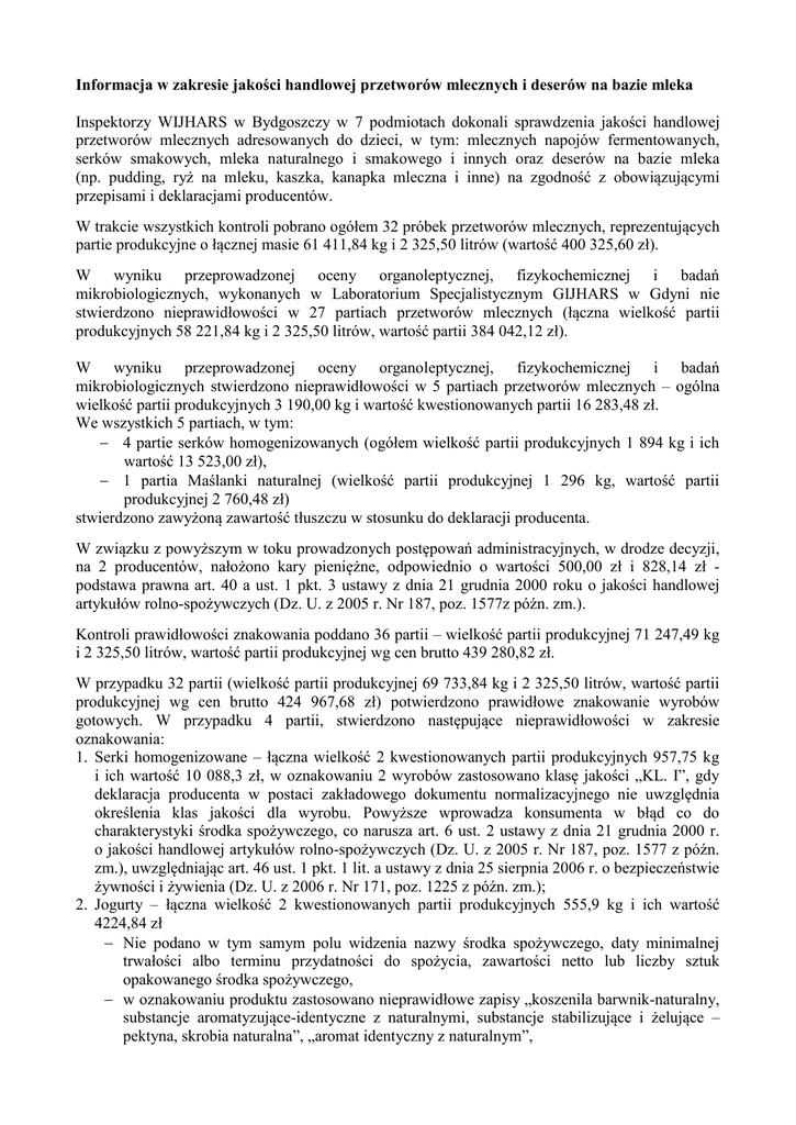 Informacja w zakresie jakości handlowej przetworów mlecznych i deserów na bazie mleka Inspektorzy WIJHARS w Bydgoszczy w 7 podmiotach dokonali sprawdzenia jakości handlowej przetworów mlecznych adresowanych do dzieci, w tym: mlecznych napojów fermentowanych, serków smakowych, mleka naturalnego i smakowego i innych oraz deserów na bazie mleka (np. pudding, ryż na mleku, kaszka, kanapka mleczna i inne) na zgodność z obowiązującymi przepisami i deklaracjami producentów. W trakcie wszystkich kontroli pobrano ogółem 32 próbek przetworów mlecznych, reprezentujących partie produkcyjne o łącznej masie 61 411,84 kg i 2 325,50 litrów (wartość 400 325,60 zł). W wyniku przeprowadzonej oceny organoleptycznej, fizykochemicznej i badań mikrobiologicznych, wykonanych w Laboratorium Specjalistycznym GIJHARS w Gdyni nie stwierdzono nieprawidłowości w 27 partiach przetworów mlecznych (łączna wielkość partii produkcyjnych 58 221,84 kg i 2 325,50 litrów, wartość partii 384 042,12 zł). W wyniku przeprowadzonej oceny organoleptycznej, fizykochemicznej i badań mikrobiologicznych stwierdzono nieprawidłowości w 5 partiach przetworów mlecznych – ogólna wielkość partii produkcyjnych 3 190,00 kg i wartość kwestionowanych partii 16 283,48 zł. We wszystkich 5 partiach, w tym: 4 partie serków homogenizowanych (ogółem wielkość partii produkcyjnych 1 894 kg i ich wartość 13 523,00 zł), 1 partia Maślanki naturalnej (wielkość partii produkcyjnej 1 296 kg, wartość partii produkcyjnej 2 760,48 zł) stwierdzono zawyżoną zawartość tłuszczu w stosunku do deklaracji producenta. W związku z powyższym w toku prowadzonych postępowań administracyjnych, w drodze decyzji, na 2 producentów, nałożono kary pieniężne, odpowiednio o wartości 500,00 zł i 828,14 zł podstawa prawna art. 40 a ust. 1 pkt. 3 ustawy z dnia 21 grudnia 2000 roku o jakości handlowej artykułów rolno-spożywczych (Dz. U. z 2005 r. Nr 187, poz. 1577z późn. zm.). Kontroli prawidłowości znakowania poddano 36 partii – wielkość partii produkcyjnej 71 247,49 kg i 2 325,50 litrów, wartość partii produkcyjnej wg cen brutto 439 280,82 zł. W przypadku 32 partii (wielkość partii produkcyjnej 69 733,84 kg i 2 325,50 litrów, wartość partii produkcyjnej wg cen brutto 424 967,68 zł) potwierdzono prawidłowe znakowanie wyrobów gotowych. W przypadku 4 partii, stwierdzono następujące nieprawidłowości w zakresie oznakowania: 1. Serki homogenizowane – łączna wielkość 2 kwestionowanych partii produkcyjnych 957,75 kg i ich wartość 10 088,3 zł, w oznakowaniu 2 wyrobów zastosowano klasę jakości „KL. I”, gdy deklaracja producenta w postaci zakładowego dokumentu normalizacyjnego nie uwzględnia określenia klas jakości dla wyrobu. Powyższe wprowadza konsumenta w błąd co do charakterystyki środka spożywczego, co narusza art. 6 ust. 2 ustawy z dnia 21 grudnia 2000 r. o jakości handlowej artykułów rolno-spożywczych (Dz. U. z 2005 r. Nr 187, poz. 1577 z późn. zm.), uwzględniając art. 46 ust. 1 pkt. 1 lit. a ustawy z dnia 25 sierpnia 2006 r. o bezpieczeństwie żywności i żywienia (Dz. U. z 2006 r. Nr 171, poz. 1225 z późn. zm.); 2. Jogurty – łączna wielkość 2 kwestionowanych partii produkcyjnych 555,9 kg i ich wartość 4224,84 zł Nie podano w tym samym polu widzenia nazwy środka spożywczego, daty minimalnej trwałości albo terminu przydatności do spożycia, zawartości netto lub liczby sztuk opakowanego środka spożywczego, w oznakowaniu produktu zastosowano nieprawidłowe zapisy „koszenila barwnik-naturalny, substancje aromatyzujące-identyczne z naturalnymi, substancje stabilizujące i żelujące – pektyna, skrobia naturalna”, „aromat identyczny z naturalnym”, w oznakowaniu środka spożywczego nie podano ilościowej zawartości składnika (wsadów owocowych – truskawki i wiśni), co wymagane jest jeżeli nazwa środka spożywczego jest kojarzona przez konsumenta z zawartością składnika oraz gdy składnik może charakteryzować środek spożywczy i odróżnić od innych. W wyniku postępowania administracyjnego w sprawie potwierdzonego nieprawidłowego oznakowania przetworów mlecznych, Kujawsko-Pomorski Wojewódzki Inspektor JHARS w Bydgoszczy wydał na podstawie art. 29 ust. 1 pkt. 2 ustawy z dnia 21 grudnia 2000 r. o jakości handlowej artykułów rolno-spożywczych (Dz. U. z 2005 r. Nr 187, poz. 1577, z późn. zm.) 4 decyzje administracyjne nakazujące zmianę oznakowania celem doprowadzenia do zgodności z obowiązującymi przepisami. W toku dalszego postępowania administracyjnego wydani 1 decyzję o karze pieniężnej (wysokość kary 1431,31 zł) na podstawie art. 40a ust. 1 pkt 3 ww. ustawy W trakcie przeprowadzonych kontroli nie stwierdzono wyrobów mleczarskich, które byłyby oznakowane w sposób sugerujący, że artykuł jest produktem pochodzącym z rolnictwa ekologicznego. Podczas kontroli nie stwierdzono obecności produktów posiadających chronione nazwy pochodzenia, chronione oznaczenia geograficzne lub będące gwarantowanymi tradycyjnymi specjalnościami. W kontrolowanych podmiotach nie stwierdzono obecności produktów posiadających chronione nazwy pochodzenia, chronione oznaczenia geograficzne lub będące gwarantowanymi tradycyjnymi specjalnościami. W toku kontroli potwierdzono dokonanie przez wszystkie kontrowane podmioty zgłoszenia prowadzonej działalności gospodarczej w zakresie produkcji, składowania, konfekcjonowania i obrotu właściwemu ze względu na miejsce zamieszkania lub siedziby podmiotu – wojewódzkiemu inspektorowi Jakości Handlowej Artykułów Rolno-Spożywczych (zgodnie z art. 12 ustawy z dnia 21 grudnia 2000 roku o jakości handlowej artykułów rolno-spożywczych). Ponadto, w związku ze stwierdzonymi nieprawidłowościami, Wojewódzki Inspektor JHARS w Bydgoszczy, wystosował do 3 producentów Zalecenia pokontrolne, wzywając ich do usunięcia w wyznaczonym terminie ww. niepraw