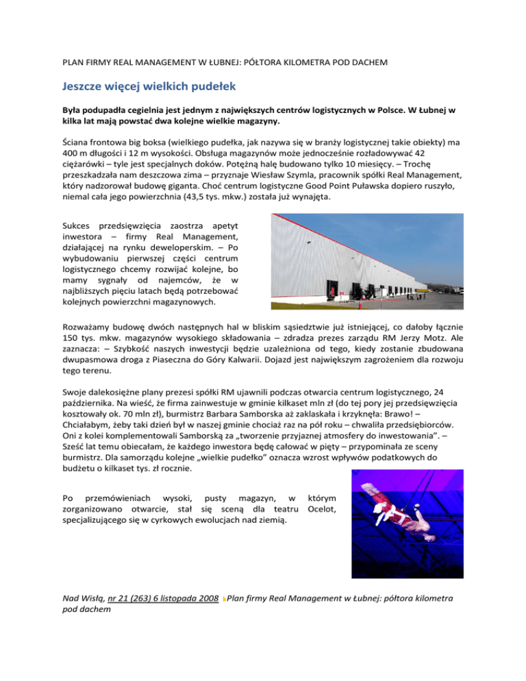 PLAN FIRMY REAL MANAGEMENT W ŁUBNEJ: PÓŁTORA KILOMETRA POD DACHEM Jeszcze więcej wielkich pudełek Była podupadła cegielnia jest jednym z największych centrów logistycznych w Polsce. W Łubnej w kilka lat mają powstać dwa kolejne wielkie magazyny. Ściana frontowa big boksa (wielkiego pudełka, jak nazywa się w branży logistycznej takie obiekty) ma 400 m długości i 12 m wysokości. Obsługa magazynów może jednocześnie rozładowywać 42 ciężarówki – tyle jest specjalnych doków. Potężną halę budowano tylko 10 miesięcy. – Trochę przeszkadzała nam deszczowa zima – przyznaje Wiesław Szymla, pracownik spółki Real Management, który nadzorował budowę giganta. Choć centrum logistyczne Good Point Puławska dopiero ruszyło, niemal cała jego powierzchnia (43,5 tys. mkw.) została już wynajęta. Sukces przedsięwzięcia zaostrza apetyt inwestora – firmy Real Management, działającej na rynku deweloperskim. – Po wybudowaniu pierwszej części centrum logistycznego chcemy rozwijać kolejne, bo mamy sygnały od najemców, że w najbliższych pięciu latach będą potrzebować kolejnych powierzchni magazynowych. Rozważamy budowę dwóch następnych hal w bliskim sąsiedztwie już istniejącej, co dałoby łącznie 150 tys. mkw. magazynów wysokiego składowania – zdradza prezes zarządu RM Jerzy Motz. Ale zaznacza: – Szybkość naszych inwestycji będzie uzależniona od tego, kiedy zostanie zbudowana dwupasmowa droga z Piaseczna do Góry Kalwarii. Dojazd jest największym zagrożeniem dla rozwoju tego terenu. Swoje dalekosiężne plany prezesi spółki RM ujawnili podczas otwarcia centrum logistycznego, 24 października. Na wieść, że firma zainwestuje w gminie kilkaset mln zł (do tej pory jej przedsięwzięcia kosztowały ok. 70 mln zł), burmistrz Barbara Samborska aż zaklaskała i krzyknęła: Brawo! – Chciałabym, żeby taki dzień był w naszej gminie chociaż raz na pół roku – chwaliła przedsiębiorców. Oni z kolei komplementowali Samborską za „tworzenie przyjaznej atmosfery do inwestowania”. – Sześć lat temu obiecałam, że każdego inwestora będę całować w pięty – przypominała ze sceny burmistrz. Dla samorządu kolejne „wielkie pudełko” oznacza wzrost wpływów podatkowych do budżetu o kilkaset tys. zł rocznie. Po przemówieniach wysoki, pusty magazyn, w którym zorganizowano otwarcie, stał się sceną dla teatru Ocelot, specjalizującego się w cyrkowych ewolucjach nad ziemią. Nad Wisłą, nr 21 (263) 6 listopada 2008 Plan firmy Real Management w Łubnej: półtora kilometra pod dachem