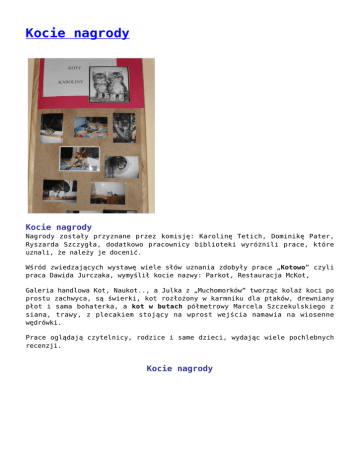 Kocie nagrody Kocie nagrody Nagrody zostały przyznane przez komisję: Karolinę Tetich, Dominikę Pater, Ryszarda Szczygła, dodatkowo pracownicy biblioteki wyróżnili prace, które uznali, że należy je docenić. Wśród zwiedzających wystawę wiele słów uznania zdobyły prace „Kotowo” czyli praca Dawida Jurczaka, wymyślił kocie nazwy: Parkot, Restauracja McKot, Galeria handlowa Kot, Naukot.., a Julka z „Muchomorków” tworząc kolaż koci po prostu zachwyca, są świerki, kot rozłożony w karmniku dla ptaków, drewniany płot i sama bohaterka, a kot w butach półmetrowy Marcela Szczekulskiego z siana, trawy, z plecakiem stojący na wprost wejścia namawia na wiosenne wędrówki. Prace oglądają czytelnicy, rodzice i same dzieci, wydając wiele pochlebnych recenzji. Kocie nagrody Nagrody zostały przyznane przez komisję: Karolinę Tetich, Dominikę Pater, Ryszarda Szczygła, dodatkowo pracownicy biblioteki wyróżnili prace, które uznali, że należy je docenić. Wśród zwiedzających wystawę wiele słów uznania zdobyły prace „Kotowo” czyli praca Dawida Jurczaka, wymyślił kocie nazwy: Parkot, Restauracja McKot, Galeria handlowa Kot, Naukot.., a Julka z „Muchomorków” tworząc kolaż koci po prostu zachwyca, są świerki, kot rozłożony w karmniku dla ptaków, drewniany płot i sama bohaterka, a kot w butach półmetrowy Marcela Szczekulskiego z siana, trawy, z plecakiem stojący na wprost wejścia namawia na wiosenne wędrówki. Prace oglądają czytelnicy, rodzice i same dzieci, wydając wiele pochlebnych recenzji. Po wnikliwej obserwacji przyznano następujące nagrody: Przedszkole Prace techniczne I miejsce – Burawski Oliwier II miejsce – Sawicz Kacper Prace plastyczne I miejsce – Krzewina Julia II miejsce – Jurczak Iga III miejsce – Stonik Agatka wyróżnienia: Dorosz Ada Fabiś Tomasz Biały Maksymilian Jabłonowska Ania Grupa „Leśne Ludki” Szkoła Podstawowa i Gimnazjum prace techniczne I miejsce – Marszolik Martyna II miejsce – Jurczak Dawid III miejsce – Pasierb Małgosia III miejsce – Szczekulski Marcel prace plastyczne I miejsce – Lonycz Justyna II miejsce – Kalmuk Marcin II miejsce – Rogulska Roksana III miejsce – Mandrak Kacper III miejsce – Krysińki Piotr wyróżnienia: Piotrowska Viktoria Janoszczyk Maria Szukiewicz Nikola Jędrej Mateusz Prusiewicz Ewelina Kudyba Katarzyna Furmaniak Sandra Pańczyk Małgosia