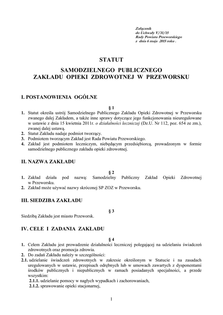 Załącznik do Uchwały V/31/15 Rady Powiatu Przeworskiego z dnia 6 maja 2015 roku . STATUT SAMODZIELNEGO PUBLICZNEGO ZAKŁADU OPIEKI ZDROWOTNEJ W PRZEWORSKU I. POSTANOWIENIA OGÓLNE §1 1. Statut określa ustrój Samodzielnego Publicznego Zakładu Opieki Zdrowotnej w Przeworsku zwanego dalej Zakładem, a także inne sprawy dotyczące jego funkcjonowania nieuregulowane w ustawie z dnia 15 kwietnia 2011r. o działalności leczniczej (Dz.U. Nr 112, poz. 654 ze zm.), zwanej dalej ustawą. 2. Statut Zakładu nadaje podmiot tworzący. 3. Podmiotem tworzącym Zakład jest Rada Powiatu Przeworskiego. 4. Zakład jest podmiotem leczniczym, niebędącym przedsiębiorcą, prowadzonym w formie samodzielnego publicznego zakładu opieki zdrowotnej. II. NAZWA ZAKŁADU §2 1. Zakład działa pod nazwą: Samodzielny Publiczny Zakład w Przeworsku. 2. Zakład może używać nazwy skróconej SP ZOZ w Przeworsku. Opieki Zdrowotnej III. SIEDZIBA ZAKŁADU §3 Siedzibą Zakładu jest miasto Przeworsk. IV. CELE I ZADANIA ZAKŁADU §4 1. Celem Zakładu jest prowadzenie działalności leczniczej polegającej na udzielaniu świadczeń zdrowotnych oraz promocja zdrowia. 2. Do zadań Zakładu należy w szczególności: 2.1. udzielanie świadczeń zdrowotnych w zakresie określonym w Statucie i na zasadach uregulowanych w ustawie, przepisach odrębnych lub w umowach zawartych z dysponentami środków publicznych i niepublicznych w ramach posiadanych specjalności, a przede wszystkim: 2.1.1. udzielanie pomocy w nagłych wypadkach i zachorowaniach, 2.1.2. sprawowanie opieki stacjonarnej, 1 2.1.3. udzielanie specjalistycznych i konsultacyjnych świadczeń ambulatoryjnych, 2.1.4. udzielanie świadczeń z zakresu rehabilitacji leczniczej, 2.1.5. wykonywanie badań diagnostycznych. 2.2. realizacja programów promocji zdrowia, 2.3. prowadzenie działalności szkoleniowej personelu medycznego, 2.4. współpraca z podmiotami leczniczymi, samorządami terytorialnymi i zawodowymi, instytucjami pomocy społecznej, organizacjami, związkami zawodowymi, 2.5. monitorowanie jakości świadczeń zdrowotnych, 2.6. realizacja zadań związanych z obronnością kraju, wynikających z odrębnych przepisów, 2.7. prowadzenie działalności dotyczącej bezpieczeństwa i higieny pracy oraz ochrony przeciwpożarowej w zakresie określonym odrębnymi przepisami, 2.8. wykonywanie innych zadań wynikających z odrębnych przepisów. V. ORGANY I STRUKTURA ORGANIZACYJNA ZAKŁADU §5 Organami Zakładu są: 1. Dyrektor, 2. Rada Społeczna. 1. 2. §6 Dyrektor kieruje Zakładem i reprezentuje go na zewnątrz. Dyrektor ponosi odpowiedzialność za zarządzanie Zakładem. §7 1. W Zakładzie działa Rada Społeczna, która jest organem inicjującym i opiniodawczym Rady Powiatu Przeworskiego oraz organem doradczym Dyrektora. 2. Radę Społeczną powołuje i odwołuje Rada Powiatu Przeworskiego. 3. W skład Rady Społecznej wchodzą: 3.1. jako przewodniczący – Starosta Przeworski lub osoba przez niego wyznaczona, 3.2. jako członkowie: 3.2.1. przedstawiciel Wojewody Podkarpackiego, 3.2.2. przedstawiciele wybrani przez Radę Powiatu Przeworskiego w liczbie 6 osób, 4. Członek Rady Społecznej może być odwołany przed upływem kadencji w przypadku: 4.1. rezygnacji z pełnionej funkcji, 4.2. utraty zdolności do pełnienia powierzonych obowiązków na skutek długotrwałej choroby, trwającej co najmniej 6 miesięcy, potwierdzonej orzeczeniem lekarskim, 4.3. zmiany przez organ, który go desygnował, 4.4. nieusprawiedliwionej nieobecności na trzech kolejnych posiedzeniach Rady Społecznej, 4.5. podjęcia zatrudnienia w Zakładzie, 4.6. śmierci. §8 1. Kadencja Rady Społecznej trwa cztery lata. 2. Sposób zwołania posiedzeń Rady Społecznej, tryb pracy i podejmowania uchwał określa Regulamin Działalności Rady Społecznej. §9 1. Do zadań Rady Społecznej należy: 1.1. przedstawianie podmiotowi tworzącemu Zakład wniosków i opinii w sprawach: 2 1.1.1. zbycia aktywów trwałych oraz zakupu lub przyjęcia darowizny nowej aparatury i sprzętu medycznego, 1.1.2. związanych z przekształceniem lub likwidacją Zakładu, rozszerzeniem lub ograniczeniem działalności, 1.1.3. przyznawania nagród Dyrektorowi, 1.1.4. rozwiązania stosunku pracy lub umowy cywilnoprawnej z Dyrektorem. 1.2. przedstawianie Dyrektorowi wniosków i opinii w sprawach: 1.2.1. planu finansowego, w tym planu inwestycyjnego, 1.2.2. rocznego sprawozdania z planu finansowego, w tym planu inwestycyjnego, 1.2.3. kredytów bankowych lub dotacji, 1.2.4. podziału zysku, 1.2.5. zbycia aktywów trwałych oraz zakupu lub przyjęcia darowizny nowej aparatury i sprzętu medycznego, 1.2.6. regulaminu organizacyjnego. 1.3. dokonywanie okresowych analiz skarg i wniosków wnoszonych przez pacjentów, z wyłączeniem spraw podlegających nadzorowi medycznemu, 1.4. opiniowanie wniosku Dyrektora w sprawie czasowego zaprzestania działalności leczniczej, 1.5. wykonywanie innych zadań określonych w ustawie i Statucie. § 10 Strukturę organizacyjną Zakładu tworzą: 1. Dyrektor oraz podległe bezpośrednio mu stanowiska: 1.1. Zastępca Dyrektora ds. Lecznictwa, 1.2. Główny Księgowy, 1.3. Naczelna Pielęgniarka. 2. Działy i Samodzielne stanowiska pracy podległe bezpośrednio Dyrektorowi lub Głównemu Księgowemu. 3. Przedsiębiorstwa Zakładu: 3.1. Samodzielny Publiczny Zakład Opieki Zdrowotnej – Lecznictwo Stacjonarne, strukturę którego tworzą następujące jednostki organizacyjne: 3.1.1. Szpital Rejonowy im. dr Henryka Jankowskiego, w skład którego wchodzą komórki organizacyjne określone w Regulaminie Organizacyjnym 3.1.2. Pracownie Diagnostyczne, w skład których wchodzą komórki organizacyjne określone w Regulaminie Organizacyjnym. 3.2. Samodzielny Publiczny Zakład Opieki Zdrowotnej – Lecznictwo Ambulatoryjne, strukturę którego tworzą następujące jednostki organizacyjne: 3.2.1. Poradnie Specjalistyczne, w skład których wchodzą komórki organizacyjne określon