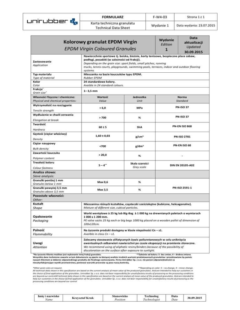 FORMULARZ F-W4-03 Strona 1 z 1 Karta techniczna granulatu Technical Data Sheet Wydanie 1 Data wydania: 23.07.2015 Data aktualizacji Updated 30.09.2015 Wydanie Edition Kolorowy granulat EPDM Virgin EPDM Virgin Coloured Granules 1 Nawierzchnie sportowe tj. boiska, bieżnie, korty tenisowe, bezpieczne place zabaw, podłogi, posadzki (w zależności od frakcji). Depending on the grain size: sport fields, small pitches, running trucks, tennis courts, playgrounds, swimming pools, terraces, indoor and outdoor flooring systems Mieszanka na bazie kauczuków typu EPDM. Rubber EPDM 24 standardowe kolory. Avaible in 24 standard colours. Zastosowanie Application Typ materiału Type of material Kolor Color Frakcja* Grain size* 1– 3,5 mm Własności fizyczne i chemiczne: Physical and chemical properties: Wytrzymałość na rozciąganie Tensile strength Wydłużenie w chwili zerwania Elongation at break Twardość Hardness Gęstość (ciężar właściwy) Density Ciężar nasypowy Bulk density Zawartość kauczuku Polymer content Trwałość koloru Colour fastness Wartość Value Jednostka Unit Norma Standard > 6,0 MPa PN-ISO 37 > 700 % PN-ISO 37 60 ± 5 ShA PN-EN ISO 868 1,60 ± 0,03 g/cm3 PN-ISO 2781 <700 g/dm3 PN-EN ISO 60 > 20,0 % - 5 – 4** Skala szarości Grey scale DIN EN 20105-A02 Max 0,6 % Max 3,5 % Analiza sitowa: Sieve analysis: Granulki poniżej 1 mm Granules below 1 mm Granulki powyżej 3,5 mm Granules above 3,5 mm Pozostałe własności: Other: Kształt Shape PN-ISO 2591-1 Mieszanina różnych kształtów, cząsteczki sześciokątne (kubiczne, heksagonalne). Mixture of different size, cubical particles. Opakowanie Packaging Worki wentylowe à 25 kg lub Big-Bag à 1 000 kg na drewnianych paletach o wymiarach 1 000 x 1 200 mm. PE valve sacks 25 kg each or big bags 1000 kg placed on a wooden pallet of dimension of 100x120cm. Palność Flammability Na życzenie produkt dostępny w klasie niepalności Cn – s1. Availble in class Cn – s1. Uwagi Attention Zalecamy stosowanie alifatycznych żywic poliuretanowych w celu uniknięcia ewentualnych odbarwień nawierzchni po czasie ekspozycji na promienie słoneczne. We recommend using of aliphatic resins/binders because of the possibility of discoloration on the surface after exposure to sunlight. *Na życzenie Klienta możliwe jest wykonanie innej frakcji granulatu. **Zależnie od koloru: 5- bez zmian, 4 – drobna zmiana. Wszystkie dane techniczne zawarte w tym dokumencie są oparte na bieżącej analizie średnich wartości produkowanych granulatów i przedstawione by pomóc naszym Klientom w doborze odpowiedniego produktu do finalnego zastosowania. Firma Unirubber Sp. z o.o. nie ponosi odpowiedzialności za niesatysfakcjonujące wyniki przetwórstwa, ponieważ warunki procesów są poza naszą kontrolą. *Other grain sizes on request. **Depending on color: 5 – no change, 4 – minor change. All technical data shown in this specification are based on the current analysis of mean value of the produced granulates. And are intended to help our customers in the choice of final application of the granulates. Unirubber Sp. z o.o. does not bear responsibility for unsatisfactory results of processing as the processing conditions are beyond our controlAll technical data shown in this specification are based on the current analysis of mean value of the produced granulates. And are intended to help our customers in the choice of final application of the granulates. Unirubber Sp. z o.o. does not bear responsibility for unsatisfactory results of processing as the processing conditions are beyond our control Imię i nazwisko Name Krzysztof Kruk Stanowisko Position Technolog Technologist Data Date 30.09.2015