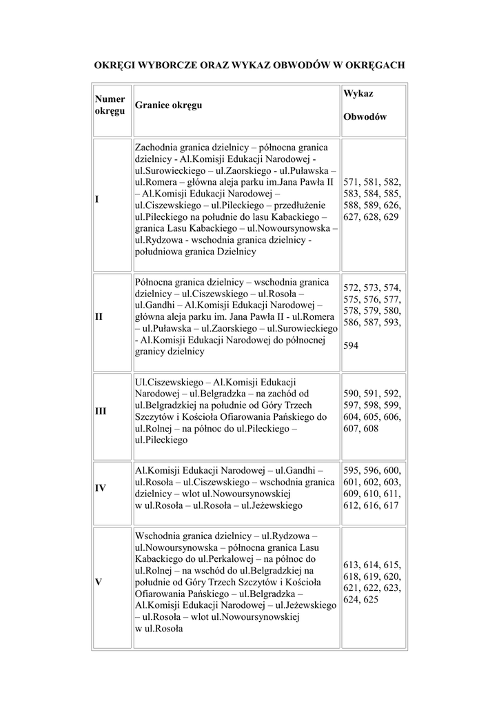 OKRĘGI WYBORCZE ORAZ WYKAZ OBWODÓW W OKRĘGACH Numer Granice okręgu okręgu I Zachodnia granica dzielnicy – północna granica dzielnicy - Al.Komisji Edukacji Narodowej ul.Surowieckiego – ul.Zaorskiego - ul.Puławska – ul.Romera – główna aleja parku im.Jana Pawła II – Al.Komisji Edukacji Narodowej – ul.Ciszewskiego – ul.Pileckiego – przedłużenie ul.Pileckiego na południe do lasu Kabackiego – granica Lasu Kabackiego – ul.Nowoursynowska – ul.Rydzowa - wschodnia granica dzielnicy południowa granica Dzielnicy II Północna granica dzielnicy – wschodnia granica dzielnicy – ul.Ciszewskiego – ul.Rosoła – ul.Gandhi – Al.Komisji Edukacji Narodowej – główna aleja parku im. Jana Pawła II - ul.Romera – ul.Puławska – ul.Zaorskiego – ul.Surowieckiego - Al.Komisji Edukacji Narodowej do północnej granicy dzielnicy Wykaz Obwodów 571, 581, 582, 583, 584, 585, 588, 589, 626, 627, 628, 629 572, 573, 574, 575, 576, 577, 578, 579, 580, 586, 587, 593, 594 III Ul.Ciszewskiego – Al.Komisji Edukacji Narodowej – ul.Belgradzka – na zachód od ul.Belgradzkiej na południe od Góry Trzech Szczytów i Kościoła Ofiarowania Pańskiego do ul.Rolnej – na północ do ul.Pileckiego – ul.Pileckiego 590, 591, 592, 597, 598, 599, 604, 605, 606, 607, 608 IV Al.Komisji Edukacji Narodowej – ul.Gandhi – ul.Rosoła – ul.Ciszewskiego – wschodnia granica dzielnicy – wlot ul.Nowoursynowskiej w ul.Rosoła – ul.Rosoła – ul.Jeżewskiego 595, 596, 600, 601, 602, 603, 609, 610, 611, 612, 616, 617 V Wschodnia granica dzielnicy – ul.Rydzowa – ul.Nowoursynowska – północna granica Lasu Kabackiego do ul.Perkalowej – na północ do ul.Rolnej – na wschód do ul.Belgradzkiej na południe od Góry Trzech Szczytów i Kościoła Ofiarowania Pańskiego – ul.Belgradzka – Al.Komisji Edukacji Narodowej – ul.Jeżewskiego – ul.Rosoła – wlot ul.Nowoursynowskiej w ul.Rosoła 613, 614, 615, 618, 619, 620, 621, 622, 623, 624, 625 Oraz trzy obwody odrębne: nr 111 – w Instytucie Hamatologii i Transfuzjologii (ul. Gandhi 14) nr 1141 – w Cenrum Onkologii (ul. Roentgena 5) nr 1142 – w Areszcie Śledczym Służewiec (ul. Kłobucka 5)