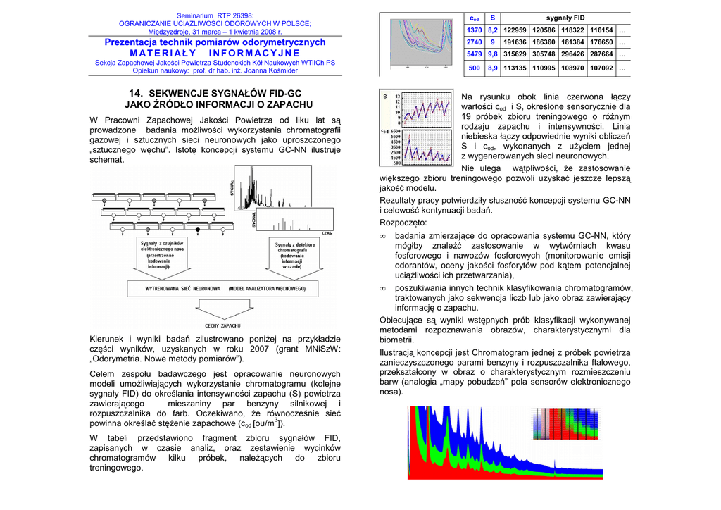 Seminarium RTP 26398: OGRANICZANIE UCIĄśLIWOŚCI ODOROWYCH W POLSCE; Międzyzdroje, 31 marca – 1 kwietnia 2008 r. cod 2740 500 • Celem zespołu badawczego jest opracowanie neuronowych modeli umoŜliwiających wykorzystanie chromatogramu (kolejne sygnały FID) do określania intensywności zapachu (S) powietrza zawierającego mieszaniny par benzyny silnikowej i rozpuszczalnika do farb. Oczekiwano, Ŝe równocześnie sieć 3 powinna określać stęŜenie zapachowe (cod [ou/m ]). W tabeli przedstawiono fragment zbioru sygnałów FID, zapisanych w czasie analiz, oraz zestawienie wycinków chromatogramów kilku próbek, naleŜących do zbioru treningowego. 191636 186360 181384 176650 … 8,9 113135 110995 108970 107092 … Na rysunku obok linia czerwona łączy wartości cod i S, określone sensorycznie dla 19 próbek zbioru treningowego o róŜnym rodzaju zapachu i intensywności. Linia niebieska łączy odpowiednie wyniki obliczeń S i cod, wykonanych z uŜyciem jednej z wygenerowanych sieci neuronowych. Nie ulega wątpliwości, Ŝe zastosowanie większego zbioru treningowego pozwoli uzyskać jeszcze lepszą jakość modelu. Rezultaty pracy potwierdziły słuszność koncepcji systemu GC-NN i celowość kontynuacji badań. Rozpoczęto: • Kierunek i wyniki badań zilustrowano poniŜej na przykładzie części wyników, uzyskanych w roku 2007 (grant MNiSzW: „Odorymetria. Nowe metody pomiarów”). 9 5479 9,8 315629 305748 296426 287664 … Sekcja Zapachowej Jakości Powietrza Studenckich Kół Naukowych WTiICh PS Opiekun naukowy: prof. dr hab. inŜ. Joanna Kośmider W Pracowni Zapachowej Jakości Powietrza od liku lat są prowadzone badania moŜliwości wykorzystania chromatografii gazowej i sztucznych sieci neuronowych jako uproszczonego „sztucznego węchu”. Istotę koncepcji systemu GC-NN ilustruje schemat. sygnały FID 1370 8,2 122959 120586 118322 116154 … Prezentacja technik pomiarów odorymetrycznych M ATERI AŁ Y INF ORM ACYJNE 14. SEKWENCJE SYGNAŁÓW FID-GC JAKO ŹRÓDŁO INFORMACJI O ZAPACHU S badania zmierzające do opracowania systemu GC-NN, który mógłby znaleźć zastosowanie w wytwórniach kwasu fosforowego i nawozów fosforowych (monitorowanie emisji odorantów, oceny jakości fosforytów pod kątem potencjalnej uciąŜliwości ich przetwarzania), poszukiwania innych technik klasyfikowania chromatogramów, traktowanych jako sekwencja liczb lub jako obraz zawierający informację o zapachu. Obiecujące są wyniki wstępnych prób klasyfikacji wykonywanej metodami rozpoznawania obrazów, charakterystycznymi dla biometrii. Ilustracją koncepcji jest Chromatogram jednej z próbek powietrza zanieczyszczonego parami benzyny i rozpuszczalnika ftalowego, przekształcony w obraz o charakterystycznym rozmieszczeniu barw (analogia „mapy pobudzeń” pola sensorów elektronicznego nosa).
