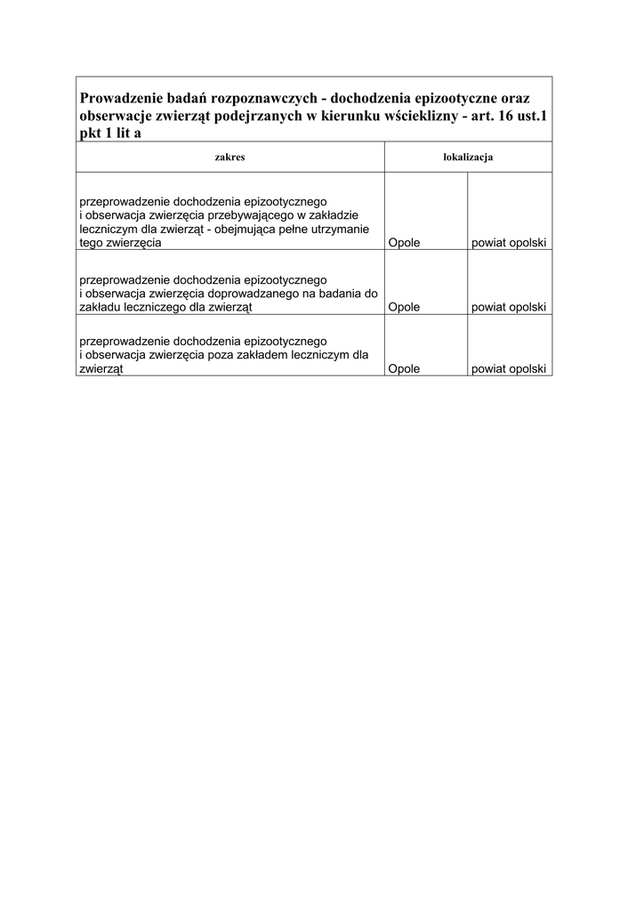 Prowadzenie badań rozpoznawczych - dochodzenia epizootyczne oraz obserwacje zwierząt podejrzanych w kierunku wścieklizny - art. 16 ust.1 pkt 1 lit a zakres przeprowadzenie dochodzenia epizootycznego i obserwacja zwierzęcia przebywającego w zakładzie leczniczym dla zwierząt - obejmująca pełne utrzymanie tego zwierzęcia lokalizacja Opole powiat opolski przeprowadzenie dochodzenia epizootycznego i obserwacja zwierzęcia doprowadzanego na badania do zakładu leczniczego dla zwierząt Opole powiat opolski przeprowadzenie dochodzenia epizootycznego i obserwacja zwierzęcia poza zakładem leczniczym dla zwierząt powiat opolski Opole