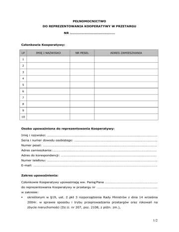 PEŁNOMOCNICTWO DO REPREZENTOWANIA KOOPERATYWY W PRZETARGU NR ………………….………………… Członkowie Kooperatywy: LP IMIĘ I NAZWISKO NR PESEL ADRES ZAMIESZKANIA 1 2 3 4 5 6 7 8 9 10 Osoba upoważniona do reprezentowania Kooperatywy: Imię i nazwisko: …………………………………………………………………………………………………………………….. Seria i numer dowodu osobistego: ……………………………………………………………………………………….. Numer pesel: …………………………………………………………………………………………………………………………. Adres zamieszkania:………………………………………………………………………………………………………………. Adres do korespondencji: …………………………………………………………………………………………………….. Numer telefonu: …………………………………………………………………………………………………………………….. E-mail: ……………………………………………………………………………………………………………………………………. Zakres upoważnienia: Członkowie Kooperatywy upoważniają ww. Panią/Pana ………………………………………………………. do reprezentowania Kooperatywy w przetargu nr ……………………………………………………………….. w zakresie: § określonym w §19, ust. 2 pkt 3 rozporządzenia Rady Ministrów z dnia 14 września 2004r. w sprawie sposobu i trybu przeprowadzania przetargów oraz rokowań na zbycie nieruchomości (Dz.U. nr 207, poz. 2108, z późn. zm.), 1/2 § wpłaty i ewentualnego zwrotu wadium, § kontaktów z pracownikami Urzędu Miejskiego Wrocławia w sprawach związanych z przetargiem Czytelne podpisy Członków Kooperatywy: 1. …………………………………………………………………………………………………………………………………………… 2. …………………………………………………………………………………………………………………………………………… 3. ………………………………………………………………………………………………………………………………………….. 4. …………………………………………………………………………………………………………………………………………… 5. …………………………………………………………………………………………………………………………………………… 6. …………………………………………………………………………………………………………………………………………… 7. …………………………………………………………………………………………………………………………………………… 8. …………………………………………………………………………………………………………………………………………… 9. …………………………………………………………………………………………………………………………………………… 10. ………………………………………………………………………………………………………………………………………….. 2/2
