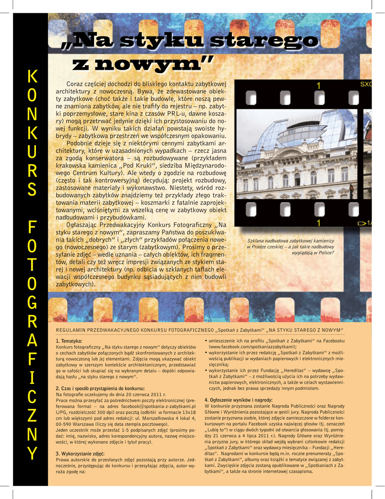 K O N K U R S F O T O G R A F I C Z N Y „Na styku starego z nowym” Coraz częściej dochodzi do bliskiego kontaktu zabytkowej architektury z nowoczesną. Bywa, że zdewastowane obiekty zabytkowe (choć także i takie budowle, które noszą pewne znamiona zabytków, ale nie trafiły do rejestru – np. zabytki poprzemysłowe, stare kina z czasów PRL-u, dawne koszary) mogą przetrwać jedynie dzięki ich przystosowaniu do nowej funkcji. W wyniku takich działań powstają swoiste hybrydy – zabytkowa przestrzeń we współczesnym opakowaniu. Podobnie dzieje się z niektórymi cennymi zabytkami architektury, które w uzasadnionych wypadkach – rzecz jasna za zgodą konserwatora – są rozbudowywane (przykładem krakowska kamienica „Pod Kruki”, siedziba Międzynarodowego Centrum Kultury). Ale wtedy o zgodzie na rozbudowę (często i tak kontrowersyjną) decydują: projekt rozbudowy, zastosowane materiały i wykonawstwo. Niestety, wśród rozbudowanych zabytków znajdziemy też przykłady złego traktowania materii zabytkowej – koszmarki z fatalnie zaprojektowanymi, wciśniętymi za wszelką cenę w zabytkowy obiekt nadbudowami i przybudówkami. Ogłaszając Przedwakacyjny Konkurs Fotograficzny „Na styku starego z nowym”, zapraszamy Państwa do poszukiwania takich „dobrych” i „złych” przykładów połączenia nowego (nowoczesnego) ze starym (zabytkowym). Prosimy o przesyłanie zdjęć – wedle uznania – całych obiektów, ich fragmentów, detali czy też wręcz impresji związanych ze stykiem starej i nowej architektury (np. odbicia w szklanych taflach elewacji współczesnego budynku sąsiadujących z nim budowli zabytkowych). Szklana nadbudowa zabytkowej kamienicy w Pradze czeskiej – a jak takie nadbudowy wyglądają w Polsce? REGULAMIN PRZEDWAKACYJNEGO KONKURSU FOTOGRAFICZNEGO „Spotkań z Zabytkami” „NA STYKU STAREGO Z NOWYM” 1. Tematyka: Konkurs fotograficzny „Na styku starego z nowym” dotyczy obiektów o cechach zabytków połączonych bądź skonfrontowanych z architekturą nowoczesną lub jej elementami. Zdjęcia mogą ukazywać obiekt zabytkowy w szerszym kontekście architektonicznym, przedstawiać go w całości lub skupiać się na wybranym detalu – dopóki odpowiadają hasłu „na styku starego z nowym”. 2. Czas i sposób przystąpienia do konkursu: Na fotografie oczekujemy do dnia 20 czerwca 2011 r. Prace można przesyłać za pośrednictwem poczty elektronicznej (preferowana forma) – na adres [email protected] (JPG, rozdzielczość 300 dpi) oraz pocztą (odbitki w formacie 13x18 cm lub większym) pod adres redakcji: ul. Marszałkowska 4 lokal 4, 00-590 Warszawa (liczy się data stempla pocztowego). Jeden uczestnik może przesłać 1-5 podpisanych zdjęć (prosimy podać: imię, nazwisko, adres korespondencyjny autora, nazwę miejscowości, w której wykonano zdjęcie i tytuł pracy). 3. Wykorzystanie zdjęć: Prawa autorskie do przesłanych zdjęć pozostają przy autorze. Jednocześnie, przystępując do konkursu i przesyłając zdjęcia, autor wyraża zgodę na: • umieszczenie ich na profilu „Spotkań z Zabytkami” na Facebooku (www.facebook.com/spotkaniazzabytkami); • wykorzystanie ich przez redakcję „Spotkań z Zabytkami” z możliwością publikacji w wydaniach papierowych i elektronicznych miesięcznika; • wykorzystanie ich przez Fundację „Hereditas” – wydawcę „Spotkań z Zabytkami” – z możliwością użycia ich na potrzeby wydawnictw papierowych, elektronicznych, a także w celach wystawienniczych, jednak bez prawa sprzedaży innym podmiotom. 4. Ogłoszenie wyników i nagrody: W konkursie przyznana zostanie Nagroda Publiczności oraz Nagrody Główne i Wyróżnienia pozostające w gestii jury. Nagroda Publiczności zostanie przyznana osobie, której zdjęcie zamieszczone w folderze konkursowym na portalu Facebook uzyska najwięcej głosów (tj. oznaczeń „Lubię to”) w ciągu dwóch tygodni od otwarcia głosowania (tj. pomiędzy 21 czerwca a 4 lipca 2011 r.). Nagrody Główne oraz Wyróżnienia przyzna jury, w którego skład wejdą wybrani członkowie redakcji „Spotkań z Zabytkami” oraz wydawcy miesięcznika – Fundacji „Hereditas”. Nagrodami w konkursie będą m.in. roczne prenumeraty „Spotkań z Zabytkami”, albumy oraz książki o tematyce związanej z zabytkami. Zwycięskie zdjęcia zostaną opublikowane w „Spotkaniach z Zabytkami”, a także na stronie internetowej czasopisma.