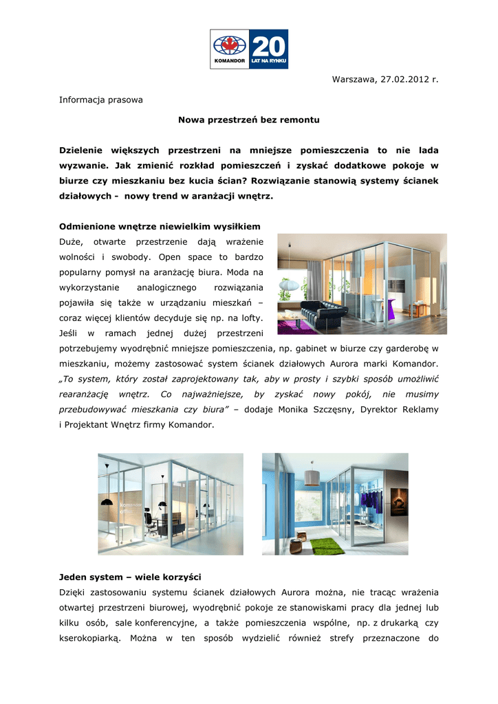 Warszawa, 27.02.2012 r. Informacja prasowa Nowa przestrzeń bez remontu Dzielenie większych przestrzeni na mniejsze pomieszczenia to nie lada wyzwanie. Jak zmienić rozkład pomieszczeń i zyskać dodatkowe pokoje w biurze czy mieszkaniu bez kucia ścian? Rozwiązanie stanowią systemy ścianek działowych - nowy trend w aranŜacji wnętrz. Odmienione wnętrze niewielkim wysiłkiem DuŜe, otwarte przestrzenie dają wraŜenie wolności i swobody. Open space to bardzo popularny pomysł na aranŜację biura. Moda na wykorzystanie analogicznego rozwiązania pojawiła się takŜe w urządzaniu mieszkań – coraz więcej klientów decyduje się np. na lofty. Jeśli w ramach jednej duŜej przestrzeni potrzebujemy wyodrębnić mniejsze pomieszczenia, np. gabinet w biurze czy garderobę w mieszkaniu, moŜemy zastosować system ścianek działowych Aurora marki Komandor. „To system, który został zaprojektowany tak, aby w prosty i szybki sposób umoŜliwić rearanŜację wnętrz. Co najwaŜniejsze, by zyskać nowy pokój, nie musimy przebudowywać mieszkania czy biura” – dodaje Monika Szczęsny, Dyrektor Reklamy i Projektant Wnętrz firmy Komandor. Jeden system – wiele korzyści Dzięki zastosowaniu systemu ścianek działowych Aurora moŜna, nie tracąc wraŜenia otwartej przestrzeni biurowej, wyodrębnić pokoje ze stanowiskami pracy dla jednej lub kilku osób, sale konferencyjne, a takŜe pomieszczenia wspólne, np. z drukarką czy kserokopiarką. MoŜna w ten sposób wydzielić równieŜ strefy przeznaczone do odpoczynku, magazyny do przechowywania zapasów artykułów biurowych lub innych materiałów. W mieszkaniach moŜna w ten sposób stworzyć garderobę, pokój zabaw, miejsce do spania, kącik do pracy, a takŜe oddzielić kuchnię od salonu. Ściany w systemie Aurora mogą być transparentne, by do wydzielonych segmentów docierało światło dzienne oraz by utrzymać optyczne wraŜenie przestronności pomieszczenia lub matowe, jeśli pokój ma zapewniać większą prywatność. Uniwersalność systemu Aurora pozwala zastosować w ściankach dodatkowe akcesoria jak na przykład Ŝaluzje do zasłonięcia szyb. Istnieje takŜe moŜliwość zastosowania drzwi uchylnych czy przesuwnych. Dodatkowo w profilach ścianek moŜna zamontować przewody elektryczne oraz gniazdka i przełączniki. Obok funkcjonalności, zaletą systemu Aurora jest łatwość i szybkość montaŜu, a bezpieczeństwo uŜytkowania gwarantuje uzyskana Europejska Aprobata Techniczna. System Aurora to propozycja dla osób ceniących prostotę i wygodę. Modne połączenie szklanych i metalowych elementów nadaje mu lekkości i nowoczesności. Nowatorski design doskonale się sprawdzi zarówno w biurach, jak i prywatnych mieszkaniach i loftach. Informacje dodatkowe Targi BUDMA 2012 System ścian działowych „Aurora” firmy Komandor po raz pierwszy został zaprezentowany na Międzynarodowych Targach Budownictwa BUMDA 2012 w Poznaniu, naleŜące do najwaŜniejszych spotkań biznesowych dla branŜy budowlanej w tej części Europy. Tegoroczne targi odbywały się pod hasłem „Budownictwo przyszłości”. Tematy przewodnie obejmowały budownictwo energooszczędne, ekologiczne, bezpieczne a zarazem funkcjonalne. W te trendy doskonale wpisała się firma Komandor, prezentując na swoim stoisku efektowną aranŜację najnowszego systemu ścianek działowych Aurora. Budowa systemu Szkielet systemu składa się z profili aluminiowych nośnych oraz wypełnienia ze szkła bezpiecznego od 4 do 6 mm lub szyby zespolonej. Ścianki działowe mogą być projektowane jako stałe bądź przesuwne. Ich maksymalna wysokość wynosi 3m, a szerokość 1 panelu 1,1 m. Ścianki wypełniają całą przestrzeń między podłogą a sufitem. W celu zwiększenia uŜyteczności wydzielonych pomieszczeń panele moŜna łączyć pod róŜnymi kątami tworząc atrakcyjny układ ścian. W przypadku wysokich pomieszczeń istnieje moŜliwość montaŜu systemu do sufitu podwieszanego. UmoŜliwiają to specjalne uchwyty, gwarantujące pewne i trwałe mocowanie profili górnych. Odległość między sufitem a stropem powinna mieć maksimum 60cm, a minimum 11,5 cm. System mocowania nie wymaga dodatkowych prac budowlanych. Firma Komandor S.A. powstała w 1992 roku. Od 20 lat jest liderem branŜy systemów do drzwi przesuwnych i zabudowy wnętrz. Poprzez rozbudowaną sieć autoryzowanych podmiotów firma świadczy usługi projektowania i montaŜu swoich produktów w oparciu o autorski program Designer do projektowania zabudów. Komandor w swojej ofercie posiada szeroką gamę nowatorskich produktów i rozwiązań konstrukcyjnych umoŜliwiając klientom aranŜację przestrzeni mieszkalnej według własnych potrzeb. Produkty marki Komandor to wysoka jakość i styl udokumentowane wymaganymi przez standardy europejskie atestami i certyfikatami oraz docenione w 53 krajach na świecie Więcej informacji: http://www.komandor.pl/ Kontakt dla mediów: Anna Zając Triple PR Ul. Leszno 8/28; 01-192 Warszawa tel. 022 216 54 14, kom. 722100505 [email protected], Zdjęcia: przedruk do publikacji prasowych bezpłatnie z podpisem: Fot. Komandor, system ścian działowych Aurora