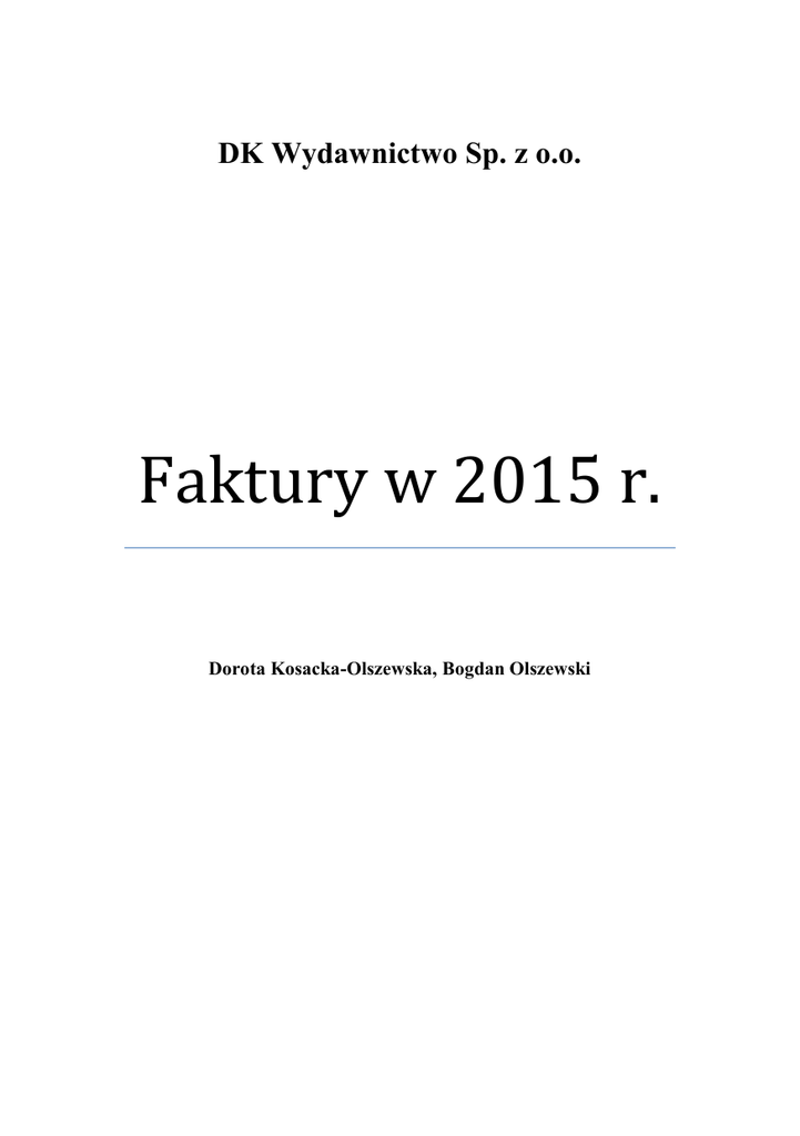 DK Wydawnictwo Sp. z o.o. Faktury w 2015 r. Dorota Kosacka-Olszewska, Bogdan Olszewski Projekt okładki: Agnieszka Puczkielewicz © Copyright by DK Wydawnictwo Spółka z o.o., Białystok 2015 ISBN 978-83-64227-11-0 Wydawca: DK Wydawnictwo Spółka z o.o. ul. Broniewskiego 4 lok 209, 15-792 Białystok tel./fax (85) 831-13 30 lub (85) 831 13 31 e-mail: [email protected] DRUK: BookPress.eu ul. Struga 2 10-270 Olsztyn www.kosacka.pl SPIS TREŚCI WSTĘP....................................................................................................17 ROZDZIAŁ I OBOWIĄZEK WYSTAWIANIA FAKTUR ..............21 1. DEFINICJA FAKTURY I FAKTURY ELEKTRONICZNEJ ....... 21 2. PODMIOTY OBOWIĄZANE DO WYSTAWIANIA FAKTUR . 22 2.1.Obowiązek wystawienia faktur przez podatników czynnych i zwolnionych ............................................................................... 22 2.2.Podatnicy VAT czynni a wystawienie faktur w przypadku sprzedaży zwolnionej ................................................................... 23 2.3.Usługi pośrednictwa ubezpieczeniowego a obowiązek wystawienia faktury ..................................................................... 24 2.4.Obowiązek wystawienia faktury przez rolników .................... 25 3. RODZAJ CZYNNOŚCI LUB NABYWCY .................................. 26 A OBOWIĄZEK WYSTAWIENIA FAKTURY .............................. 26 3.1.Przypadki, gdy podatnik ma obowiązek wystawienia faktury 26 3.2.Wystawianie faktur osobom fizycznym nieprowadzącym działalności gospodarczej ............................................................ 27 3.3.Faktury dla rolników ryczałtowych ........................................ 29 3.4.Sprzedaż dla podatników zwolnionych a obowiązek wystawienia faktury ..................................................................... 29 3.5.Faktury na rzecz innych podmiotów ...................................... 30 3.6.Obowiązek wystawiania faktur - zestawienie ......................... 31 3.7.Sprzedaż wysyłkowa z terytorium kraju i wewnątrzwspólnotowa dostawa towarów .................................. 31 3.8.Zaliczki i przedpłaty a obowiązek wystawienia faktury ......... 32 4. FAKTURY NA ŻĄDANIE ........................................................... 36 4.1.Przypadki, gdy należy wystawić fakturę na żądanie .............. 36 4.2.Zgłoszenie po terminie żądania wystawienia faktury ............. 38 4.3.Sprzedaż dokonana przez rolnika ryczałtowego a żądanie wystawienia faktury ..................................................................... 39 5. ZASADY WYSTAWIANIA FAKTUR W PRZYPADKU CZYNNOŚCI, O KTÓRYCH MOWA W ART. 19A UST. 5 PKT 4 USTAWY VAT 40 6. OBOWIĄZEK WYSTAWIENIA FAKTURY W WEWNĄTRZWSPÓLNOTOWEJ DOSTAWIE TOWARÓW .......................... 44 7. FAKTURY OBOWIĄZKOWE, NA ŻĄDANIE I BRAK OBOWIĄZKU WYSTAWIENIA FAKTURY – ZESTAWIENIE ...... 45 8. OBOWIĄZEK WYSTAWIANIA FAKTUR PRZEZ PODATNIKÓW ZWOLNIONYCH Z VAT ................................ 46 9. BRAK OBOWIĄZKU WYSTAWIENIA FAKTURY A KONIECZNOŚĆ WYSTAWIENIA RACHUNKU ................. 48 10. MIEJSCE DOKONYWANIA CZYNNOŚCI A OBOWIĄZEK WYSTAWIANIA FAKTUR........................................................ 50 10.1.Ustawodawstwo mające zastosowanie do faktur ................. 50 10.2.Miejsce opodatkowania a obowiązek wystawienia faktury .. 53 10.3.Usługi telekomunikacyjne, nadawcze i elektroniczne dla konsumentów z innych krajów UE a zasady wystawiania faktur od 1 stycznia 2015 r. ......................................................................... 54 11. PODMIOT WYSTAWIAJĄCY FAKTURĘ ............................... 56 11.1.Podmiot sporządzający fakturę ............................................ 56 11.2.Samodzielne wystawienie faktury przez podatnika .............. 57 11.3.Samofakturowanie................................................................ 57 11.3.1.Możliwość samofakturowania transakcji przez nabywcę .......... 57 11.3.2.Samofakturowanie a transakcje opodatkowane w kraju trzecim 59 11.3.3.Samofakturowanie w wyjaśnieniach Komisji Europejskiej ... 60 11.4.Wystawienia faktur przez upoważnione osoby trzecie....... 60 11.5.Faktury wystawiana przez komornika i organy egzekucyjne 61 12.FAKTURY WEWNĘTRZNE ...................................................... 62 12.1.Brak obowiązku wystawiania faktur wewnętrznych ............. 62 12.2.Likwidacja faktur wewnętrznych a sposób dokumentowania wybranych czynności ................................................................... 63 ROZDZIAŁ II TERMIN WYSTAWIANIA FAKTUR W 2015R. ....65 1.TERMINY WYSTAWIANIA FAKTUR - ZASADY OGÓLNE ... 65 2.USŁUGI BUDOWLANE I BUDOWLANO-MONTAŻOWE TERMIN WYSTAWIENIA FAKTUR ........................................ 67 2.1.Zasady wystawiania faktur na usługi budowlane i budowlanomontażowe ................................................................................... 67 2.2.Usługi budowlane i budowlano-montażowe świadczone na rzecz podatników.......................................................................... 67 2.3.Zaliczka na usługi budowlane otrzymana od podatnika ........ 70 2.4. Data wykonania usługi budowlanej a data wystawienia faktury .......................................................................................... 74 2.5.Usługi budowlane i budowlano-montażowe na rzecz niepodatników .............................................................................. 75 2.6.Usługi budowlane i budowlano-montażowe - moment powstania obowiązku podatkowego i termin wystawienia faktury77 3.DOSTAWA KSIĄŻEK, GAZET I CZASOPISM - TERMIN WYSTAWIENIA FAKTUR ........................................................ 78 3.1.Dostawa drukowanych książek, gazet i czasopism na rzecz podatników ................................................................................... 78 3.2.Dostawa drukowanych książek dla niepodatników ................ 82 3.3.Wewnątrzwspólnotowa dostawa książek ..