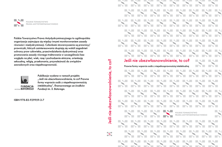Polskie Towarzystwo Prawa Antydyskryminacyjnego to ogólnopolska organizacja zajmująca się między innymi monitorowaniem zasady równości i niedyskryminacji. Członkami stowarzyszenia są prawnicy/ prawniczki, których zainteresowania skupiają się wokół zagadnień ochrony praw człowieka, przeciwdziałania dyskryminacji oraz promowania zasady równego traktowania w szczególności bez względu na płeć, wiek, rasę i pochodzenie etniczne, orientację seksualną, religię, przekonania, przynależność do związków zawodowych oraz niepełnosprawność. Publikacja wydana w ramach projektu „Jeśli nie ubezwłasnowolnienie, to co? Prawne formy wspracia osób z niepełnosprawnością intelektualną”, finansowanego ze środków Fundacji im. S. Batorego. ISBN 978-83-929959-3-7 Jeśli nie ubezwłasnowolnienie, to co? POLSKIE TOWARZYSTWO PRAWA ANTYDYSKRYMINACYJNEGO Jeśli nie ubezwłasnowolnienie, to co? Prawne formy wsparcia osób z niepełnosprawnością intelektualną POLSKIE TOWARZYSTWO PRAWA ANTYDYSKRYMINACYJNEGO Jeśli nie ubezwłasnowolnienie, to co? Prawne formy wsparcia osób z niepełnosprawnością intelektualną pod redakcją Karoliny Kędziory Warszawa 2012 Publikacja została dofinansowana ze środków Fundacji im. Stefana Batorego Spis treści © Polskie Towarzystwo Prawa Antydyskryminacyjnego, 2012 Wydanie I, Warszawa 2012 005 Wprowadzenie dr Małgorzata Szaroczyńska Redakcja: Karolina Kędziora Korekta: Kaja Żurawek Okładka, projekt typograficzny, skład i łamanie: Dodo Design 015 Ubezwłasnowolnienie i alternatywne formy pomocy w realizowaniu zdolności do czynności prawnych osób z niepełnosprawnością intelektualną w regulacjach międzynarodowych oraz w prawie obcym, na przykładzie Estonii, Niemiec, Szwecji,Wielkiej Brytanii i Kanady (stanu Manitoba) dr Małgorzata Szeroczyńska 063 Ubezwłasnowolnienie i inne formy wsparcia dla osób z niepełnosprawnością intelektualną w Polsce – teoria i praktyka dr Roman Grzejszczak, dr Małgorzata Szeroczyńska Polskie Towarzystwo Prawa Antydyskryminacyjnego ul. Gałczyńskiego 7/6 00-362 Warszawa tel. +48 22 498 15 27 www.ptpa.org.pl 107 Założenia uregulowania w polskim prawie instytucji asystenta prawnego osoby z niepełnosprawnością intelektualną lub psychospołeczną dr Irena Kleniewska, dr Małgorzata Szeroczyńska 135 Komentarz 1. dr Leszek Kociucki 157 Komentarz 2. prof. dr hab. Anna Firkowska-Mankiewicz Wszelkie prawa zastrzeżone. Wykorzystywanie zawartych w publikacji tekstów, zarówno w całości jak i we fragmentach, stanowi naruszenie praw autorskich i jest karalne. Dotyczy to również tłumaczenia, powielania, wykonywania mikrofilmów i reprodukowania metodami elektronicznymi. ISBN 978-83-929959-3-7 Wprowadzenie 7 dr Małgorzata Szeroczyńska Wprowadzenie Niniejsze opracowanie stanowi podsumowanie wniosków, płynących z działań w ramach projektu „Jeśli nie ubezwłasnowolnienie, to co? Prawne formy wsparcia osób z niepełnosprawnością intelektualną” realizowanego przez Polskie Towarzystwo Prawa Antydyskryminacyjnego i finansowanego przez Fundację Batorego w okresie od czerwca 2010 r. do maja 2012 r. Celem projektu było przygotowanie założeń nowelizacji przepisów polskiego kodeksu cywilnego w kierunku wprowadzenia instytucji ochrony prawnej osób z niepełnosprawnością intelektualną i wspierania podejmowania decyzji. Te rozwiązania zastąpiłyby obecnie obowiązujące regulacje dotyczące ubezwłasnowolnienia. Konieczność wprowadzenia takich nowoczesnych regulacji i uchylenie przestarzałych instytucji, skutkujących ograniczeniem albo nawet odebraniem zdolności do czynności prawnych dużej populacji osób z niepełnosprawnością intelektualną lub psychospołeczną, wynika ze współcześnie dominującego stanowiska, wyrażanego przez organizacje pozarządowe, także międzynarodowe, działające na rzecz osób z niepełnosprawnościami, ale przede wszystkim przez międzynarodowe organizacje praw człowieka, iż każda osoba, także z niepełnosprawnością i to niezależnie od jej rodzaju i stopnia, ma prawo do autonomii. Owo niezbywalne prawo winno być respektowane w każdych okolicznościach zarówno przez władze państwowe jak i osoby trzecie. Najpełniej stanowisko to zostało wyrażone w Konwencji ONZ o Prawach Osób z Niepełnosprawnościami z 2007 r., która w art. 12 zobowiązuje państwa strony do eliminacji nieograniczonego w czasie ubezwłasnowolnienia całkowitego na rzecz adekwatnych do potrzeb osoby z niepełnosprawnością form wspieranego podejmowania decyzji, dopuszczając powoływanie substytuta jedynie w sytuacjach wyjątkowych, gdy osoba z niepełnosprawnością faktycznie jest całkowicie pozbawiona zdolności do podejmowania decyzji, przy czym działanie substytuta ma być ograniczone w czasie i stosowane jedynie do niezbędnych dla danej osoby sfer decyzyjnych. 8 Stanowisko ONZ zostało w pełni poparte przez międzynarodowe organizacje działające na rzecz praw osób z niepełnosprawnością intelektualną. Wyrazem tego może być choćby Stanowisko Inclusion Europe (europejskiej organizacji zrzeszającej organizacje działające na rzecz osób z niepełnosprawnością intelektualną) przyjęte na Zgromadzeniu Ogólnym w 2008 r. pt. „Kluczowe elementy systemu wspieranego podejmowania decyzji”. W Stanowisku tym Inclusion Europe podkreśla, że osoby z niepełnosprawnością mają być postrzegane jako podmioty prawa zasługujące na sprawiedliwe i równe traktowanie oraz szacunek, niezależnie od rodzaju i stopnia niepełnosprawności. Obowiązek takiego traktowania wymaga, aby każdej osobie z niepełnosprawnością przysługiwała zdolność do czynności prawnych na równi z innymi osobami, co wymaga, by system opieki zawierający w sobie paradygmat podejmowania decyzji za osoby z niepełnosprawnością przez osoby trzecie – opiekunów – został odrzucony na rzecz koncepcji wspieranego podejmowania decyzji, zgodnie z którą os