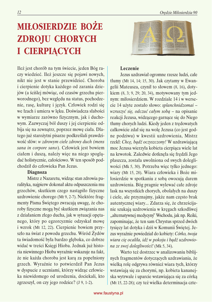 12 Orędzie Miłosierdzia 90 MIŁOSIERDZIE BOŻE ZDROJU CHORYCH I CIERPIĄCYCH Ileż jest chorób na tym świecie, jeden Bóg raczy wiedzieć. Ileż jeszcze się pojawi nowych, nikt nie jest w stanie przewidzieć. Choroba i cierpienie dotyka każdego od zarania dziejów (a ściślej mówiąc, od czasów grzechu pierworodnego), bez względu na status, pochodzenie, rasę, kulturę i język. Człowiek rodzi się we łzach i umiera w lęku. Doświadcza słabości w wymiarze zarówno fizycznym, jak i duchowym. Zazwyczaj ból duszy i jej cierpienie odbija się na zewnątrz, poprzez mowę ciała. Dlatego już starożytni pisarze podkreślali prawdziwość słów: w zdrowym ciele zdrowy duch (mens sana in corpore sano). Człowiek jest bowiem ciałem i duszą, należy więc na niego spoglądać holistycznie, całościowo. W ten sposób podchodził do człowieka Pan Jezus. Diagnoza Mistrz z Nazaretu, widząc stan zdrowia paralityka, najpierw dokonał aktu odpuszczenia mu grzechów, skutkiem czego nastąpiło fizyczne uzdrowienie chorego (Mt 9, 2-7). Niektóre fragmenty Pisma Świętego zwracają uwagę, że choroby fizyczne mogą być skutkiem związania nas z działaniem złego ducha, jak w sytuacji opętanego, który po egzorcyzmie odzyskał mowę i wzrok (Mt 12, 22). Cierpienie bowiem przyszło na świat z powodu grzechu. Wśród Żydów ta świadomość była bardzo głęboka, co dobrze widać w treści Księgi Hioba. Jednak już historia niewinnego Hioba wyraźnie wskazuje na fakt, że nie każda choroba jest karą za popełniony grzech. Wyraźnie to potwierdził Pan Jezus w dyspucie z uczniami, którzy widząc człowieka niewidomego od urodzenia, dociekali, kto zgrzeszył, on czy jego rodzice? (J 9, 1-2). Leczenie Jezus uzdrawiał ogromne rzesze ludzi, całe tłumy (Mt 14, 14; 15, 30). Jak czytamy w Ewangelii Mateusza, czynił to słowem (8, 16), dotykiem (8, 3; 9, 29; 20, 34), motywowany tym jednym: miłosierdziem. W rozdziale 14 i w wersecie 14 użyte zostało słowo: splanchnidzomai – wzruszyć się, odczuć całym sobą – na opisanie reakcji Jezusa, widzącego garnące się do Niego tłumy chorych ludzi. Kiedy jeden z trędowatych całkowicie zdał się na wolę Jezusa (co jest godne podziwu) w kwestii uzdrowienia, Mistrz rzekł: Chcę, bądź oczyszczony! W uzdrawiającą moc Jezusa wierzyła kobieta cierpiąca wiele lat na krwotok. Zaledwie dotknęła się frędzli Jego płaszcza, została uwolniona od swych dolegliwości (Mk 5, 30). Potrzeba więc tylko jednego: wiary (Mt 15, 28). Wiara człowieka i Boże miłosierdzie w spotkaniu z sobą owocują darem uzdrowienia. Bóg pragnie wylewać całe zdroje łask na wszystkich chorych, obolałych na duszy i ciele, ale przyznajmy, jakże nam często brak autentycznej wiary... Zdarza się, że chrześcijanie szukają uzdrowienia w kręgach szkodliwej ,,alternatywnej medycyny” Wschodu, jak np. Reiki, zapominając, że ten sam Chrystus sprzed dwóch tysięcy lat dotyka i dziś w Komunii Świętej. Jezus wyraźnie powiedział do kobiety: Córko, twoja wiara cię ocaliła, idź w pokoju i bądź uzdrowiona ze swej dolegliwości! (Mk 5, 34). Warto też dostrzec w analizowaniu biblijnych fragmentów dotyczących uzdrawiania, że wielką rolę odgrywa również wiara tych, którzy wstawiają się za chorymi, np. kobieta kananejska wytrwale i uparcie wstawiająca się za córką (Mt 15, 22-28); czy też wielka determinacja czte- www.faustyna.pl kwiecień, maj, czerwiec 2014 rech ludzi, którzy aby dotrzeć do Jezusa z paralitykiem, odkryli dach i przez otwór spuścili chorego. To przez wzgląd na ich wiarę Jezus dokonał i duchowego, i fizycznego cudu uzdrowienia (Mk 2, 4-5). Czy jednak celem przyjścia Chrystusa na świat było uzdrowić całą ludzkość z wszelkich chorób? Czy tylko w tym kontekście należałoby rozumieć Boże miłosierdzie jako zdrój chorych i cierpiących? Ma sens, ma sens, ma sens... Jezus zaprosił nas wszystkich, bez wyjątku: Przyjdźcie do Mnie wszyscy, którzy utrudzeni i obciążeni jesteście, a Ja was pokrzepię (Mt 11, 28). Zarazem jednak, w kontekście tych słów padają następne: Weźcie moje jarzmo na siebie i uczcie się ode Mnie, bo jestem cichy i pokorny sercem, a znajdziecie ukojenie dla dusz waszych (Mt 11, 29). Czyż te słowa nie zaskakują? Utrudzonemu, zmęczonemu człowiekowi, Jezus proponuje jeszcze nałożyć na swe ramiona Jego ciężar jako warunek odnalezienia pokoju, szczęścia. Jak rozumieć te słowa Jezusa? Co jest Jego słodkim jarzmem? (Mt 11, 30). Aby odpowiedzieć na to pytanie, powróćmy raz jeszcze do dysputy Mistrza z uczniami na temat niezawinionego cierpienia niewidomego 13 człowieka (J 9, 1-2). Podążając za odpowiedzią Jezusa, dowiadujemy się, że Bóg niekiedy dotyka cierpieniem, by się objawiły sprawy Boże (J 9, 3). Sprawy – greckie słowo: erga – ma szerokie znaczenie, wskazuje na wielkie czyny Boga, na Jego dzieła, które wypływają z miłości do człowieka i mają na celu go zbawić (Ps 107, 21-22; Ps 111, 7). Co było największym zbawczym dziełem Boga? Czyż dzieło odkupienia nie dokonało się właśnie przez cierpienie, na drodze krzyża, właśnie przez ból, od którego tak bardzo ucieka ludzka natura? On wziął na siebie nasze słabości i nosił nasze choroby (Mt 8, 17). Jak zapisał prorok Izajasz: w Jego ranach jest nasze zdrowie (53, 5). Miłosierdzie Boże najpełniej objawiło swoją uzdrawiającą moc na drzewie Krzyża. Czyż Chrystus nie zaprasza nas do wzięcia na siebie Jego jarzma – trudu zdobywania dusz drogą zjednoczenia swego cierpienia z Jego męką? Może dopiero taka postawa człowieka, pragnącego nie tyle uwolnienia od bólu, co ,,wykorzystania cierpienia” dla celów zbawczych, jest warunkiem doznania przez ludzkość autentycznego pokoju i ulgi? s. Maria Faustyna Ciborowska ZMBM POSTANOWIENIE 1. Rozważę słowa: On [Jezus] wziął na siebie nasze słabości i nosił nasze choroby (Iz 53, 4). Dziś odpowiedział mi P