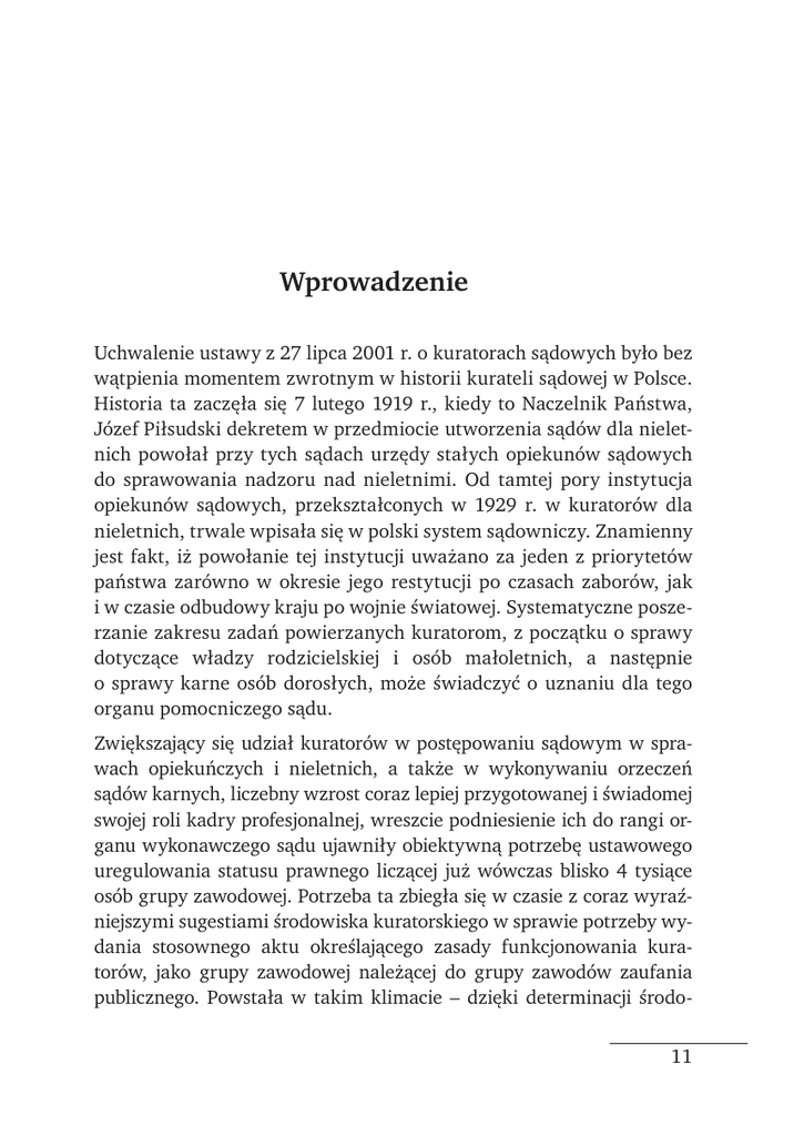 Wprowadzenie Uchwalenie ustawy z 27 lipca 2001 r. o kuratorach sądowych było bez wątpienia momentem zwrotnym w historii kurateli sądowej w Polsce. Historia ta zaczęła się 7 lutego 1919 r., kiedy to Naczelnik Państwa, Józef Piłsudski dekretem w przedmiocie utworzenia sądów dla nielet nich powołał przy tych sądach urzędy stałych opiekunów sądowych do sprawowania nadzoru nad nieletnimi. Od tamtej pory instytucja opiekunów sądowych, przekształconych w 1929 r. w kuratorów dla nieletnich, trwale wpisała się w polski system sądowniczy. Znamienny jest fakt, iż powołanie tej instytucji uważano za jeden z priorytetów państwa zarówno w okresie jego restytucji po czasach zaborów, jak i w czasie odbudowy kraju po wojnie światowej. Systematyczne posze rzanie zakresu zadań powierzanych kuratorom, z początku o sprawy dotyczące władzy rodzicielskiej i osób małoletnich, a następnie o sprawy karne osób dorosłych, może świadczyć o uznaniu dla tego organu pomocniczego sądu. Zwiększający się udział kuratorów w postępowaniu sądowym w spra wach opiekuńczych i nieletnich, a także w wykonywaniu orzeczeń sądów karnych, liczebny wzrost coraz lepiej przygotowanej i świadomej swojej roli kadry profesjonalnej, wreszcie podniesienie ich do rangi or ganu wykonawczego sądu ujawniły obiektywną potrzebę ustawowego uregulowania statusu prawnego liczącej już wówczas blisko 4 tysiące osób grupy zawodowej. Potrzeba ta zbiegła się w czasie z coraz wyraź niejszymi sugestiami środowiska kuratorskiego w sprawie potrzeby wy dania stosownego aktu okreś lającego zasady funkcjonowania kura torów, jako grupy zawodowej należącej do grupy zawodów zaufania publicznego. Powstała w takim klimacie – dzięki determinacji środo 11 Wprowadzenie wiska kuratorskiego i wsparciu parlamentarzystów, sędziów i przedsta wicieli nauki – ustawa oceniana była bardzo pozytywnie. Poseł M. Mar kiewicz – sprawo zdawca projektu tej ustawy na posiedzeniu Sejmu 23 maja 2001 r. tak przedstawiał jego genezę: „był to projekt szczególny dlatego, że przygotowany przez stowarzyszenie kuratorów sądowych, organizację samorządu kuratorskiego, której chwała za to, że ten pro jekt został przygotowany […]. Kuratorzy sądowi, jak mówiłem w trakcie pierwszego czytania, to szczególna grupa zawodowa. Są to ludzie, od których wymaga się wysokich kwalifikacji, którzy wykonują pracę nie słychanie odpowiedzialną, a których pozycja w hierarchii zawodów prawniczych, a szczególnie tych funkcjonujących w wymiarze sprawied liwości, jest od lat nieproporcjonalnie niższa od tej, jaką chciałoby się widzieć”. W ocenie fachowców ustawa postrzegana jest jako dobry akt prawny, wyraz rozsądnego kompromisu potrzeb i oczekiwań środowiska kura torskiego z jednej strony oraz realnych możliwości państwa i jego władzy sądowniczej z drugiej strony. Mimo jej pewnych mankamentów także praktycy, i to zarówno sędziowie, jak i kuratorzy pozytywnie oce niają tę ustawę, którą bez zbytniej przesady można by nazwać konsty tucją zawodu kuratora. Pierwszy komentarz do tej ustawy, autorstwa sędzi dr Krystyny Gromek, został wydany w 2002 r., niemal równo cześnie z wejściem w życie ustawy (doczekał się drugiego wydania w 2004 r.). Ustawę w pewnym zakresie komentowali także jej twórcy A. Martuszewicz i A. Rzepniewski (Ustawa o kuratorach sądowych…). Niniejsza publikacja jest więc trzecią próbą analizy tej ustawy. W od różnieniu od autorów wcześniejszych komentarzy, autorzy niniejszego opracowania nie uczestniczyli w pracach nad ustawą, ale należą do pierwszego pokolenia realizującego i testującego w praktyce jej unor mowania. Niniejszy komentarz różni się od poprzednich także perspek tywą, z której analizowane są poszczególne zapisy ustawy. Jest on na pisany niejako z doświadczenia „bycia kuratorem”, z perspektywy kuratora sądowego na co dzień realizującego swoje zadania służbowe, spotykającego się z konkretnymi problemami w ich realizacji. Niektóre z nich znamy z własnego doświadczenia, inne poznaliśmy, uczestni cząc w pracach Krajowej Rady Kuratorów. Nasze rozważania i analizy 12 www.lexisnexis.pl Wprowadzenie staraliśmy się prowadzić na tle historycznych rozwiązań komentowa nych przepisów. Każdy rozdział komentarza został poprzedzony wpro wadzeniem zawierającym przegląd obowiązujących w przeszłości unormowań analizowanej w nim problematyki. Podejście takie po zwala na uchwycenie ciągłości i zmiany w ewolucji instytucji kurateli sądowej w Polsce. W niniejszym wydaniu uwzględniliśmy wszystkie zmiany legislacyjne mające związek z działalnością kuratorów, które dokonały się w ciągu ostatnich sześciu lat. Dotyczy to w szczególności ustawy o kuratorach sądowych, Kodeksu karnego, Kodeksu karnego wykonawczego, Ko deksu pracy, ustawy o postępowaniu w sprawach nieletnich i ustawy o ustroju sądów powszechnych oraz aktów wykonawczych do tych ustaw. Uwzględniliśmy także wszystkie orzeczenia Sądu Najwyższego odnoszące się do statusu lub funkcjonowania służby kuratorskiej. Zmiany te przyczyniły się do wyjaśnienia wielu niejasności i wątpli wości sygnalizowanych w pierwszym wydaniu, wskutek czego zrezyg nowaliśmy z pewnych fragmentów, w których formułowaliśmy wątpli wości lub postulaty de lege ferenda. Wykorzystaliśmy także nasze doświadczenia z tego okresu z pracy w charakterze kuratora okręgo wego, z działalności opiniodawczej na rzecz Krajowej Rady Kuratorów oraz prac legislacyjnych w komisjach i podkomisjach sejmowych w charakterze ekspertów Krajowej Rady Kuratorów. Książka ta – można powiedzieć – odzwierciedla stan naszej wiedzy na temat kura torskiej służby sądowej na dzień 15 lipca 2014 r. Komentarz adresowany jest przede wszystkim do kuratorów sądo wych i aplikantów kuratorskich, ale także do sędziów, studentów reso cjalizacji i