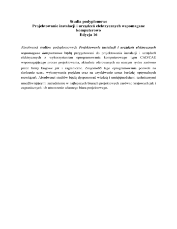 Studia podyplomowe Projektowanie instalacji i urządzeń elektrycznych wspomagane komputerowo Edycja 16 Absolwenci studiów podyplomowych Projektowanie instalacji i urządzeń elektrycznych wspomagane komputerowo będą przygotowani do projektowania instalacji i urządzeń elektrycznych z wykorzystaniem oprogramowania komputerowego typu CAD/CAE wspomagającego proces projektowania, aktualnie oferowanych na naszym rynku zarówno przez firmy krajowe jak i zagraniczne. Znajomość tego oprogramowania pozwoli na skrócenie czasu wykonywania projektu oraz na uzyskiwanie coraz bardziej optymalnych rozwiązań. Absolwenci studiów będą dysponować wiedzą i umiejętnościami technicznymi umożliwiającymi zatrudnienie w najlepszych biurach projektowych zarówno krajowych jak i zagranicznych lub utworzenie własnego biura projektowego.