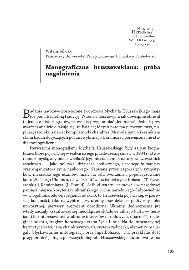 SENSUS HISTORIAE ISSN 2082–0860 Vol. XII (2013/3) s. 129-136 Witalij Telwak Państwowy Uniwersytet Pedagogiczny im. I. Franko w Drohobyczu Monograficzne hruszewskiana: próba uogólnienia B adania naukowe poświęcone twórczości Mychajła Hruszewskiego mają już ponadstuletnią tradycję. W sensie ilościowym, jak dowcipnie określił to jeden z historiografów, zaczynają przypomniać „leniniana”. Jednak przy uważnej analizie okazuje się, że lwia część tych prac ma przyczynkowy, popularyzatorski, a nawet kompilatorski charakter. Miarodajnym wskaźnikiem stanu badań dotyczących postaci wybitnego Ukraińca są poświęcone mu studia monograficzne. Pierwszymi monografiami Mychajła Hruszewskiego były zarysy biograficzne, które pojawiły się w reakcji na jego przedwczesną śmierć w 1934 r., stworzone z myślą, aby oddać wielkość jego niecodziennej natury we wszystkich aspektach — jako polityka, działacza społecznego, uczonego-humanisty oraz organizatora życia naukowego. Napisane przez zagorzałych sympatyków, nierzadko jego uczniów, miały na celu tworzenie i popularyzowanie kultu Wielkiego Ukraińca, na wzór kultów już istniejących: Kobzara (T. Szewczenki) i Kamieniarza (I. Franki). Jeśli ci ostatni zajmowali w narodowej pamięci miejsca koryfeuszy ukraińskiego ruchu narodowego (odpowiednio — w ogólnonarodowej i regionalnej skali), to Hruszewski pojawia się, w pierwszej kolejności, jako najwybitniejszy uczony oraz działacz polityczny doby nowożytnej, pierwszy prezydent odrodzonej Ukrainy. Jednocześnie już wtedy zaczęły kształtować się nieodłączne składowe takiego kultu — heroizm i bezinteresowność w obronie interesów narodowych, ofiarność, rozległość talentu, tragizm końcowego etapu życia i inne. Na tle informacyjnej hermetyczności, jaka charakteryzowała system radziecki, elementy te ulegały błyskawicznej mitologizacji oraz hiperbolizacji. Dla przykładu dość przypomnieć jedną z pierwszych biografii Hruszewskiego autorstwa Iwana 129 Witalij Telwak Krypjakewycza, która w licznych przedrukach i odmianach, była nadzwyczaj popularna w XX w.1 „Heroiczna” tradycja biografistyki hruszewskoznawczej zakończyła się na Ukrainie wraz z ostateczną sowietyzacją ziem ukraińskich w 1939 r., była natomiast kontynuowana już po wojnie w środowisku emigracyjnym za oceanem. Sytuacja w amerykańskich ośrodkach ukrainoznawczych nie sprzyjała wnikliwemu studiowaniu dziedzictwa Hruszewskiego, ponieważ większość emigrantów była ideowymi oponentami przewodniczącego Centralnej Rady, którzy zawzięcie wprawiali się w wyszukiwaniu wciąż nowych zarzutów pod jego adresem. Wymownym przykładem jest znany artykuł Omeliana Pricaka, z okazji stulecia urodzin Hruszewskiego, zawierający bodaj najpełniejszy zbiór pretensji ze strony sympatyków ideologii hetmańskiej i nacjonalistycznej2. Zrozumiałe, że takie hiperkrytyczne stanowisko nie sprzyjało prawdziwej polemice w kręgu akademickim, ale faktycznie było lustrzanym odbiciem studiów hruszewskoznawczych w „heroicznym” nurcie. Wspomniany stuletni jubileusz Hruszewskiego ożywił zaciekawienie jego dorobkiem w kołach emigracyjnych historyków. Część z nich, na czele z Ołeksandrem Ohloblynem i Lubomyrem Wynarem, zapoczątkowała systematyczne studia i zaproponowała nazwę nowej historycznej subdyscypliny — „hruszewskoznawstwo”, której trybuną stało się czasopismo „Ukrajinśkyj istoryk”. Z tego kręgu wyszły pierwsze biografie Hruszewskiego na kontynencie amerykańskim prezentujące czytelnikowi jego postać w pełni „heroicznym” tonie3. Niemniej współpracownicy „Ukrajinśkoho istoryka” zebrali na przestrzeni długiego czasu różnorodny materiał źródłowy, który umożliwił powstanie pierwszych, krytycznych monografii poświęconych autorowi Historii Ukrainy-Rusi. Przede wszystkim należy wymienić pierwszą anglojęzyczną biografię autorstwa Tomasa Prymaka, która pojawiła się pod koniec lat 80. XX w.4 Niepodległość Ukrainy w znaczący sposób wpłynęła na całą humanistykę, a w szczególności na studia poświęcone Hruszewskiemu. Przez ostatnie dwa dziesięciolecia Mychajło Hruszewski pozostawał całkowicie bezkonkurencyjny, jeśli chodzi o ilość opublikowanego materiału źródłowego dotyczącego jego życia i twórczości. Wystarczy wspomnieć chociażby kilka wielotomowych wydań: wznowienia Historii Ukrainy-Rusi, Historii literatury ukraińskiej, Historii powszechnej, serię Epistolarne źródła hruszewskoznawstwa (5 tomów), 1 І. Крип’якевич, Михайло Грушевський. Життя і діяльність, Львів 1935. О. Пріцак, У століття народин М. Грушевського, [w:] Листи до приятелів, Нью-Йорк 1966, nr 5-7, s. 197-230. 2 3 Л. Винар, Найвидатніший історик України Михайло Грушевський (1866–1934). У 50-ліття смерти, Мюнхен 1985. 4 130 T. Prymak, Mykhailo Hrushevsky and Politics of National Culture, Toronto 1983. Monograficzne hruszewskiana: próba uogólnienia Dzienniki, Wspomnienia, liczne zbiory tematyczne materiału archiwalnego i wreszcie dwanaście tomów utworów zebranych w pięćdziesięciu tomach. Wszystko to, rzecz jasna, umożliwiło dokładniejszą i wieloaspektową analizę twórczej biografii znamienitego historyka. Obecnie największa ilość monografii została poświęcona badaniom nad dorobkiem historiograficznym Hruszewskiego, w tym kilka prac dotyczy jego historiozoficznych i metodologicznych poglądów. W porządku chronologicznym wymienić należy książki Witalija Masnenki, w których, na zasadzie analizy porównwczej, historiograficzne idee Hruszewskiego przedstawione są na tle rozwoju ukraińskiej nauki od końca XIX w. do lat 30. XX w.5 O teoretyczno-metodologicznych podstawach poglądów historycznych uczonego do wybuc