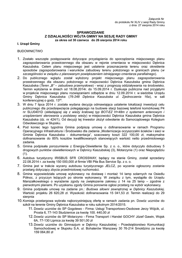 Załącznik Nr do protokołu Nr XLIV z sesji Rady Gminy z dnia 27 sierpnia 2014 roku SPRAWOZDANIE Z DZIAŁALNOŚCI WÓJTA GMINY NA SESJĘ RADY GMINY za okres od 30 czerwca do 26 sierpnia 2014 roku I. Urząd Gminy BUDOWNICTWO 1. Zostało wszczęte postępowanie dotyczące przystąpienia do sporządzenia miejscowego planu zagospodarowania przestrzennego dla obszaru w rejonie cmentarza w miejscowości Dębnica Kaszubska. Celem planu miejscowego jest ustalenie przeznaczenia terenu oraz określenie sposobów zagospodarowania i warunków zabudowy terenu położonego w granicach planu (w szczególności w związku z planowanym powiększeniem istniejącego cmentarza parafialnego). 2. Do publicznego wglądu został wyłożony projekt miejscowego planu zagospodarowania przestrzennego dla obszaru położonego w miejscowości Dębnica Kaszubska gmina Dębnica Kaszubska (Teren „B” – zabudowa przemysłowa) - wraz z prognozą oddziaływania na środowisko. Termin wyłożenia w dniach od 18.08.2014r. do 15.09.2014 r. Dyskusja publiczna nad przyjętymi w projekcie miejscowego planu rozwiązaniami odbędzie w dniu 12.09.2014 r. w siedzibie Urzędu Gminy Dębnica Kaszubska (76-248 Dębnica Kaszubska ul. Zjednoczenia 16a), w sali konferencyjnej o godz. 1300. 3. W dniu 7 lipca 2014 r. została wydana decyzja odmawiająca ustalenie lokalizacji inwestycji celu publicznego dla przedsięwzięcia polegającego na budowie stacji bazowej telefonii komórkowej P4 nr SLU0401D (składającej się z wieży kratowej typ BOT-EZ H=48m z systemem antenowym i urządzeniami sterowania u podstawy wieży) w miejscowości Dębnica Kaszubska gmina Dębnica Kaszubska (dz. nr 424/1). Od decyzji tej Inwestor złożył odwołanie do Samorządowego Kolegium Odwoławczego w Słupsku. 4. Pod koniec tego tygodnia Gmina podpiszę umowę o dofinansowanie w ramach Programu Operacyjnego Infrastruktura i Środowisko dla zadania „Modernizacja oczyszczalni ścieków i sieci w Gminie Dębnica Kaszubska - dokumentacja”, szacowany koszt 322 100,00 zł, maksymalne dofinansowanie do 85% kosztów kwalifikowanych stanowiących wartość netto przedmiotowego zadania. 5. Gmina podpisała porozumienie z Energią-Oświetlenie Sp. z o. o., które dotyczyło dobudowy 5 drogowych punktów oświetleniowych w Dębnicy Kaszubskiej (3), Motarzynie (1) oraz Niepoględziu (1). 6. Autobus turystyczny IRISBUS SFR CROSSWAY, będący na stanie Gminy, został sprzedany 22.08.2014 r. za kwotę 150 000,000 zł firmie VBI Piła Bus Service Sp. z o. o. 7. Gmina jest w trakcie wyceny autobusu turystycznego JELCZ, po wycenie ogłoszony zostanie przetarg dotyczący zbycia przedmiotowej ruchomości. 8. Gmina wypowiedziała umowę wykonawcy na dostawę i montaż 14 lamp solarnych na Osiedlu Północ, z przyczyn leżących po stronie wykonawcy. W związku z tym, wystąpiła do Urzędu Marszałkowskiego o wyrażenie zgody na zwiększenie zakresu z 14 na 25 lamp – zgodnie z pierwotnymi planami. Po uzyskaniu zgody Gmina ponownie ogłosi przetarg na wybór wykonawcy. 9. Gmina podpisała umowę na zadanie pn.: Budowa siłowni zewnętrznej w Dębnicy Kaszubskiej. Wartość projektu 26 620,28 zł. Wysokość dofinansowania 15 041,53 zł. Termin realizacji do 29 sierpnia 10. Komisja przetargowa wybrała najkorzystniejszą ofertę w ramach zadania pn. Dowóz uczniów do szkół na terenie Gminy Dębnica Kaszubska w roku szkolnym 2014/2015. 11. Dowóz uczniów do SP Gogolewo - Firma: Usługi Transportowo-Osobowe Jerzy Wójcik, ul. Prosta 6, 77-143 Studzienice za kwotę 100. 440,00 zł 12. Dowóz uczniów do SP Motarzyno - Firma Transport i Handel GOCHY Józef Gawin, Wojsk 6A, 77-130 Lipnica za kwotę 39 501,00 zł 13. Dowóz uczniów do Gimnazjum w Dębnicy Kaszubskiej - Przedsiębiorstwo Komunikacji Samochodowej w Słupsku S.A. ul. Bohaterów Warszawy 30 76-214 Smołdzino za kwotę 159 064,80 zł 14. Gmina ogłosiła przetarg na zadanie pn.: Budowa nowej stacji uzdatniania wody, nowej studni wraz z niezbędną infrastrukturą techniczną w miejscowości Gogolewo w gminie Dębnica Kaszubska ZAPROJEKTUJ I WYBUDUJ. Zadanie dofinansowane z Agencji Nieruchomości Rolnych. GOSPODARKA GRUNTAMI I OCHRONA ŚRODOWISKA 1. W dniu 18.07.2014 r. postanowiłem nałożyć obowiązek przeprowadzenia oceny oddziaływania na środowisko w sprawie o wydanie decyzji o środowiskowych uwarunkowaniach dla przedsięwzięcia pn. „Budowa trzech elektrowni wiatrowych zlokalizowanych na działkach o nr ew. 124/2, 129/5, 122, 120/6 w obrębie Dobra w gminie Dębnica Kaszubska”. 2. W dniu 18.07.2014 r. zawiesiłem postępowanie w sprawie o wydanie decyzji o środowiskowych uwarunkowaniach dla przedsięwzięcia pn. „Budowa trzech elektrowni wiatrowych zlokalizowanych na działkach o nr ew. 124/2, 129/5, 122, 120/6 w obrębie Dobra w gminie Dębnica Kaszubska” do czasu przedłożenia przez wnioskodawcę raportu o oddziaływaniu przedsięwzięcia na środowisko. 3. Po uzupełnieniu braków we wniosku z dnia 09.06.2014 r. wszcząłem postępowanie na wniosek inwestora w sprawie o wydanie decyzji o środowiskowych uwarunkowaniach dla przedsięwzięcia pn. „zmiana sposobu użytkowania istniejącego magazynu technicznego na budynek obróbki skór surowych norek w SPV Sp. z o. o.” 4. Podałem do publicznej wiadomości wykaz nieruchomości oznaczonej numerem ewidencyjnym 513/1, w Dębnicy Kaszubskiej przeznaczonej do sprzedaży w formie przetargu pisemnego ograniczonego, podmiotom prowadzącym działalność w zakresie leasingu; 5. Dokonano podziału działki 645/6 w Dębnicy Kaszubskiej (stary basen), w wyniku czego powstały dwie działki 645/9 o powierzchni 0,44 ha i działki działki 645/10 o powierzchni 0,0472 ha ( na polepszenie warunków działki sąsiedniej); 6. W dniu 14 sierpnia odbyły się przetargi i rokowania na sprzedaż nieruchomości z zasobu mienia komunalnego. W wyniku rokowań sprzedano dwie działki w obrębie Gogolewo, nad jeziorem Dobrskim INNE 1. W okresie międzysesyjnym wyda