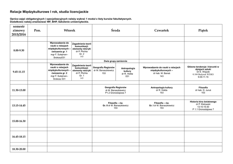 Relacje Międzykulturowe I rok, studia licencjackie Oprócz zajęć obligatoryjnych i specjalizacyjnych należy wybrać 1 moduł z listy kursów fakultatywnych. Dodatkowo należy zrealizować WF, BHP, Szkolenie uniwersyteckie. semestr zimowy 2015/2016 8.00-9.30 9.45-11.15 Pon. Wtorek Środa Czwartek Piątek Wprowadzenie do nauki o relacjach międzykulturowych – dr hab. M. Banaś 143 Główne tendencje i kierunki w dziejach sztuki Dr E. Wiącek 0.104 Budynek WZiKS 9.00-11.15 Wprowadzenie do Zagadnienia teorii nauki o relacjach komunikacji: międzykulturowych – elementy retoryki dr P. Plichta ćwiczenia gr. 1 Gr. 2 mgr F. Sulejman– 143 Srokosz031 Dwie grupy zamiennie Wprowadzenie do Zagadnienia teorii nauki o relacjach Geografia Regionów komunikacji: \ Antropologia międzykulturowych – elementy retoryki dr M. Banaszkiewicz kultury ćwiczenia gr. 2 dr P. Plichta 153 dr R. Hołda Gr. 1 mgr F. Sulejman– 031 143 Srokosz 031 11.30-13.00 Geografia Regionów dr M. Banaszkiewicz P1.2 Gronostajowa 7 Antropologia kultury dr R. Hołda 153 Filozofia dr hab. D. Juruś 153 13.15-14.45 Filozofia – ćw. Gr. II dr M. Banaszkiewicz 153 Filozofia – ćw. Gr. I dr M. Banaszkiewicz 153 Historia kina światowego dr P. Kletowski 13:15-15:30 P 1.1 Gronostajowa 7 15.00-16.30 16.45-18.15 18.30-20.00 Relacje Międzykulturowe II rok, studia licencjackie Czerwony – Specjalizacja: komunikacja międzykulturowa Zielony – Specjalizacja mediacje i praca z mniejszościami Oprócz zajęć obligatoryjnych i specjalizacyjnych należy wybrać 2 moduły z listy kursów fakultatywnych. semestr zimowy 2015/2016 Poniedziałek Wtorek Środa Główne tendencje w dziejach sztuki Dr E. Wiącek 0.104 Budynek WZiKS 9:00 – 11:15 9.45-11.15 11.30-13.00 Kompetencje trenerskie w edukacji międzykulturowej mgr J. Langowska143 13.15-14.45 Relacje międzyreligijne dr P. Plichta 143 Negocjacje w warunkach wielokulturowości dr M. Kołaczek 143 Gender w ujęciu interkulturowym dr E. Wiącek 153 Dzieje nowożytnych relacji międzykulturowych – ćw. dr W. Mazur 143 (co dwa tygodnie) Lektorat j. hiszpańskiego Mgr D'Angelo González Alfonso ul. Kijowska 14 sala 7 14.00-15.00 Lektorat j. angielskiego mgr J. Dudek Armii Krajowej 8, sala 21 Lektorat j. hiszpańskiego Mgr D'Angelo González Alfonso ul. Kijowska 14 sala 7 15:45-17.15 Lektorat j. angielskiego mgr J. Dudek Armii Krajowej 8, sala 21 15.00-16.30 18.30-20.00 Piątek Lektorat j. rosyjskiego mgr T. Rebeta ul. Krupnicza 2, sala 302 8.00-9.30 16.45-18.15 Czwartek Dzieje nowożytnych relacji międzykulturowych Prof. P. Biliński 143 Postawy społeczne w relacjach międzykulturowych dr K. Kosyna – Fuja 031 Międzykulturowe badania porównawcze dr F. Czech 031 Język i kultura dr hab. D. Juruś 031