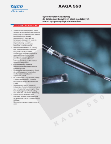 XAGA 550 System os∏ony z∏àczowej do telekomunikacyjnych sieci miedzianych nie utrzymywanych pod ciÊnieniem • • • • • • • • • Termokurczliwa, kompozytowa os∏ona z∏àczowa do klimatycznej i mechanicznej ochrony z∏àczy w telefonicznych sieciach bezciÊnieniowych - do kabli napowietrznych, ziemnych lub kana∏owych, ˝elowanych bàdê nie ˝elowanych, o pow∏okach polietylenowych, o∏owianych, stalowych lub aluminiowych Wielowarstwowa struktura arkuszy typu Rayfort zapewnia doskona∏à odpornoÊç na uszkodzenia mechaniczne podczas instalacji i w czasie póêniejszej eksploatacji Zintegrowana z os∏onà bariera przeciwwilgociowa ca∏kowicie odtwarza struktur´ pow∏oki kabla w obszarze ca∏ego z∏àcza Klej termotopliwy zapewnia wodoszczelne po∏àczenie os∏ony z pow∏okà kablowà Metalowy kanister wewn´trzny chroni oÊrodek kabla przed nara˝eniami mechanicznymi i nadaje mu odpowiedni kszta∏t Po zastosowaniu trójpalczastej klamry z klejem termotopliwym, z ka˝dej strony os∏ony mo˝na wprowadziç do 3 kabli Wbudowane w os∏on´ wskaêniki instalacyjne: farba termochromatyczna na powierzchni arkusza, wyp∏yw kleju termotopliwego na koƒcach os∏ony oraz bia∏e linie przy spince metalowej Szeroki zakres wielkoÊci os∏on umo˝liwia, stosujàc dowolne ∏àczniki ˝y∏, wykonanie z∏àczy o pojemnoÊci do 3600 par Nieograniczony czas magazynowania os∏on 5 X A G A 5 0 XAGA 550 Sk∏ad zestawu XAGA 550 • • • • • • Arkusz termokurczliwy Kanister metalowy (dwucz´Êciowy) Paski aluminiowej folii samoprzylepnej Spinki suwakowe z ∏àcznikiem Zestaw do odga∏´zieƒ Pasek p∏ótna Êciernego • • • • • • Ârodek suszàcy (˝el silikonowy) Folia aluminiowa Chusteczka czyszczàca Przymiar Przewód do ∏àczenia ekranów kabli Instrukcja monta˝owa WielkoÊci os∏on/ Informacje dotyczàce zamawiania (wymiary w tabeli podano w milimetrach) Oznaczenie wyrobu Maks. Êrednica oÊrodka z∏àcza (A) XAGA XAGA XAGA XAGA XAGA XAGA XAGA XAGA XAGA XAGA XAGA XAGA XAGA XAGA XAGA XAGA 550-43/8-200 550-43/8-350 550-43/8-500 550-75/15-250 550-75/15-500 550-75/15-650 550-92/25-300 550-92/25-500 550-92/25-650 550-122/30-300 550-122/30-500 550-122/30-650 550-160/42-500-PO 550-160/42-720 550-200/50-500-PO 550-200/50-720 43 43 43 75 75 75 92 92 92 122 122 122 160 160 200 200 Min. Êrednica Nominalna d∏ugoÊç zewn´trzna kabla (B) oÊrodka z∏àcza (L) 8 8 8 15 15 15 25 25 25 30 30 30 42 42 50 50 200 350 500 250 500 650 300 500 650 300 500 650 500 720 500 720 UWAGA! Rozmiary os∏on oznaczone ...-PO”znajdujà si´ w ciàg∏ej sprzeda˝y u ” dystrybutorów firmy Tyco Electronics Przyk∏ad obliczeƒ dla trzech kabli 40mm Ârednia klamra Ârednia klamra 30mm 20mm * Uwagi dla z∏àczy odga∏´ênych Standardowy zestaw os∏ony XAGA 550 s∏u˝y do wykonywania z∏àczy odga∏´ênych zawierajàcych maksymalnie 2 kable z jednej strony os∏ony. Do wykonania z∏àcza z wi´kszà iloÊcià kabli dla ka˝dego dodatkowego kabla niezb´dny jest dodatkowy zestaw do odga∏´zieƒ (BOKT-5S, 5M lub 5L). Dla z∏àczy z dwoma lub trzema kablami umieszczonymi z jednej strony os∏ony nale˝y obliczyç efektywnà Êrednic´ kabli. Sk∏ad zestawu BOKT do odga∏´zieƒ - Klamra do odga∏´zieƒ Przewód i zacisk do ∏àczenia ekranów kabli Chusteczka czyszczàca Folia aluminiowa Opaska kablowa Informacja na temat doboru/zamawiania zestawu BOKT Oznaczenie zestawu Zakres zastosowaƒ zestawu BOKT-5S-43/8-75/15 BOKT-5M-92/25-125/30 BOKT-5L-160/42-200/50 XAGA 550-43/8-xxx i XAGA 550-75/15-xxx XAGA 550-92/25-xxx i XAGA 550-122/30-xxx XAGA 550-160/42-xxx i XAGA 550-200/50-xxx Ârednica efektywna = 106 mm Do sumy Êrednic kabli nale˝y dodaç 6 mm dla ka˝dej ma∏ej klamry (5S), 8 mm dla ka˝dej Êredniej klamry (5M) lub 10 mm dla ka˝dej du˝ej klamry (5L). W ˝adnym przypadku ca∏kowita Êrednica nie mo˝e przekroczyç maksymalnej Êrednicy oÊrodka z∏àcza - wymiar A” w tabeli (patrz ” rysunek poni˝ej). W podanym przyk∏adzie nale˝y zastosowaç zestaw XAGA 550-122/30-xxx o d∏ugoÊci dobranej do d∏ugoÊci oÊrodka z∏àcza L”. ” * Uwaga dla z∏àczy ˝elowanych (opcja) Mo˝liwy jest zakup specjalnego ˝elu RSS oraz elementów zestawu do wype∏niania oÊrodka z∏àcza, oferowanych jako XAGA-550-xx/xx-xxx-S. Tyco i XAGA sà znakami handlowymi Tyco International. Pokazane tu w celach ilustracyjnych informacje, rysunki i schematy sà wed∏ug nas wiarygodne. Jednak˝e firma Tyco Electronics nie gwarantuje ich dok∏adnoÊci i kompletnoÊci oraz nie bierze na siebie odpowiedzialnoÊci zwiàzanej z ich u˝yciem. Zobowiàzania firmy Tyco Electronics mogà byç jedynie takie, jakie zosta∏y wyspecyfikowane w "Standard Terms and Conditions of Sale" firmy Tyco Electronics dla niniejszego wyrobu i w ˝adnym przypadku firma Tyco Electronics nie b´dzie odpowiedzialna za jakiekolwiek przypadkowe, bezpoÊrednie lub wynikowe uszkodzenia powsta∏e w nast´pstwie sprzeda˝y, odsprzeda˝y, u˝ycia lub nieprawid∏owego u˝ycia tego wyrobu. U˝ytkownicy wyrobów firmy Tyco Electronics powinni sami dokonaç oszacowania w celu okreÊlenia przydatnoÊci ka˝dego takiego wyrobu do konkretnego zastosowania. Tyco Electronics Raychem NV Telecom Outside Plant Diestsesteenweg 692 3010 Kessel-Lo, Belgium Tel.: 32-16-351 011 Fax: 32-16-351 697 www.tycoelectronics.com Raychem Polska Sp. z o.o. Ul. Post´pu 2 02-676 Warszawa Tel.: 48-22- 549 07 20 Fax: 48-22- 549 07 21 [email protected] TC 333/DS/PO/3 10/00