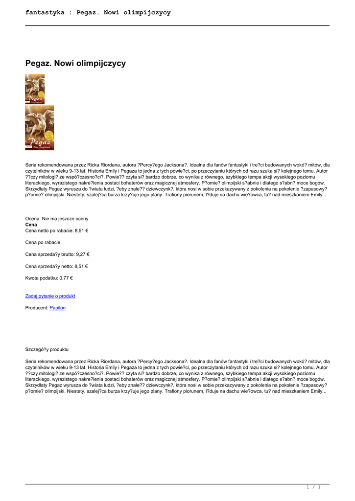 fantastyka : Pegaz. Nowi olimpijczycy Pegaz. Nowi olimpijczycy Seria rekomendowana przez Ricka Riordana, autora ?Percy?ego Jacksona?. Idealna dla fanów fantastyki i tre?ci budowanych wokó? mitów, dla czytelników w wieku 9-13 lat. Historia Emily i Pegaza to jedna z tych powie?ci, po przeczytaniu których od razu szuka si? kolejnego tomu. Autor ??czy mitologi? ze wspó?czesno?ci?. Powie?? czyta si? bardzo dobrze, co wynika z równego, szybkiego tempa akcji wysokiego poziomu literackiego, wyrazistego nakre?lenia postaci bohaterów oraz magicznej atmosfery. P?omie? olimpijski s?abnie i dlatego s?abn? moce bogów. Skrzydlaty Pegaz wyrusza do ?wiata ludzi, ?eby znale?? dziewczynk?, która nosi w sobie przekazywany z pokolenia na pokolenie ?zapasowy? p?omie? olimpijski. Niestety, szalej?ca burza krzy?uje jego plany. Trafiony piorunem, l?duje na dachu wie?owca, tu? nad mieszkaniem Emily... Ocena: Nie ma jeszcze oceny Cena Cena netto po rabacie: 8,51 € Cena po rabacie Cena sprzeda?y brutto: 9,27 € Cena sprzeda?y netto: 8,51 € Kwota podatku: 0,77 € Zadaj pytanie o produkt Producent: Papilon Szczegó?y produktu Seria rekomendowana przez Ricka Riordana, autora ?Percy?ego Jacksona?. Idealna dla fanów fantastyki i tre?ci budowanych wokó? mitów, dla czytelników w wieku 9-13 lat. Historia Emily i Pegaza to jedna z tych powie?ci, po przeczytaniu których od razu szuka si? kolejnego tomu. Autor ??czy mitologi? ze wspó?czesno?ci?. Powie?? czyta si? bardzo dobrze, co wynika z równego, szybkiego tempa akcji wysokiego poziomu literackiego, wyrazistego nakre?lenia postaci bohaterów oraz magicznej atmosfery. P?omie? olimpijski s?abnie i dlatego s?abn? moce bogów. Skrzydlaty Pegaz wyrusza do ?wiata ludzi, ?eby znale?? dziewczynk?, która nosi w sobie przekazywany z pokolenia na pokolenie ?zapasowy? p?omie? olimpijski. Niestety, szalej?ca burza krzy?uje jego plany. Trafiony piorunem, l?duje na dachu wie?owca, tu? nad mieszkaniem Emily... 1 / 1 Powered by TCPDF (www.tcpdf.org)