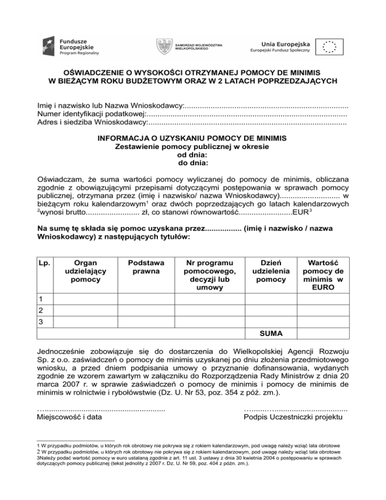 OŚWIADCZENIE O WYSOKOŚCI OTRZYMANEJ POMOCY DE MINIMIS W BIEŻĄCYM ROKU BUDŻETOWYM ORAZ W 2 LATACH POPRZEDZAJĄCYCH Imię i nazwisko lub Nazwa Wnioskodawcy:............................................................................ Numer identyfikacji podatkowej:............................................................................................. Adres i siedziba Wnioskodawcy:............................................................................................ INFORMACJA O UZYSKANIU POMOCY DE MINIMIS Zestawienie pomocy publicznej w okresie od dnia: do dnia: Oświadczam, że suma wartości pomocy wyliczanej do pomocy de minimis, obliczana zgodnie z obowiązującymi przepisami dotyczącymi postępowania w sprawach pomocy publicznej, otrzymana przez (imię i nazwisko/ nazwa Wnioskodawcy)............................ w bieżącym roku kalendarzowym1 oraz dwóch poprzedzających go latach kalendarzowych 2 wynosi brutto......................... zł, co stanowi równowartość.........................EUR 3 Na sumę tę składa się pomoc uzyskana przez................. (imię i nazwisko / nazwa Wnioskodawcy) z następujących tytułów: Lp. Organ udzielający pomocy Podstawa prawna Nr programu pomocowego, decyzji lub umowy Dzień udzielenia pomocy Wartość pomocy de minimis w EURO 1 2 3 SUMA Jednocześnie zobowiązuje się do dostarczenia do Wielkopolskiej Agencji Rozwoju Sp. z o.o. zaświadczeń o pomocy de minimis uzyskanej po dniu złożenia przedmiotowego wniosku, a przed dniem podpisania umowy o przyznanie dofinansowania, wydanych zgodnie ze wzorem zawartym w załączniku do Rozporządzenia Rady Ministrów z dnia 20 marca 2007 r. w sprawie zaświadczeń o pomocy de minimis i pomocy de minimis de minimis w rolnictwie i rybołówstwie (Dz. U. Nr 53, poz. 354 z póź. zm.). …........................................................ Miejscowość i data ….......….................................. Podpis Uczestniczki projektu 1 W przypadku podmiotów, u których rok obrotowy nie pokrywa się z rokiem kalendarzowym, pod uwagę należy wziąć lata obrotowe 2 W przypadku podmiotów, u których rok obrotowy nie pokrywa się z rokiem kalendarzowym, pod uwagę należy wziąć lata obrotowe 3Należy podać wartość pomocy w euro ustalaną zgodnie z art. 11 ust. 3 ustawy z dnia 30 kwietnia 2004 o postępowaniu w sprawach dotyczących pomocy publicznej (tekst jednolity z 2007 r. Dz. U. Nr 59, poz. 404 z późn. zm.).