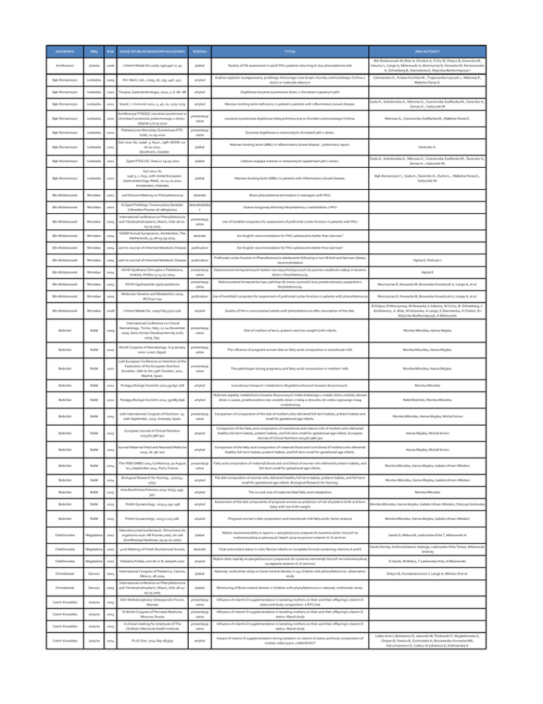 NAZWISKO Amilkiewicz IMIĘ Jolanta ROK 2006 GDZIE OPUBLIKOWANO/WYGŁOSZONO J Inherit Metab Dis 2006; 29(suppl 1): 92 RODZAJ TYTUŁ INNI AUTORZY plakat Quality of life assessment in adult PKU-patients returning to low-phenylalanine diet Bik-Multanowski M, Bilar A, Chrobot A, Cichy W, Didycz B, Gizewska M, Kaluzny L, Lange A, Milanowski A, Mozrzymas R, Nowacka M, Romanowska H, Schneiberg B, Starostecka E, Wojcicka-Bartlomiejczyk I Czkwianianc E., Kolasa-Kicińska M., Trojanowska-Lipczyk J., Makosiej R., Małecka-Panas E. Bąk-Romaniszyn Leokadia 2009 Pol. Merk. Lek., 2009, 26, 155, 446 -451. artykuł Analiza częstości występowania, przebiegu klinicznego oraz terapii choroby Leśniowskiego-Crohna u dzieci w materiale własnym Bąk-Romaniszyn Leokadia 2010 Terapia, Gastroenterologia, 2010, 1, 6. 66 -68 artykuł Dojelitowe leczenie żywieniowe dzieci z chorobami zapalnymi jelit Bąk-Romaniszyn Leokadia 2011 Scand. J. Immunol 2011, 5, 46, 10, 1275-1279 artykuł Mannan-binding lectin deficiency in pediatric patients with inflammatory bowel disease. Szala A., Sokołowska A., Mierzwa G., Czerwionka-Szaflarska M., Swierzko A., Zeman K., Cedzynski M Bąk-Romaniszyn Leokadia 2010 Konferencja PTGEDZ; Leczenie żywieniowe w chorobach przewodu pokarmowego u dzieci . Gdańsk 5-6.03.2010 prezentacja ustna Leczenie żywieniowe dojelitowe dietą polimeryczną w chorobie Leśniowskiego-Crohna. Mierzwa G., Czerwionka-Szaflarska M., Małecka-Panas E. Bąk-Romaniszyn Leokadia 2010 Pediatryczne Warsztaty Żywieniowe PTP, Łódź, 11.09.2010 prezentacja ustna 2011 Gut 2011: 60, suppl. 3, A412 , 19th UEGW, 2226.10.2011, Stockholm, Sweden Bąk-Romaniszyn Bąk-Romaniszyn Leokadia Leokadia plakat Żywienie dojelitowe w nieswoistych chorobach jelit u dzieci. Mannan-binding lectin (MBL) in inflammatory bowel disease - preliminary raport. 2012 Zjazd PTGE DZ, Ossa 17-19.05.2012 plakat Lektyna wiążąca mannan w nieswoistych zapaleniach jelit u dzieci. Gut 2012: 61 supl.3, s. A23, 20th United European Gastroenterology Week, 20-24.10.2012 Amsterdam, Holandia plakat Mannan-binding lectin (MBL) in patients with inflammatory bowel disease. Bąk-Romaniszyn l., Szala A., Świerzko A., Durko Ł., Małecka-Panas E., Cedzyński M. Bąk-Romaniszyn Leokadia 2012 Bik-Multanowski Mirosław 2002 2nd Elsinore Meeting on Phenylketonuria abstrakt Brain phenylalanine elimination in teenagers with PKU 2002 III Zjazd Polskiego Towarzystwa Genetyki Człowieka Poznan 16-18/09/2002 abstrakt/plaka t Ocena mózgowej eliminacji fenyloalaniny u nastolatków z PKU prezentacja ustna Use of handled computers for assessment of prefrontal cortex function in patients with PKU Are English recommendation for PKU-adolescents better than German? Bik-Multanowski Mirosław Swierzko A. Szala A., Sokołowska A., Mierzwa G., Czerwionka-Szaflarska M., Świerzko A., Zeman K., Cedzyński M. Bik-Multanowski Mirosław 2005 International conference on Phenylketonuria and Tetrahydrobiopterin, Miami, USA 28.0205.03.2005 Bik-Multanowski Mirosław 2004 SSIEM Annual Symposium, Amsterdam, The Netherlands, 31.08-03.09.2004 abstrakt Bik-Multanowski Mirosław 2004 sent to Journal of Inherited Metabolic Disease publication Are English recommendation for PKU-adolescents better than German? Nęcka E, Pietrzyk J Bik-Multanowski Mirosław 2004 sent to Journal of Inherited Metabolic Disease publication Prefrontal cortex function in Phenulketonuria-adolescents following in turn British and German dietary recommendation Bik-Multanowski Mirosław 2004 XXVIII Spotkania Chirurgów z Pediatrami, Kraków, Polska 13-14.02.2004 prezentacja ustna Zastosowanie komputerowych testów neuropsychologicznych do pomiaru szybkości reakcji w leczeniu dzieci z fenyloketonurią. Nęcka E 2005 XXVIII Ogólnopolski zjazd pediatrów prezentacja ustna Wykorzystanie komputerów typu palmtop do oceny czynności kory przedczołowej u pacjentów z fenyloketonurią. Mozrzymas R, Nowacka M, Borawska-Kowalczyk U, Lange A, et al. 2005 Molecular Genetics and Metabolism 2005; 86:S142-144 publication Use of handheld computers for assessment of prefrontal cortex function in patients with phenylketonuria Mozrzymas R, Nowacka M, Borawska-Kowalczyk U, Lange A, et al. Bik-Multanowski Bik-Multanowski Mirosław Mirosław Bik-Multanowski Mirosław 2008 J Inherit Metab Dis. 2009 Feb;32(1):126. artykuł Quality of life in noncompliant adults with phenylketonuria after resumption of the diet. B Didycz, R Mozrzymas, M Nowacka, Ł Kałużny, W Cichy, B. Schneiberg, J. Amilkiewicz, A. Bilar, M Giżewska, A Lange, E Starostecka, A Chobot, B I Wójcicka-Bartłomiejczyk, A Milanowski Bobiński Rafał 2009 International Conference on Clinical Neonatology. Torino, Italy, 12-14 November 2009. Early Human Development 85 (10S) 2009, S95. prezentacja ustna Diet of mothers of term, preterm and low-weight-birth infants. Monika Mikulska, Hanna Mojska Bobiński Rafał 2010 World Congress of Neonatology. 6-9 January 2010. Luxor, Egypt. prezentacja ustna The influence of pregnant women diet on fatty acids composition in transitional milk. Monika Mikulska, Hanna Mojska. Bobiński Rafał 2011 11th European Conference on Nutrition of the Federation of the European Nutrition Societies. 26th to the 29th October, 2011. Madrid, Spain. prezentacja ustna The pathologies during pregnancy and fatty acids composition in mothers’ milk. Monika Mikulska, Hanna Mojska. Bobiński Rafał 2012 Postępy Biologii Komórki 2012;39:697-708 artykuł Łożyskowy transport i metabolizm długołańcuchowych kwasów tłuszczowych. Monika Mikulska Rafał Bobiński, Monika Mikulska Bobiński Rafał 2012 Postępy Biologii Komórki 2012; 39:685-696 artykuł Wybrane aspekty metabolizmu kwasów tłuszczowych mleka kobiecego u matek, które urodziły zdrowe dzieci o czasie, przedwcześnie oraz urodziły dzieci z niską w stosunku do wieku ciążowego masą urodzeniową Bobiński Rafał 2013 20th International Congress of Nutrition. 1520th September, 2013. Granada, Spain. pr