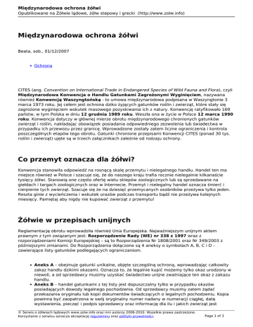 Międzynarodowa ochrona żółwi Opublikowane na Żółwie lądowe, żółw stepowy i grecki (http://www.zolw.info) Międzynarodowa ochrona żółwi Beata, sob., 01/12/2007 Ochrona CITES (ang. Convention on International Trade in Endangered Species of Wild Fauna and Flora), czyli Międzynarodowa Konwencja o Handlu Gatunkami Zagrożonymi Wyginięciem, nazywana również Konwencją Waszyngtońską - to umowa międzynarodowa podpisana w Waszyngtonie 3 marca 1973 roku. Jej celem jest ochrona dziko żyjących gatunków roślin i zwierząt, które stały się zagrożone wyginięciem wskutek masowego pozyskiwania ich z natury. Konwencję ratyfikowało 169 państw, w tym Polska w dniu 12 grudnia 1989 roku. Weszła ona w życie w Polsce 12 marca 1990 roku. Konwencja dotyczy w głównej mierze obrotu międzynarodowego chronionych gatunków zwierząt i roślin, nakładając obowiązek posiadania odpowiedniego zezwolenia lub świadectwa w przypadku ich przewozu przez granicę. Wprowadzone zostały zatem liczne ograniczenia i kontrola poszczególnych etapów tego obrotu. Gatunki chronione przepisami Konwencji CITES (ponad 30 tys. roślin i zwierząt) ujęte są w trzech załącznikach zależnie od rodzaju ochrony. Co przemyt oznacza dla żółwi? Konwencja stanowiła odpowiedź na rosnącą skalę przemytu i nielegalnego handlu. Handel ten ma miejsce również w Polsce i szacuje się, że do naszego kraju trafia rocznie nielegalnie kilkanaście tysięcy żółwi. Stanowią one często ofertę wielu sklepów zoologicznych lub są sprzedawane na giełdach i targach zoologicznych oraz w Internecie. Przemyt i nielegalny handel oznacza śmierć i cierpienie tych zwierząt. Szacuje się że na dziesięć przemycanych osobników przeżywa tylko jeden. Reszta ginie z wycieńczenia i wskutek urazów podczas transportu bądź nie przeżywa kolejnych miesięcy. Pamiętaj aby nigdy nie kupować zwierząt z przemytu! Żółwie w przepisach unijnych Reglamentację obrotu wprowadziła również Unia Europejska. Najważniejszym unijnym aktem prawnym z tym związanym jest: Rozporządzenie Rady (WE) nr 338 z 1997 wraz z rozporządzeniami Komisji Europejskiej – są to Rozporządzenia Nr 1808/2001 oraz Nr 349/2003 z późniejszymi zmianami. Do Rozporządzenia dołączone są 4 aneksy o symbolach A, B, C i D – zawierające listy gatunków podlegających ograniczaniom. Aneks A – obejmuje gatunki unikalne, objęte szczególną ochroną, wprowadzając całkowity zakaz handlu dzikimi okazami. Oznacza to, że legalnie kupić możemy tylko okaz urodzony w niewoli, a od sprzedawcy musimy uzyskać świadectwo unijne zwalniające ten okaz z zakazu handlu. Aneks B – handel gatunkami z tej listy jest dopuszczalny tylko w przypadku okazów posiadających dowody legalnego pochodzenia. Od sprzedawcy musimy zatem żądać przekazania oryginału lub kopii dokumentów świadczących o legalnych pochodzeniu. Kopia powinna być zaopatrzona w swój oryginalny numer nadany w numeracji ciągłej, datę wystawienia, pieczęć i podpis sprzedawcy oraz informację dla ilu i jakich zwierząt jest © Serwis o żółwiach lądowych www.zolw.info oraz inni autorzy 2006-2010. Wszelkie prawa zastrzeżone. Korzystanie z serwisu oznacza akceptację regulaminu oraz polityki prywatności. Page 1 of 3 Międzynarodowa ochrona żółwi Opublikowane na Żółwie lądowe, żółw stepowy i grecki (http://www.zolw.info) wydawana. W polskiej ustawie obowiązek ten wynika wprost z art. 64 ust. 9 w zw. z art. 64 ust. 4 pkt 11. Aneks C – zawiera gatunki, dla których obrót międzynarodowy podlega kontroli na wniosek kraju eksportującego. Aneks D – występuje on jedynie w przepisach Unii Europejskiej i dla potrzeb jej wewnętrznego monitoringu obrotu okazami z aneksów A-C. Gatunki objęte reglamentacją Polskim aktem prawnym, którego zadaniem jest wdrożenie przepisów Konwencji CITES jest ustawa z dnia 16 kwietnia 2004 r. o ochronie przyrody (Dz.U. 2004 nr 92 poz. 880), Niestety ten akt prawny posiada szereg mankamentów, powodujących niespójności i trudności interpretacyjne. Ustawa o ochronie przyrody odwołuje się do przepisów Unii Europejskiej w zakresie gatunków, których przewożenie przez granicę podlega ograniczeniom stanowiąc, że ich przewóz przez granicę wymaga uzyskania zezwolenia ministra właściwego do spraw środowiska (art. 61 ust. 1). Przepisy regulują również różnorodne kwestie związane z uzyskiwaniem odpowiednich zezwoleń na eksport i import. Z kolei przepisy unijne dotyczą wszelkich gatunków objętych Konwencją CITES oraz szeregu gatunków dodatkowych uznanych za zagrożone lub zagrażające przyrodzie europejskiej. Do tej drugiej grupy należy przykładowo żółw czerwonolicy (Trachemys scripta elegans), którego wprowadzanie do europejskich ekosystemów powoduje wypieranie zagrożonego wyginięciem żółwia błotnego (Emys orbicularis). Zakres gatunkowy ochrony w przepisach UE jest zatem szerszy niż w CITES. Ponadto należy mieć na uwadze, że zakazy nie dotyczą wyłącznie żywych okazów, lecz także martwych oraz wszelkich rozpoznawalnych ich części i produktów pochodnych. W aneksach znajdują się wszystkie żółwie lądowe i morskie oraz większość gatunków żółwi słodkowodnych. Żółwie z rodzaju Testudo w Konwencji CITES oraz w Aneksach do Rozporządzenia Rady (WE) nr 338 z 1997 Nazwa Załącznik CITES Aneks Uwagi Żółw stepowy II B W aneksie B ujęta jest (Testudo horsfieldi) łącznie cała rodzina Testudinidae, do której należy m. in. rodzaj Testudo. Żółw mauretański II A Gatunki wyłączone z (Testudo graeca) grupy ujętej w aneksie B. Żółw egipski I A (Testudo kleinmanni) Żółw grecki II A (Testudo hermanni) Żółw obrzeżony II A (Testudo marginata) Żółw egipski Wernera I A (Testudo werneri) Zatem wszystkie żółwie z rodziny Testudinidae w świetle Konwencji oraz przepisów Unii Europejskie są objęte ochroną. Handel tymi gatunkami żółwi tak międzynarodo