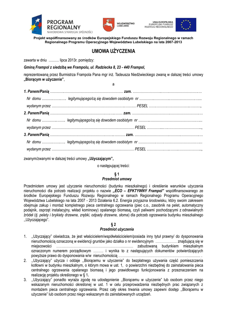 Projekt współfinansowany ze środków Europejskiego Funduszu Rozwoju Regionalnego w ramach Regionalnego Programu Operacyjnego Województwa Lubelskiego na lata 2007-2013 UMOWA UŻYCZENIA zawarta w dniu ……… lipca 2013r. pomiędzy: Gminą Frampol z siedzibą we Frampolu, ul. Radziecka 8, 23 - 440 Frampol, reprezentowaną przez Burmistrza Frampola Pana mgr inż. Tadeusza Niedźwieckiego zwaną w dalszej treści umowy „Biorącym w użyczenie”, a 1. Panem/Panią ………….…………………………………………… zam. ……………………..…….…………………….… Nr domu ……….……..…. legitymującego/cą się dowodem osobistym nr …………..…………..………………….…... wydanym przez ………………………………………………………..……… PESEL …….……….………………..………, 2. Panem/Panią ………………………………………….….…..…… zam. …………………………….…………………….… Nr domu …………..……. legitymującego/cą się dowodem osobistym nr ………..………………………………….…... wydanym przez ……………………………………………………………… PESEL …………....….……………………….., 3. Panem/Panią ………………………………………….……..……… zam. ………………………….……….…………….… Nr domu ……….…….…. legitymującego/cą się dowodem osobistym nr …………….…….……………………….…... wydanym przez ……………………………………………………………… PESEL …………….…..……..……………….., zwanym/zwanymi w dalszej treści umowy „Użyczającym”, o następującej treści: §1 Przedmiot umowy Przedmiotem umowy jest użyczenie nieruchomości (budynku mieszkalnego) i określenie warunków użyczenia nieruchomości dla potrzeb realizacji projektu o nazwie ,,ECO – EFKTYWNY Frampol” współfinansowanego ze środków Europejskiego Funduszu Rozwoju Regionalnego w ramach Regionalnego Programu Operacyjnego Województwa Lubelskiego na lata 2007 - 2013 Działania 6.2. Energia przyjazna środowisku, który swoim zakresem obejmuje zakup i montaż kompletnego pieca centralnego ogrzewania (piec c.o., zasobnik na pelet, automatyczny podajnik, osprzęt instalacyjny, wkład kominowy) opalanego biomasą, czyli paliwami pochodzącymi z odnawialnych źródeł (tj. pelety i brykiety drzewne, zrębki, odpady drzewne, słoma) dla potrzeb ogrzewania budynku mieszkalnego ,,Użyczającego”. §2 Przedmiot użyczenia 1. 2. 3. ,,Użyczający” oświadcza, że jest właścicielem/współwłaścicielem/posiada inny tytuł prawny/ do dysponowania nieruchomością oznaczoną w ewidencji gruntów jako działka o nr ewidencyjnym …………………….. znajdującą się w miejscowości ……………………………………………………………………................. zabudowaną budynkiem mieszkalnym oznaczonym numerem porządkowym ………… i wynika to z następujących dokumentów potwierdzających powyższe prawo do dysponowania w/w nieruchomością ………………………………………………………………………..................... . ,,Użyczający” użycza i oddaje ,,Biorącemu w użyczenie” do bezpłatnego używania część pomieszczenia kotłowni w budynku mieszkalnym, o którym mowa w ust. 1, o powierzchni niezbędnej do zainstalowania pieca centralnego ogrzewania opalanego biomasą i jego prawidłowego funkcjonowania z przeznaczeniem na realizację projektu określonego w § 1. ,,Użyczający” ponadto wyraża zgodę na udostępnienie ,,Biorącemu w użyczenie” lub osobom przez niego wskazanym nieruchomości określonej w ust. 1 w celu przeprowadzenia niezbędnych prac związanych z montażem pieca centralnego ogrzewania. Przez cały okres trwania umowy zapewni dostęp ,,Biorącemu w użyczenie” lub osobom przez niego wskazanym do zainstalowanych urządzeń. Projekt współfinansowany ze środków Europejskiego Funduszu Rozwoju Regionalnego w ramach Regionalnego Programu Operacyjnego Województwa Lubelskiego na lata 2007-2013 4. Wydanie przedmiotu użyczenia nastąpi z dniem podpisania niniejszej umowy. Stan określający przedmiot użyczenia zostanie opisany protokołem przekazania spisanym pomiędzy ,,Użyczającym”, a wykonawcą pieca centralnego ogrzewania przed jego montażem. §3 Cel użyczenia ,,Biorący w użyczenie” zapewnia, że: 1) będzie używał przedmiotu użyczenia zgodnie z jego przeznaczeniem. 2) bez zgody ,,Użyczającego” nie odda go w użyczenie osobie trzeciej. §4 Okres użyczenia 1. Umowa zostaje zawarta na czas określony od dnia podpisania umowy do dnia 30 listopada 2019r. 2. W przypadku zmiany harmonogramu realizacji projektu o nazwie ,,ECO – EFKTYWNY Frampol” niniejsza umowa ulega automatycznemu przedłużeniu do upływu 5 lat od dnia zatwierdzenia końcowego raportu z realizacji projektu określonego w § 1. §5 Warunki rozwiązania umowy 1. Umowa użyczenia ulega rozwiązaniu ze skutkiem natychmiastowym w następujących przypadkach: 1) gdy nie dojdzie do podpisania umowy o dofinansowanie projektu określonego w § 1, 2) rozwiązania umowy dotyczącej zobowiązań organizacyjnych i finansowych związanych z montażem i eksploatacją pieca centralnego ogrzewania zawartej pomiędzy tymi samymi stronami. 2. W przypadku rozwiązania niniejszej umowy przez ,,Użyczającego”, dokona on zwrotu nakładów poniesionych przez ,,Biorącego w użyczenie” wg zasad określonych w umowie dotyczącej zobowiązań organizacyjnych i finansowych związanych z montażem i eksploatacją pieca centralnego ogrzewania zawartej pomiędzy tymi samymi stronami. 3. Postanowienia ust. 2 mają zastosowanie w przypadku zbycia nieruchomości, jeśli nabywca lub następca prawny nie wstąpi w prawa strony niniejszej umowy w miejsce 